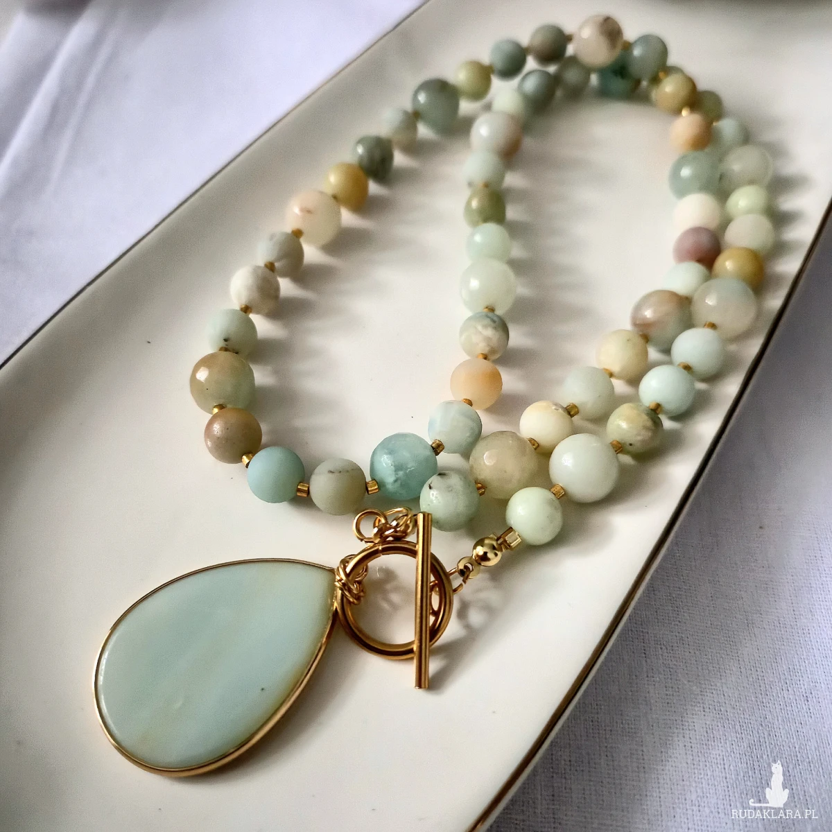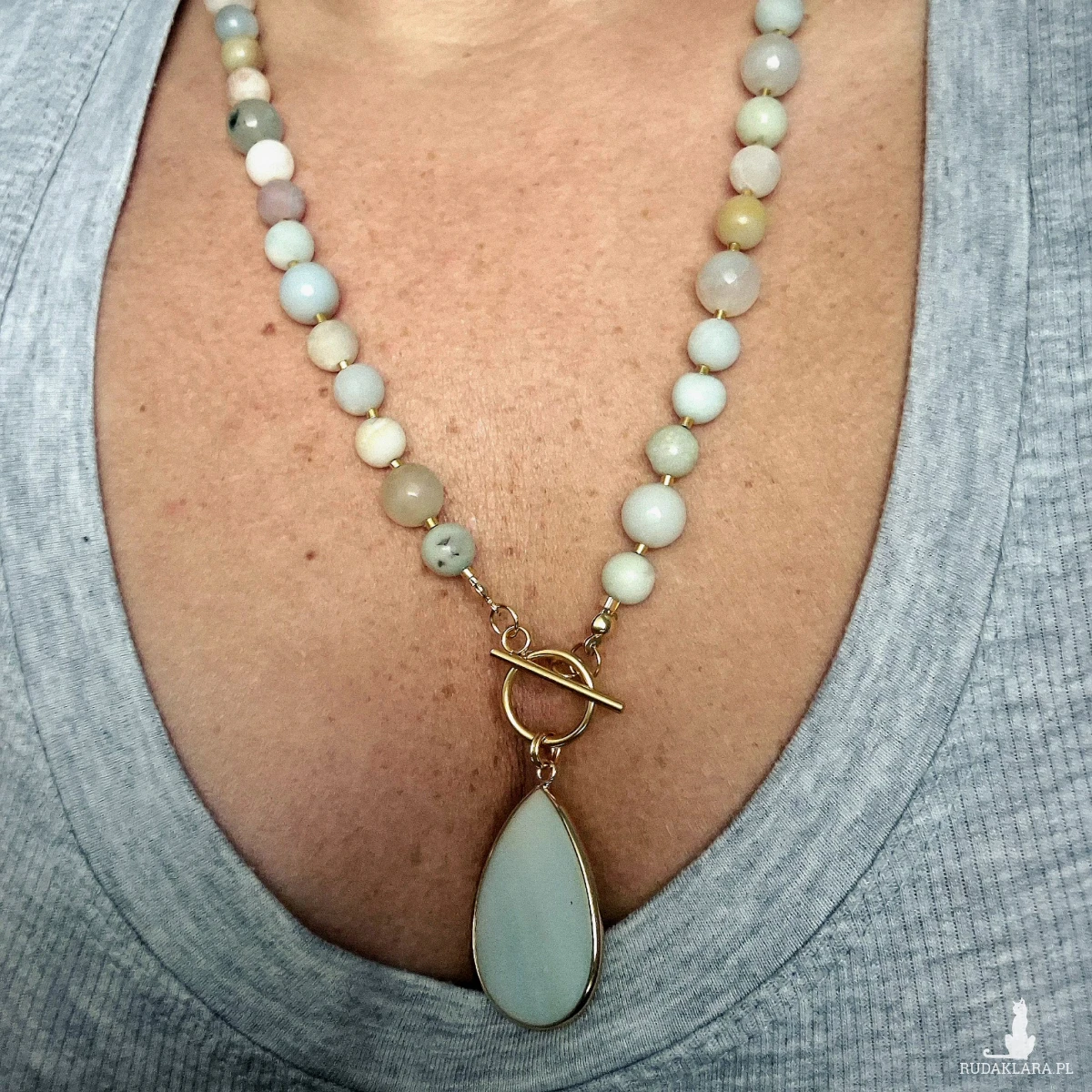 Kamienie użyte w naszyjniku to amazonit i jadeit, zarówno o matowym wykończeniu jak i błyszczącym, gładkie i fasetowane. Pomiędzy kamieniami znajdują się szklane koraliki. Poszczególne kombinacje mogą się minimalnie różnić od siebie, co jest naturalne dla kamieni naturalnych- nie ma dwóch identycznych.