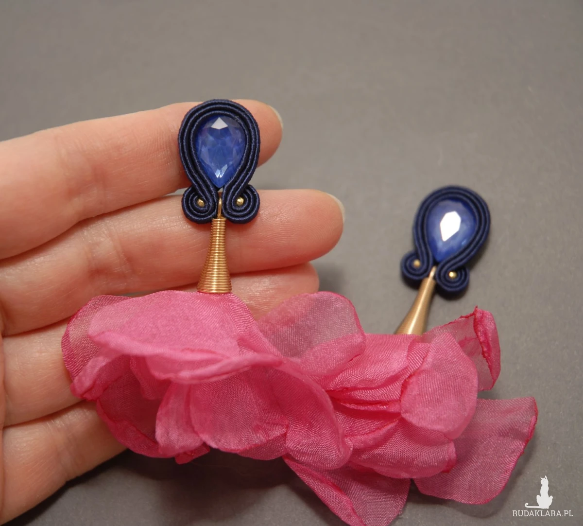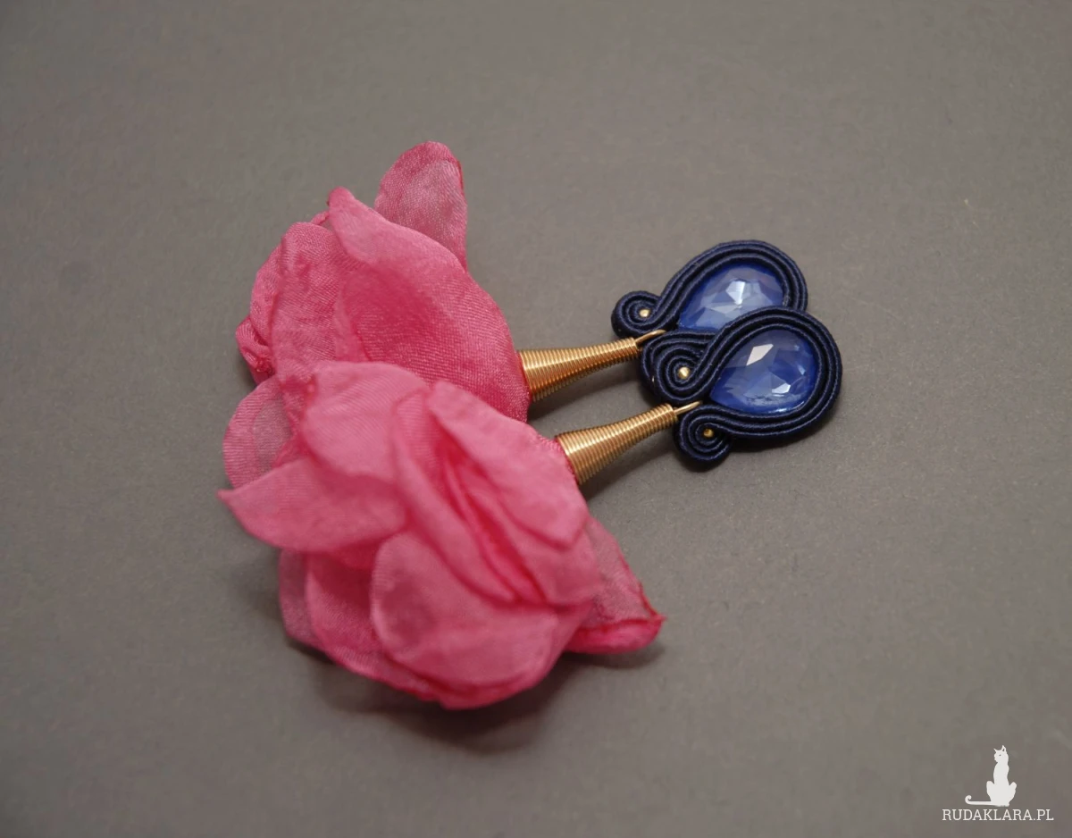 oferuję kolczyki (sztyfty) lub klipsy zrobione techniką sutasz, ozdobione fasetowanymi szklanymi kaboszonami i kwiatkami z materiału