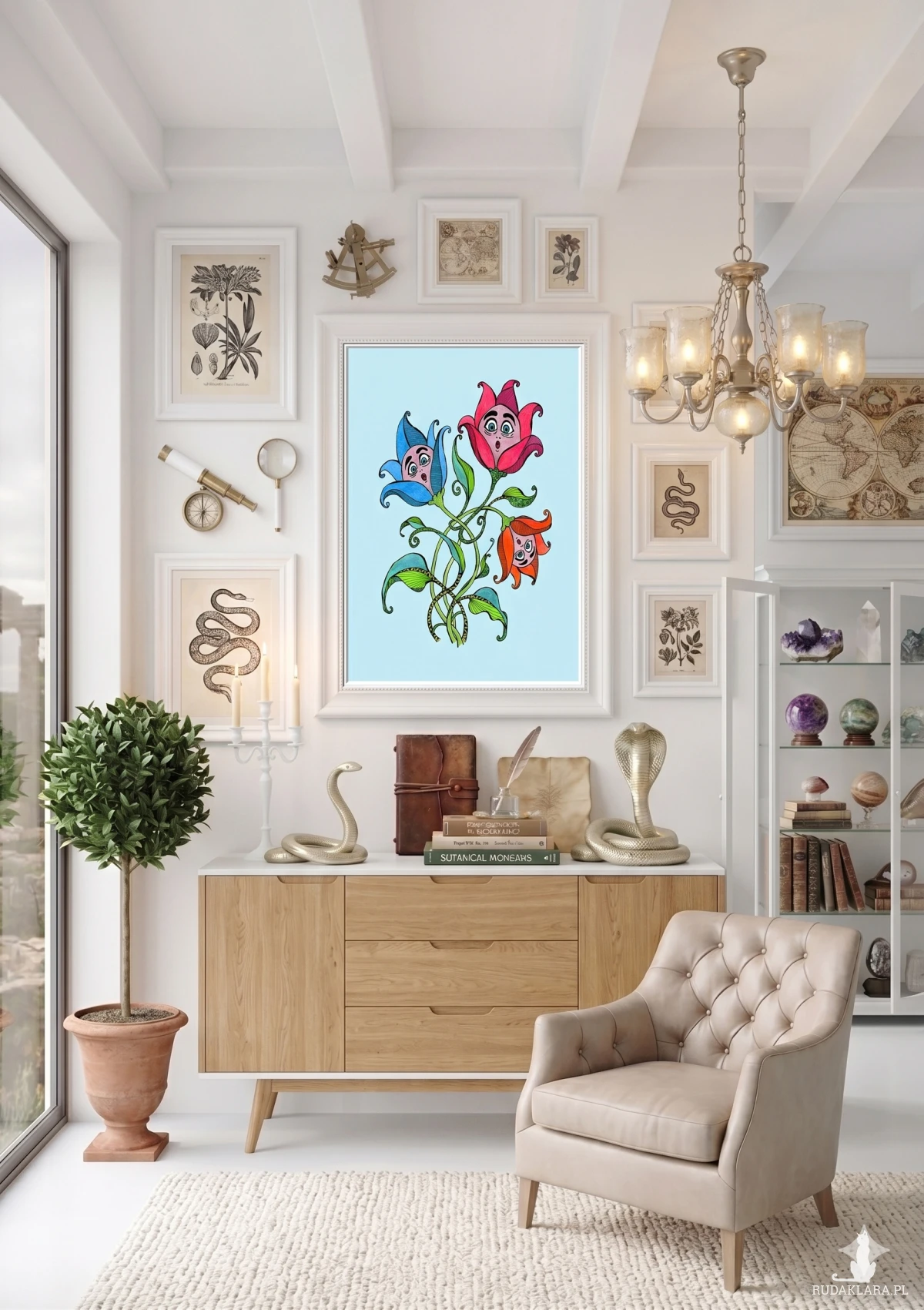 Kielichy kwiatów skrywają twarze zastygłe w grymasie zdumienia, co nadaje całości komiksowego i fantastycznego charakteru.