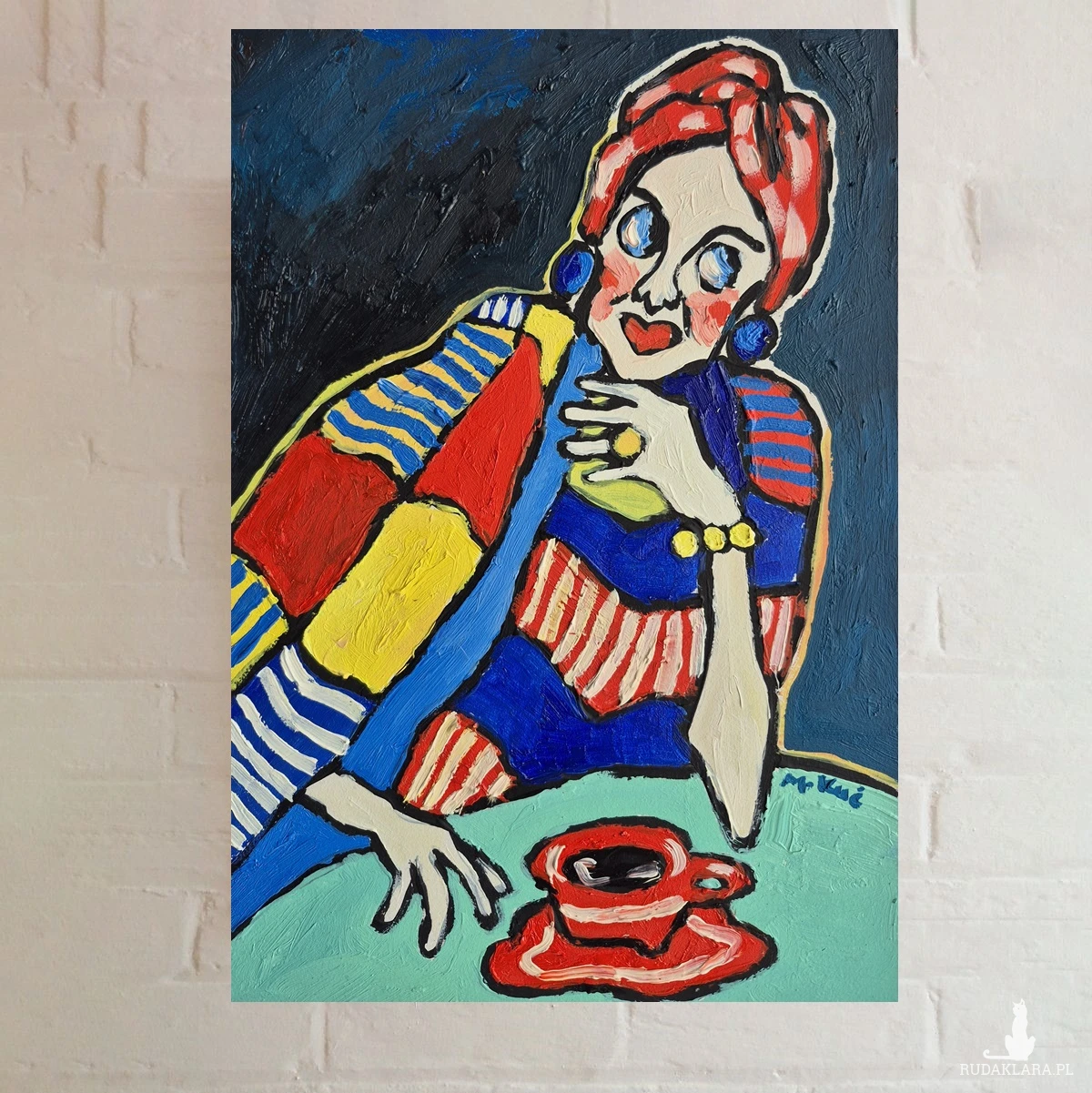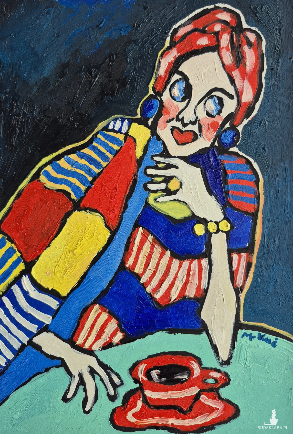 Twarz kobiety jest uproszczona, wręcz deformowana: duże oczy, wyraźnie zaznaczone usta, mocne rumieńce. To nie portret realistyczny, lecz interpretacja – być może bardziej psychologiczna niż fizyczna. Czerwona chusta na głowie i duże, niebieskie kolczyki dodają jej charakteru, przywołując skojarzenia z modą retro albo stylizacją teatralną.