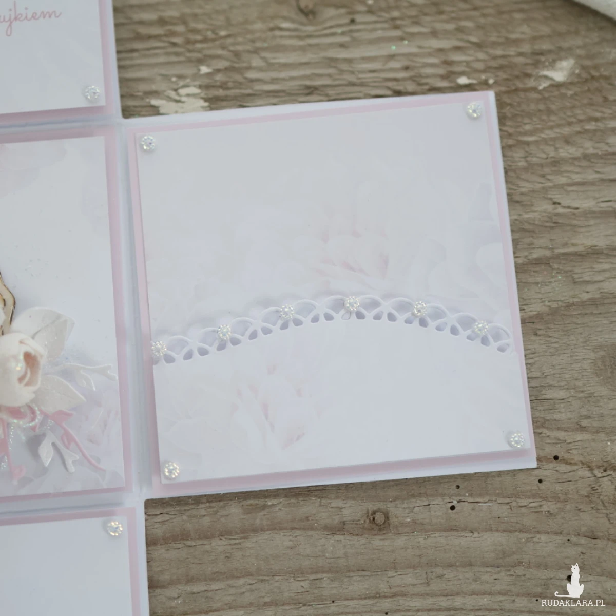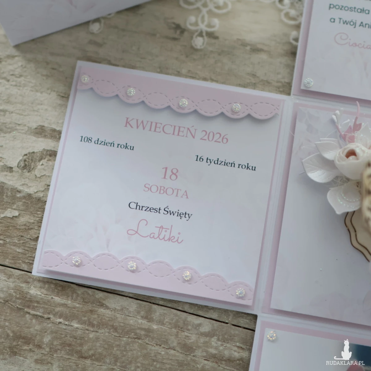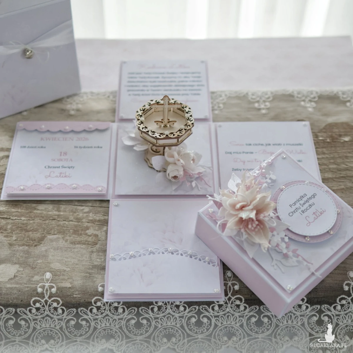 Kartka w formie pudełka na chrzest dziewczynki, która po otwarciu zamienia się w wyjątkową pamiątkę. Z zewnątrz eleganckie pudełko z imieniem dziecka i kwiatami, a w środku niespodzianka, która pojawia się w momencie otwarcia....