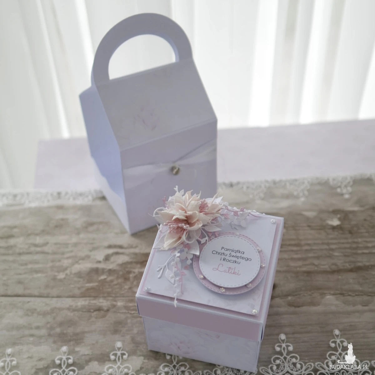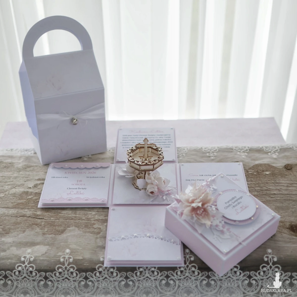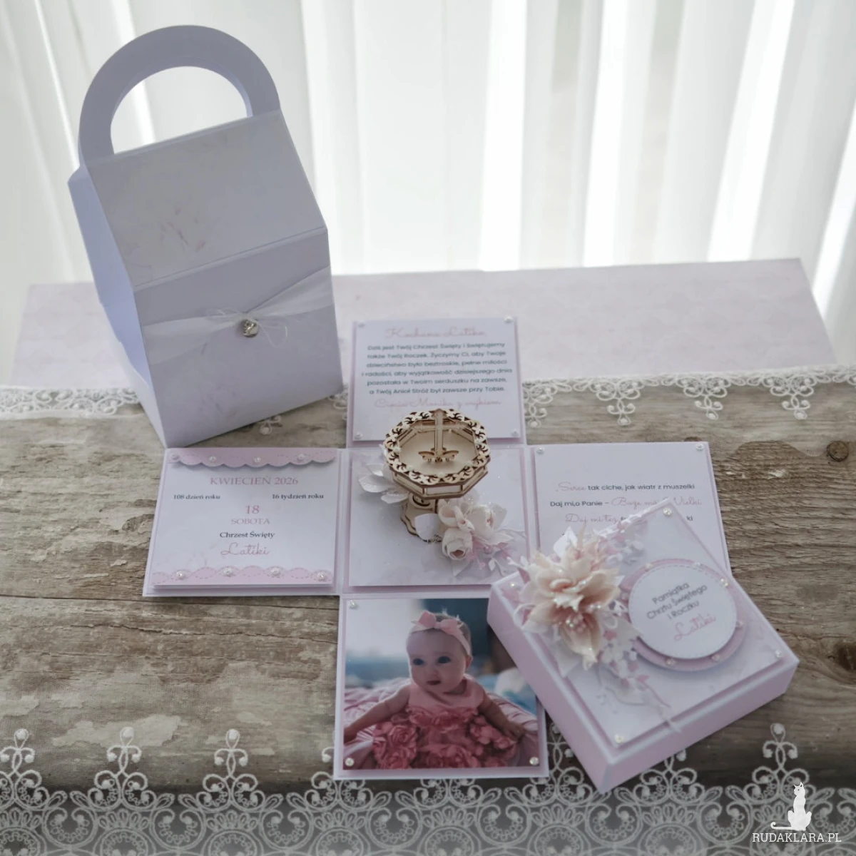 W środku chrzcielnica i ręcznie tworzone kwiaty, życzenia i cytat, kieszonka na pieniądze, kartka z kalendarza lub zdjęcie dziecka. W zestawie znajduje się torebka prezentowa dzięki czemu pamiątka jest gotowa do wręczenia.