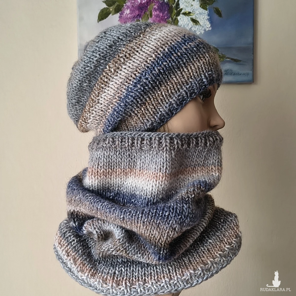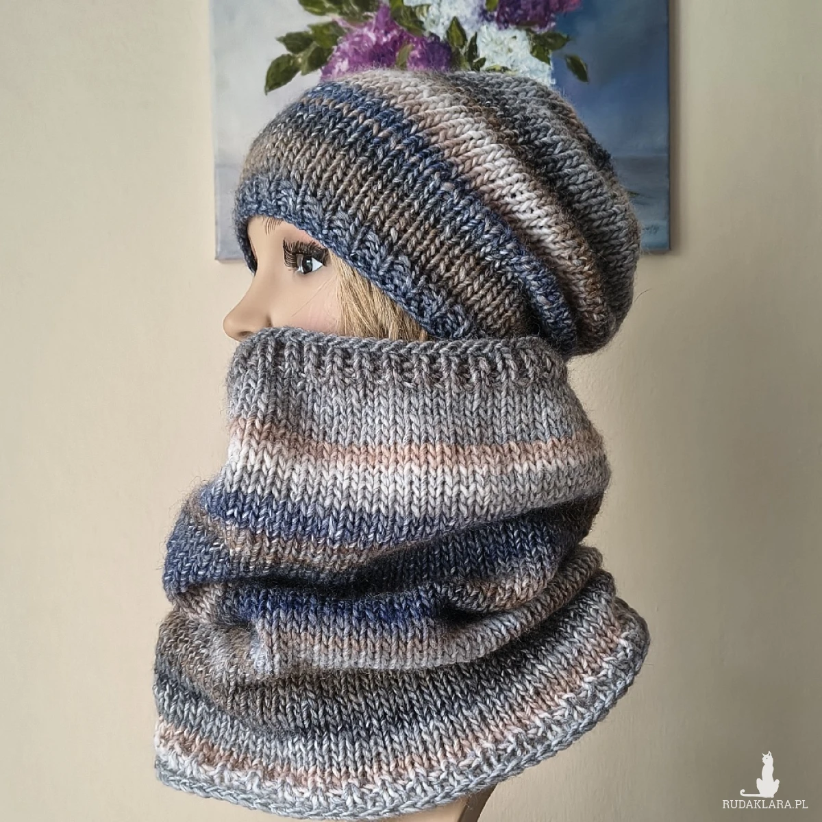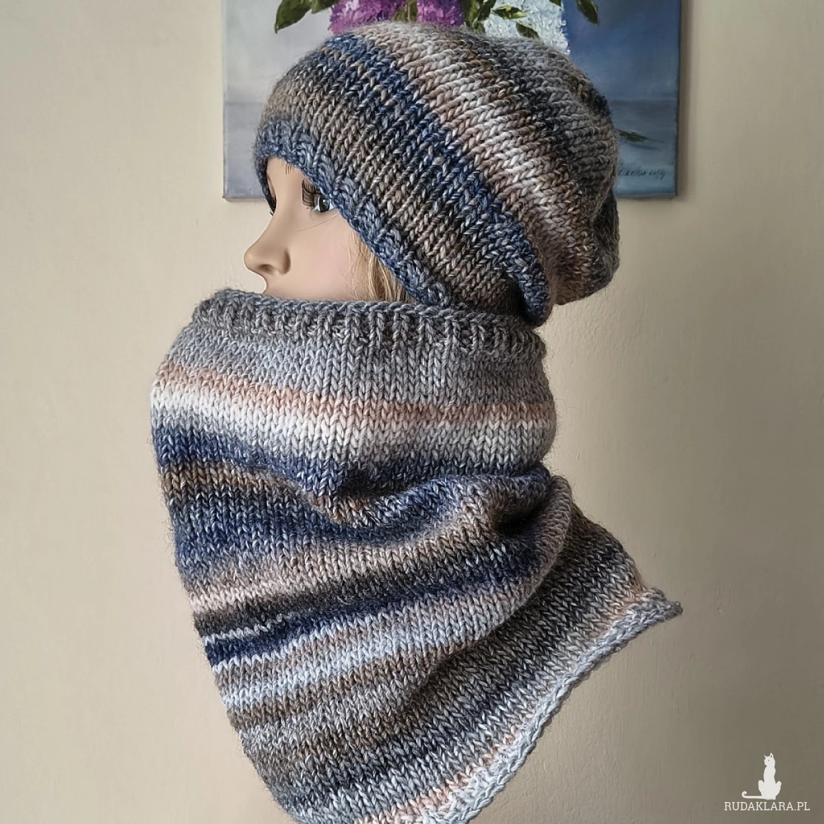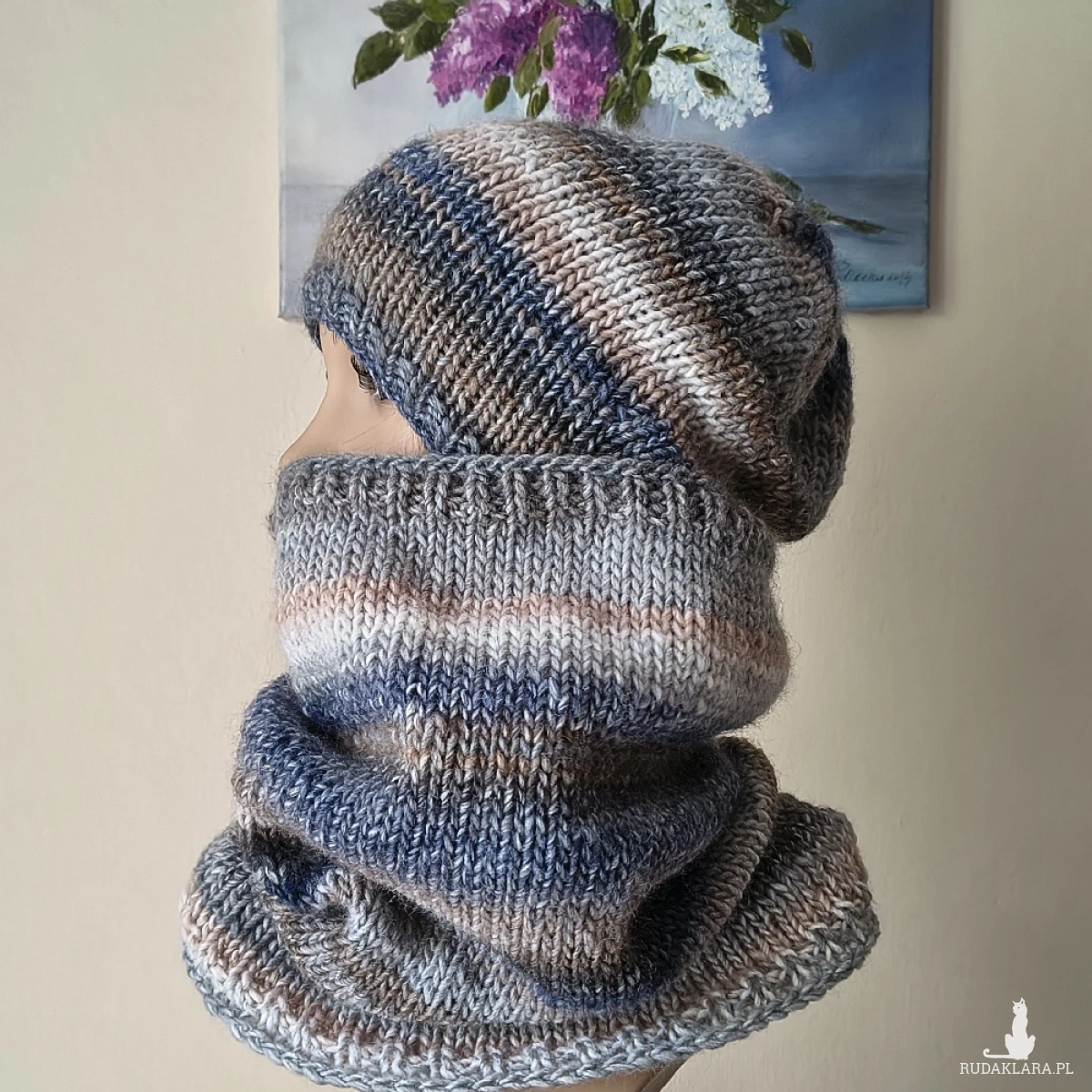 "W chmurach" to kolejny projekt z mojej autorskiej i bardzo od lat lubianej, kolekcji. Miły, ciepły, lekki bezszwowy komplet (robiony naokoło, a nie zszywany), wykonany jest ręcznie na drutach z doskonałej hiszpańskiej włóczki o składzie: 53% wełna, 47% akryl. Włóczka jest delikatna, przyjemna dla skóry, a gama kolorystyczna interesująca i bardzo twarzowa. Komplet doskonale ochroni przed zimnem, doda też charakteru różnym stylizacjom. Jest otulający i i świetnie się układa. Wymiary: czapka dł. 26,5 cm, polecam dla obwodów głowy 55-58 cm., komin szer. 56 cm (góra), 66 cm. (dół), dł. komina 40 cm. Są to wymiary na płasko, bez rozciągania itp. Pranie ręczne.