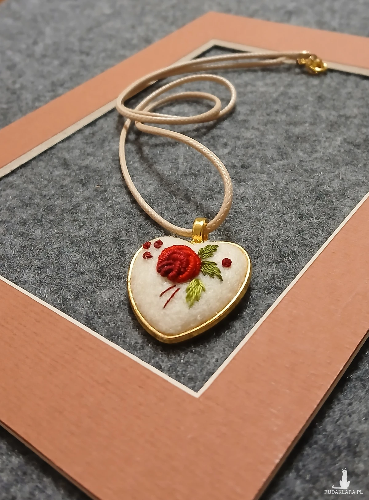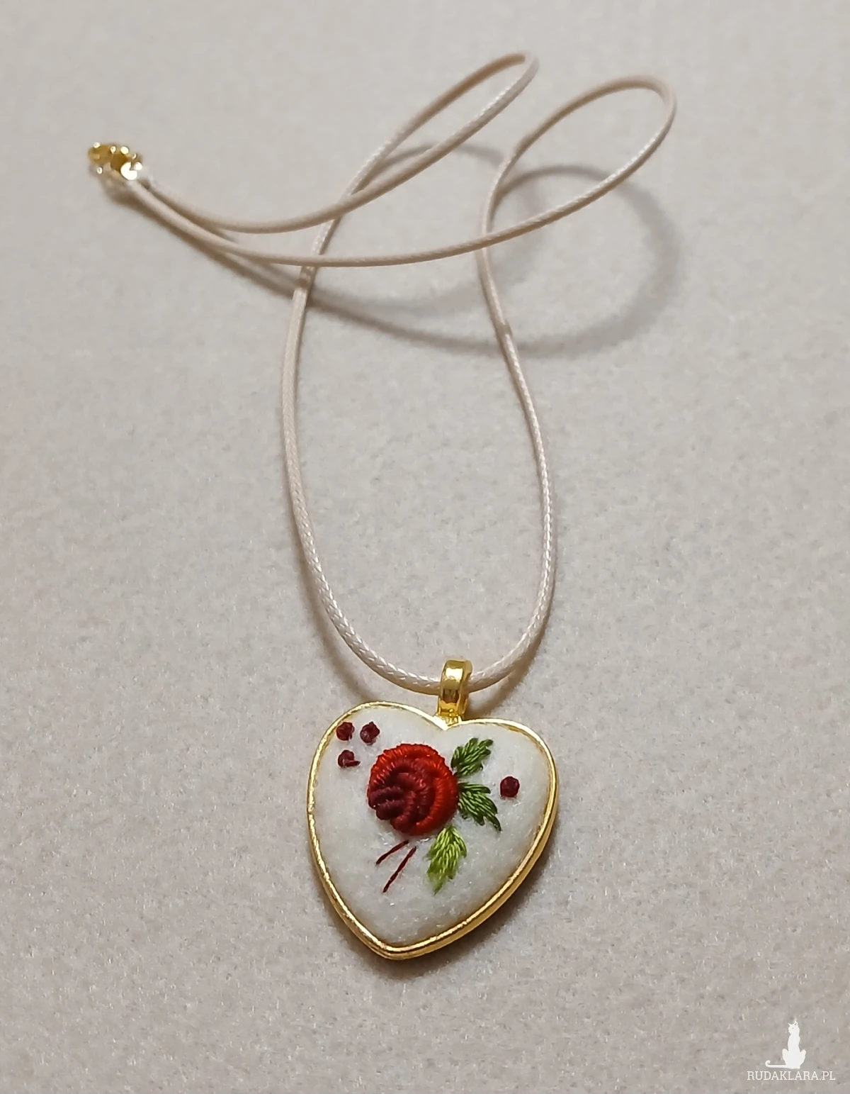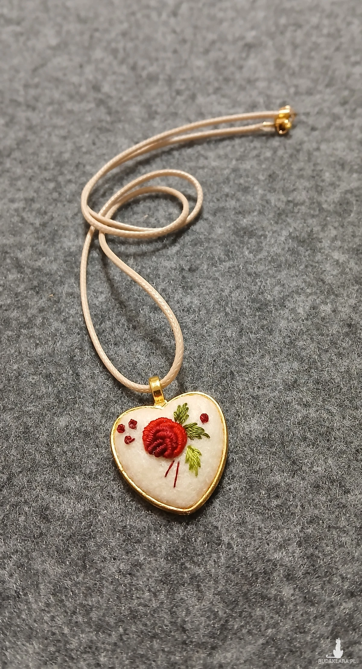 Słodkie, złote serduszko w klasycznej kolorystyce haftu to spektakularny, niewielki wisiorek. Autorski wzór, kunsztowne wykonanie, niespotykany design. Niepowtarzalność tkwi w każdym detalu.
