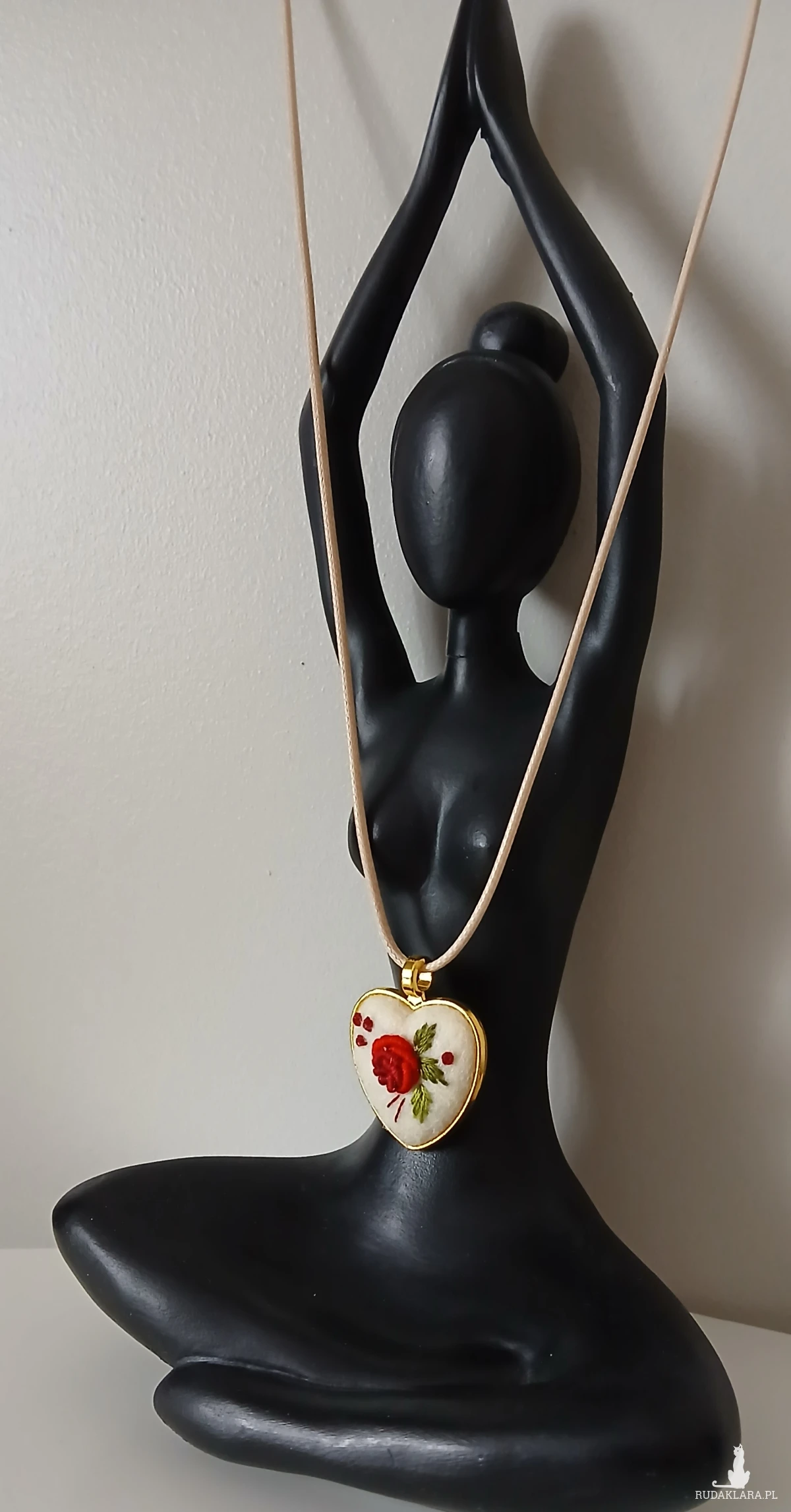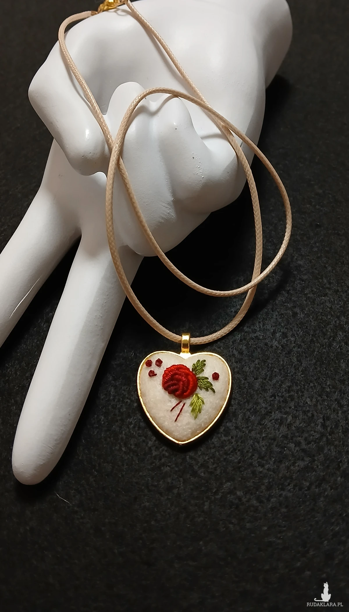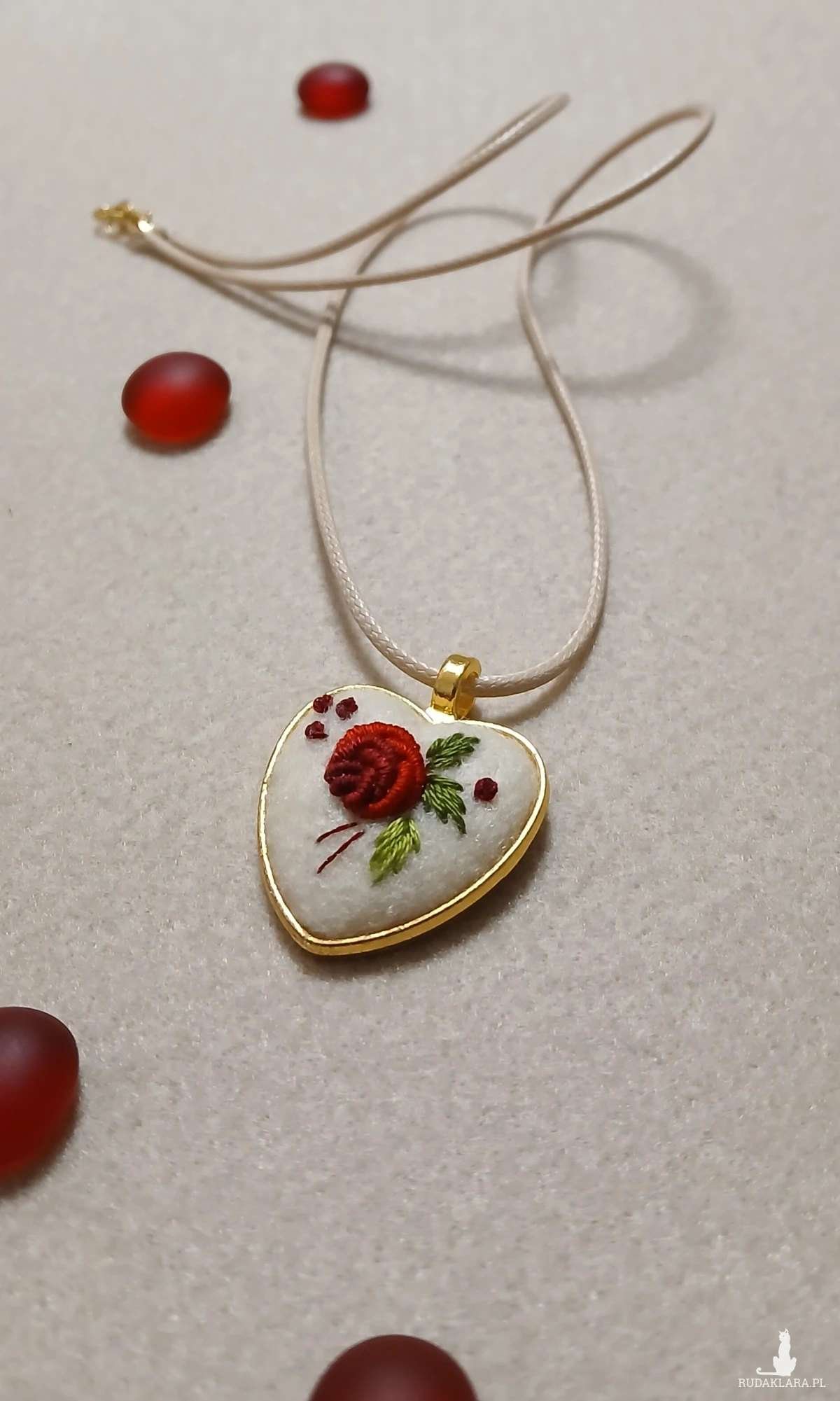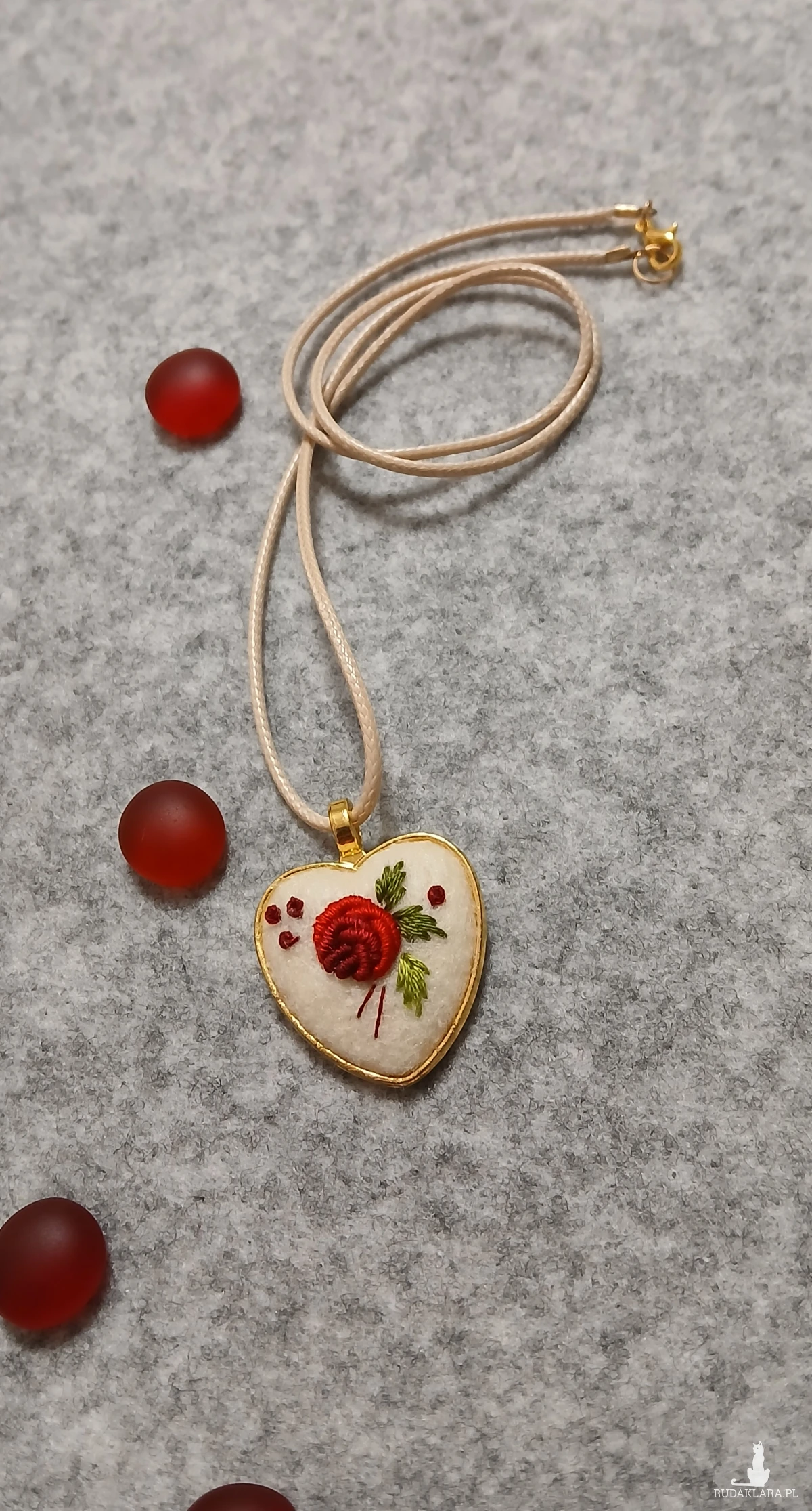 Słodkie, złote serduszko w klasycznej kolorystyce haftu to spektakularny, niewielki wisiorek. Autorski wzór, kunsztowne wykonanie, niespotykany design. Niepowtarzalność tkwi w każdym detalu.