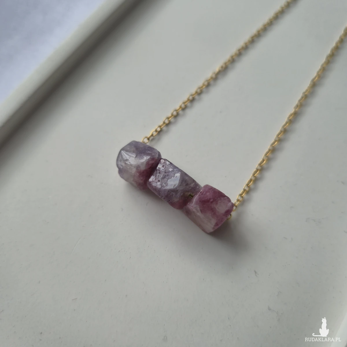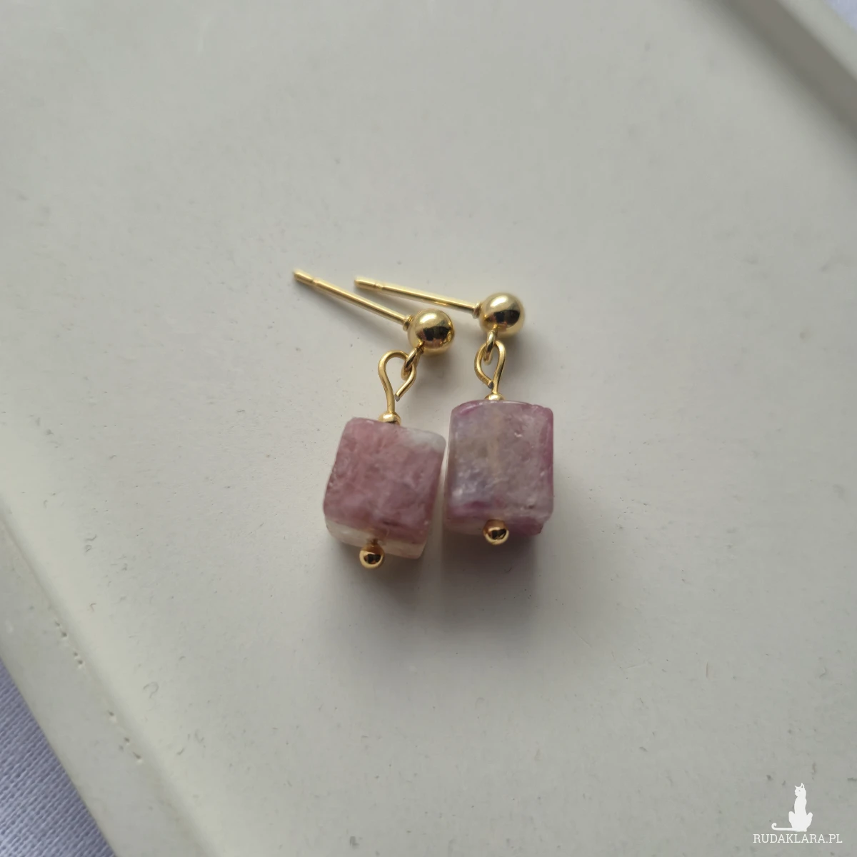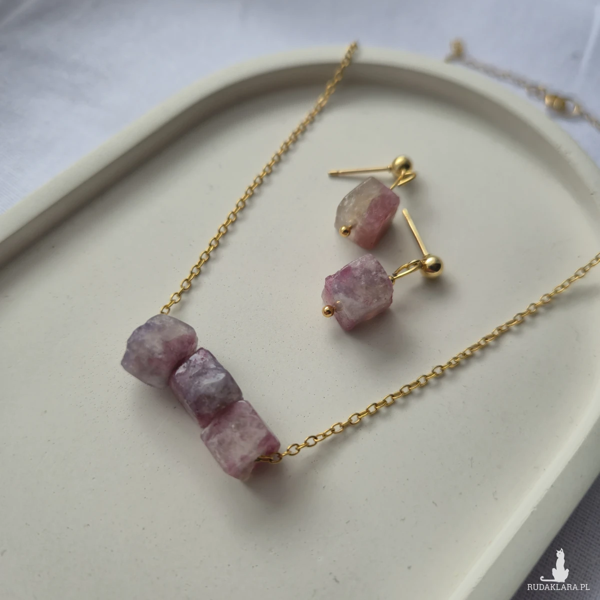 Delikatny, subtelny zestaw biżuterii z przepięknym, różowo fioletowym turmalinem w kształcie nieregularnych, surowych kostek.