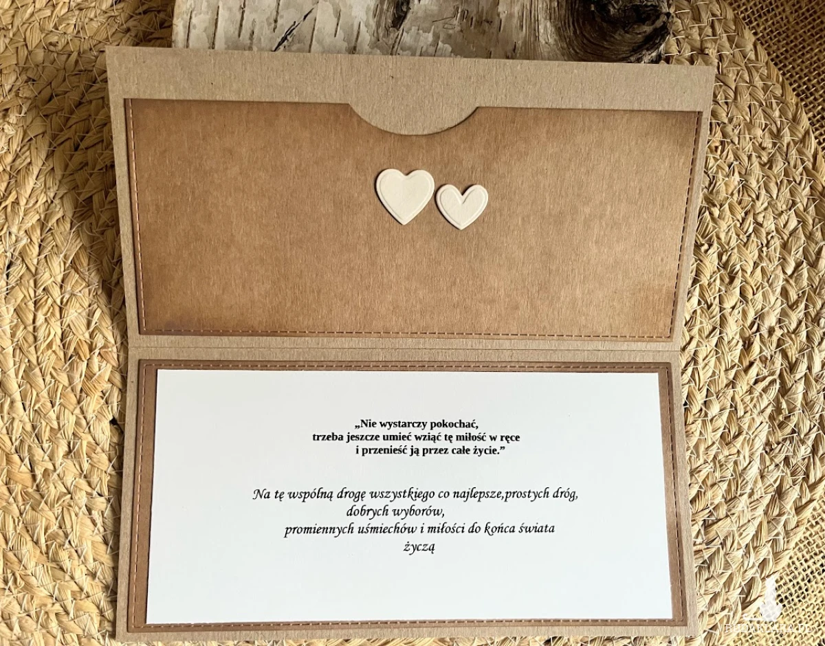 Kartka z okazji Ślubu do koperty dla Młodej Pary , która kocha podróże i wybiera się w szczęśliwą podróż przez wspólne życie z urokliwym samolotem. Komplet stworzony na bazie papieru kraftowego nadając kompletowi klimat eco. Kartka ma wymiary 21 x 10 , koperta ma wymiary 22 x 11. Całość obwiązana sznurkiem z tagiem - biletem .W środku kartki znajdują się gotowe życzenia do własnoręcznego podpisu oraz umieszczono kieszonkę na małe co nieco lub kupon lotto W tej postaci produkt dostępny od ręki .Pozdrawiam