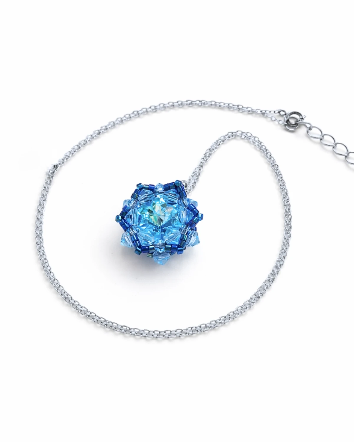 Preciosa to renomowana europejska marka specjalizująca się w produkcji kryształów i kamieni jubilerskich o najwyższej jakości szlifu i blasku. Kamienie Rivoli Maxima cenione są za wyjątkową czystość, intensywność koloru i precyzję wykonania. Kompozycję uzupełniają kryształki Preciosa Bicone oraz precyzyjnie dobrane koraliki Miyuki Delica, które subtelnie rozpraszają światło i nadają całości głębi.