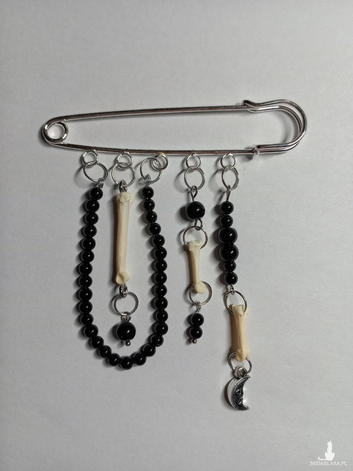 Duża agrafka z księżycem, kostkami i koralikami z onyxu.
