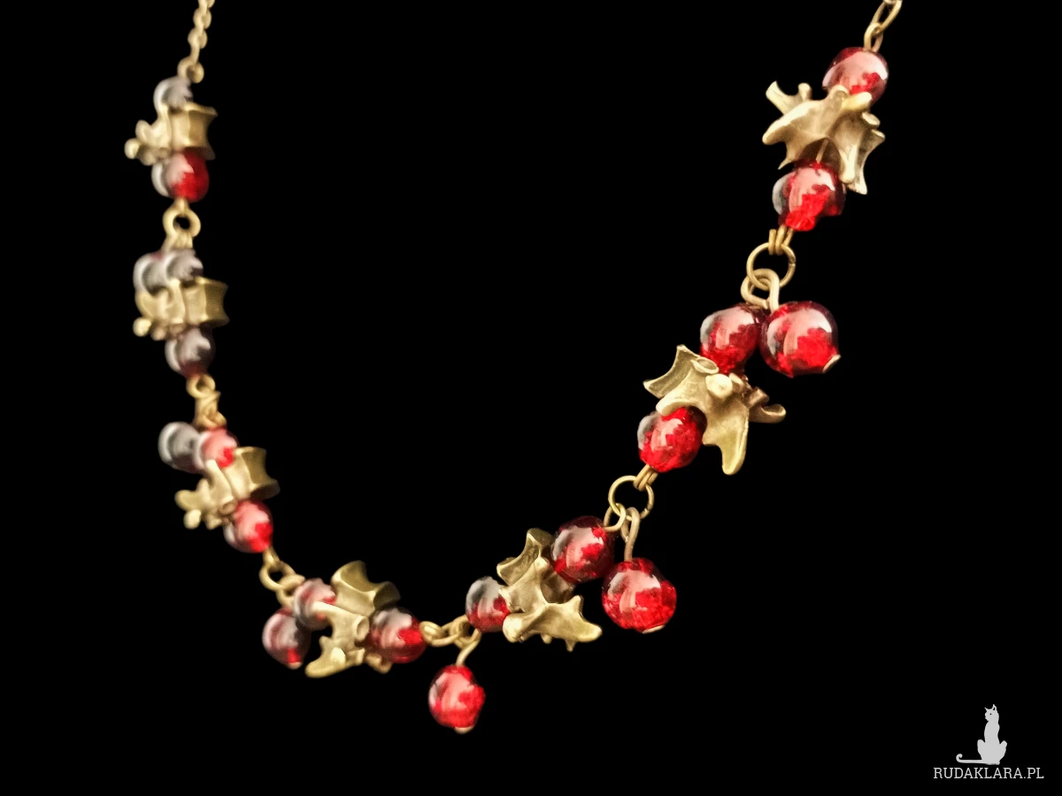 Naszyjnik wykonany z krwistoczerwonych koralików szklanych oraz wykonanych z metalu kręgów w kolorze starego złota.