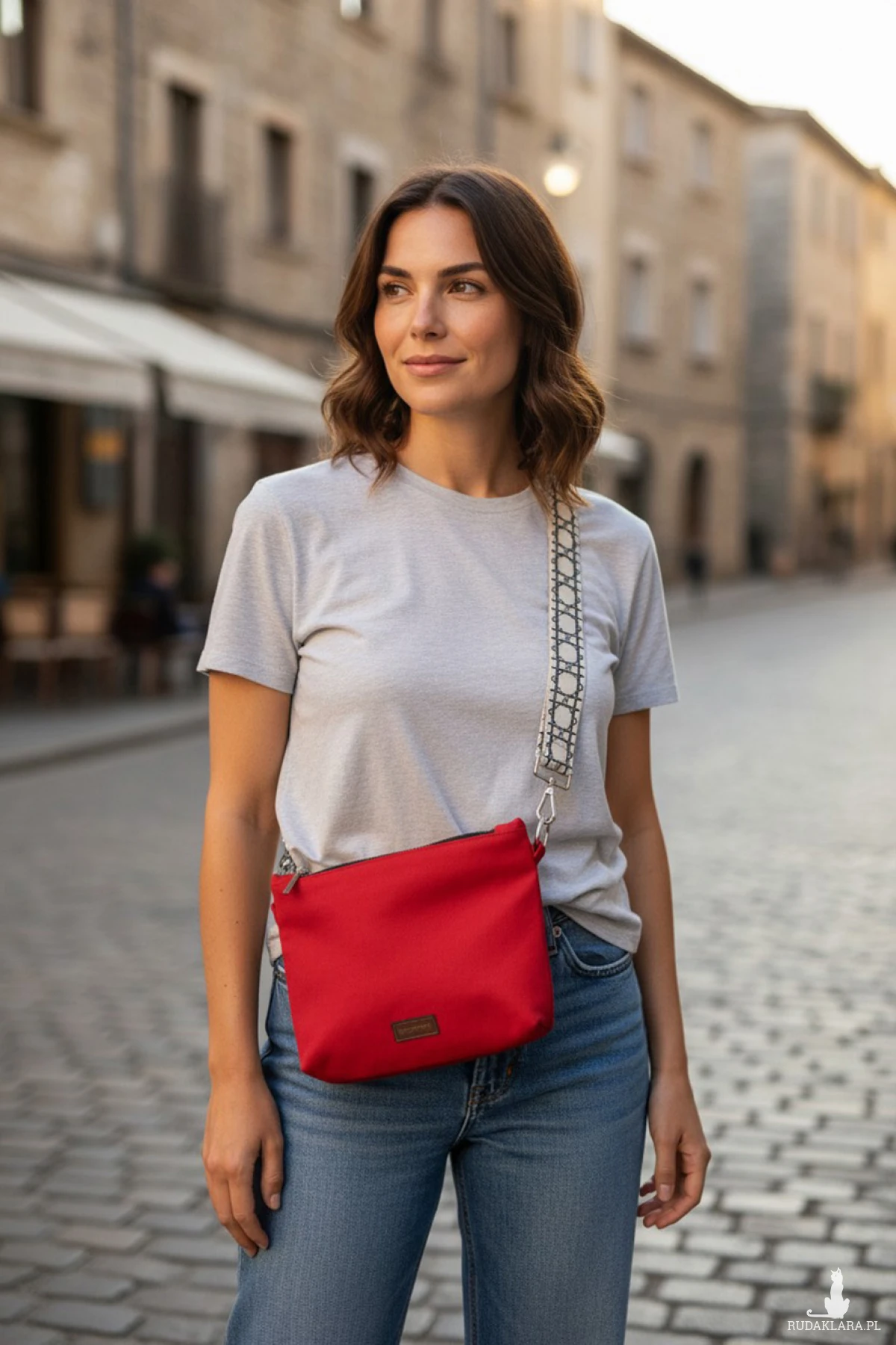 Torebka posiada regulowany pasek w kolorze kremowym w czarne wzory i srebrne okucia.