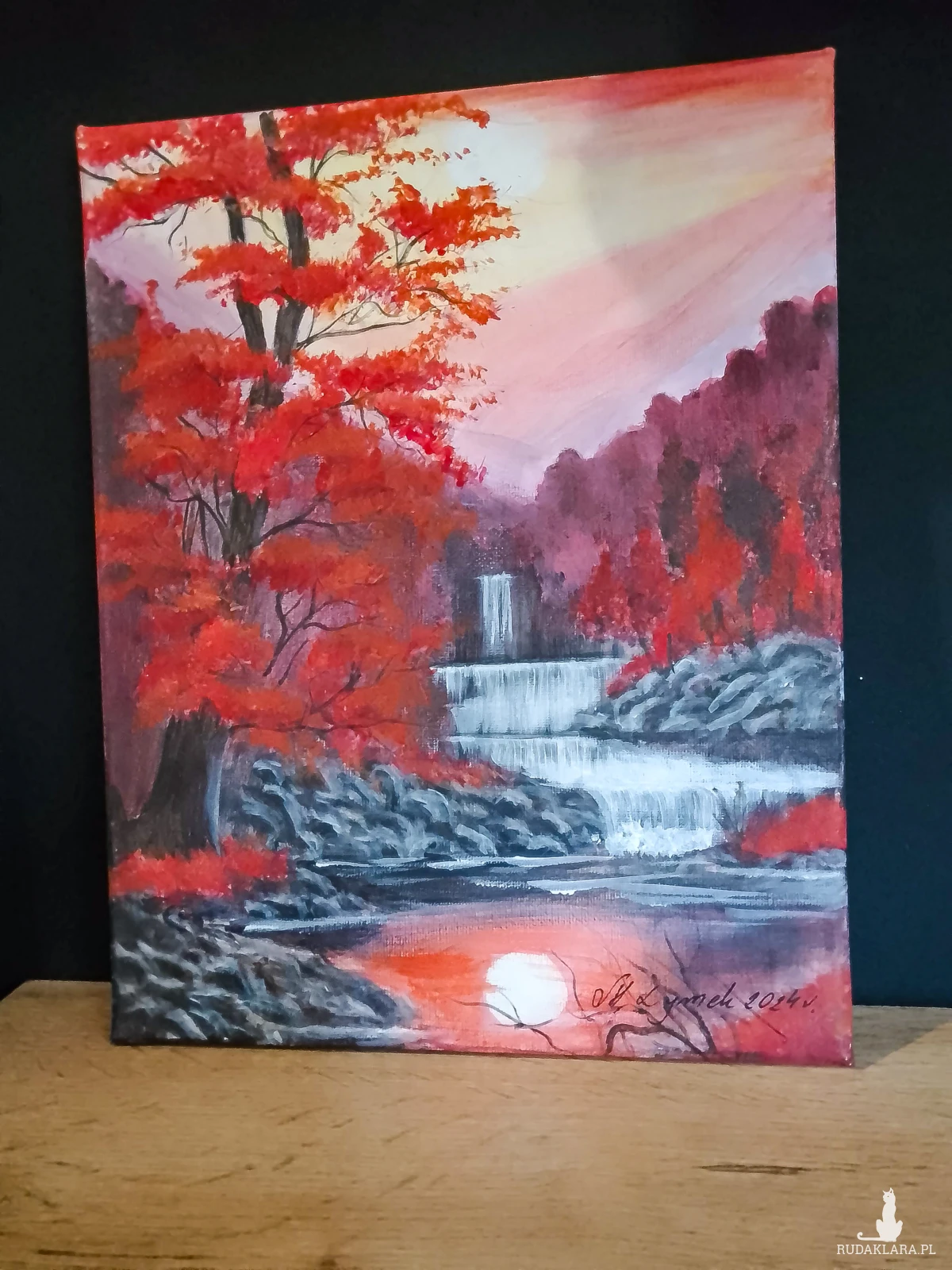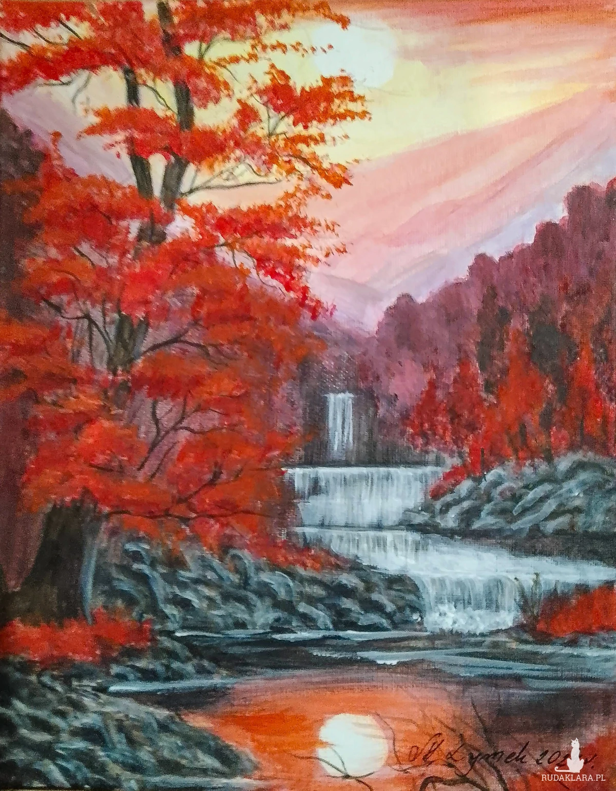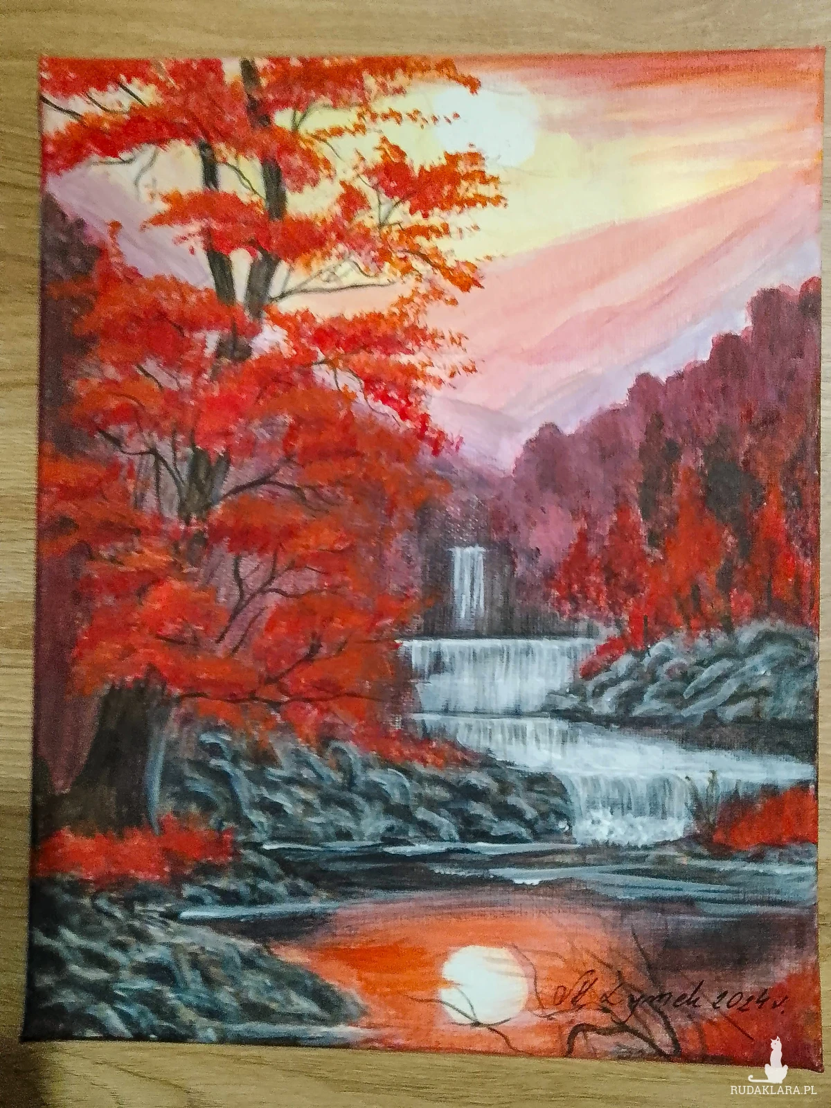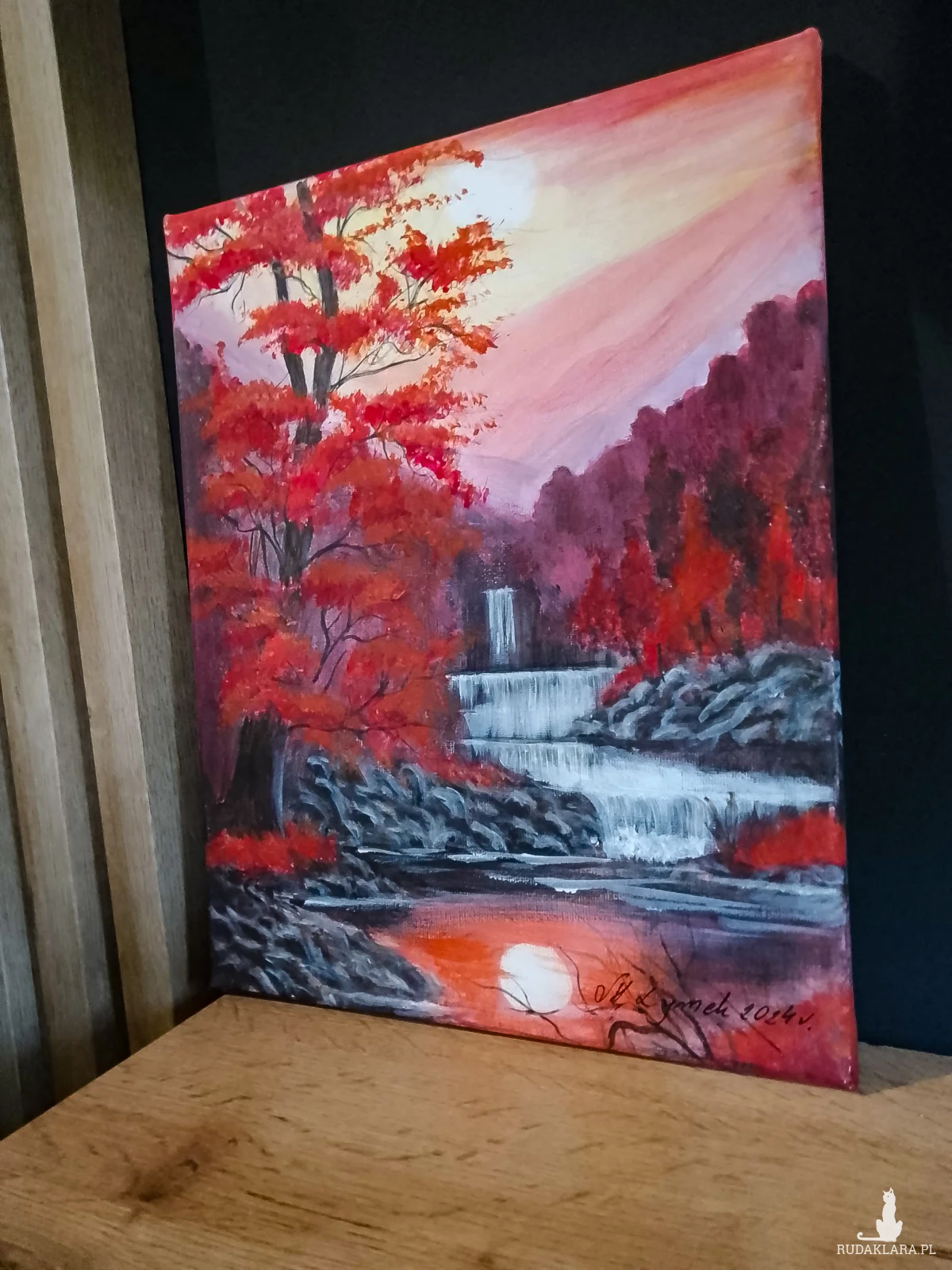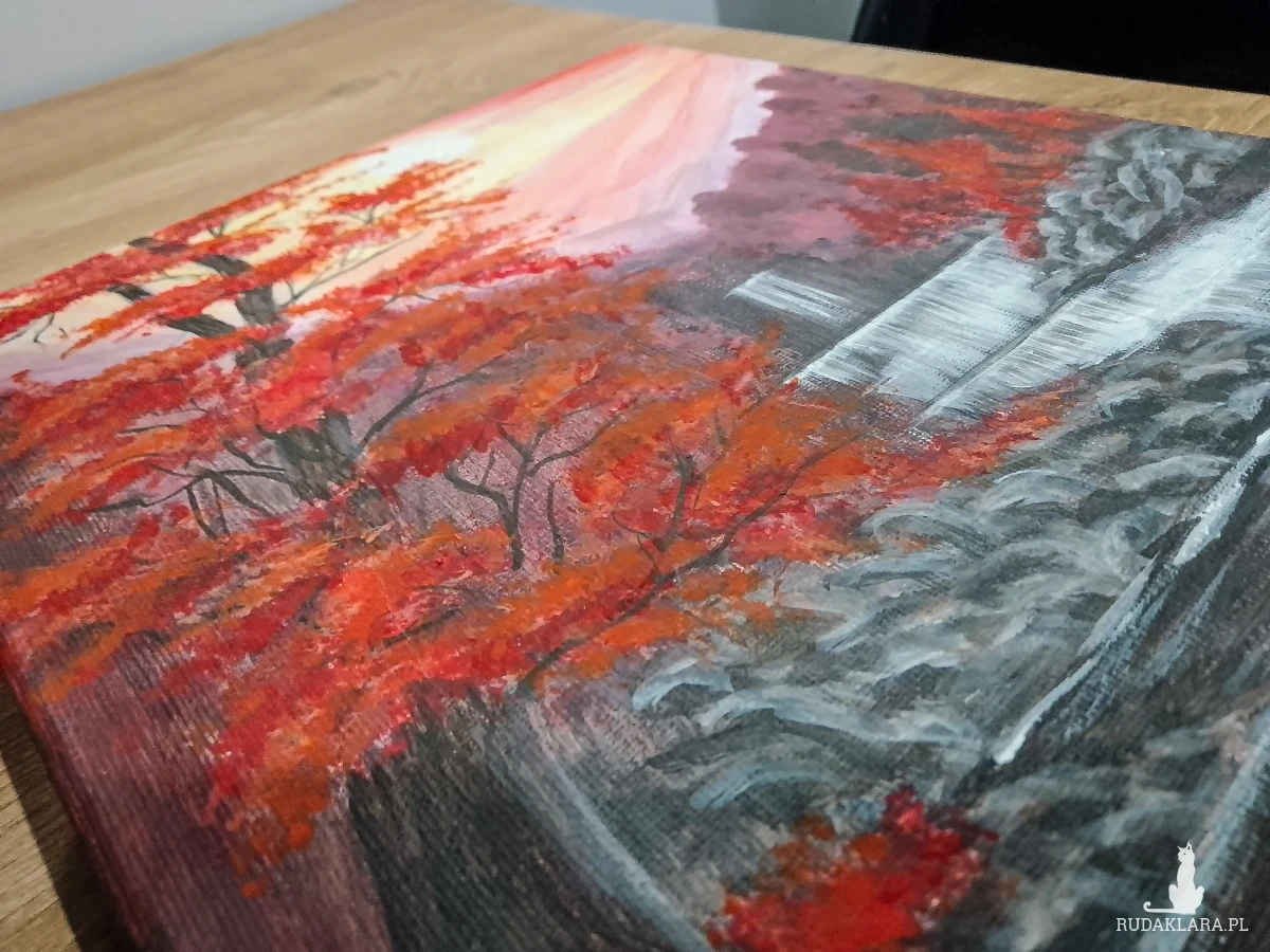 Wyjątkowy, ręcznie malowany obraz, który przeniesie magię złotej jesieni prosto do Twojego wnętrza. Dynamiczna scena z wodospadem, otoczonym drzewami w intensywnie ognistych barwach. Kontrast między chłodną, białą wodą a ciepłymi barwami liści tworzy niezwykle nastrojową kompozycję, która wprowadza spokój i ciepło. Przepięknie udekoruje ściany salonu, sypialni, czy gabinetu. Idealny również jako prezent na każdą okazję.
