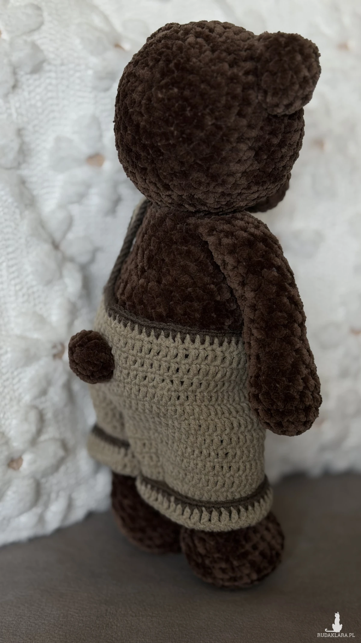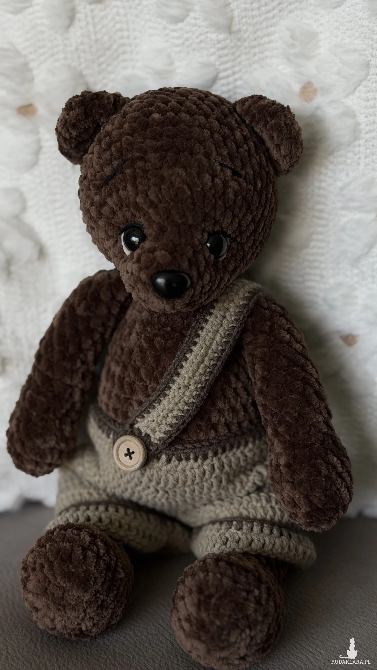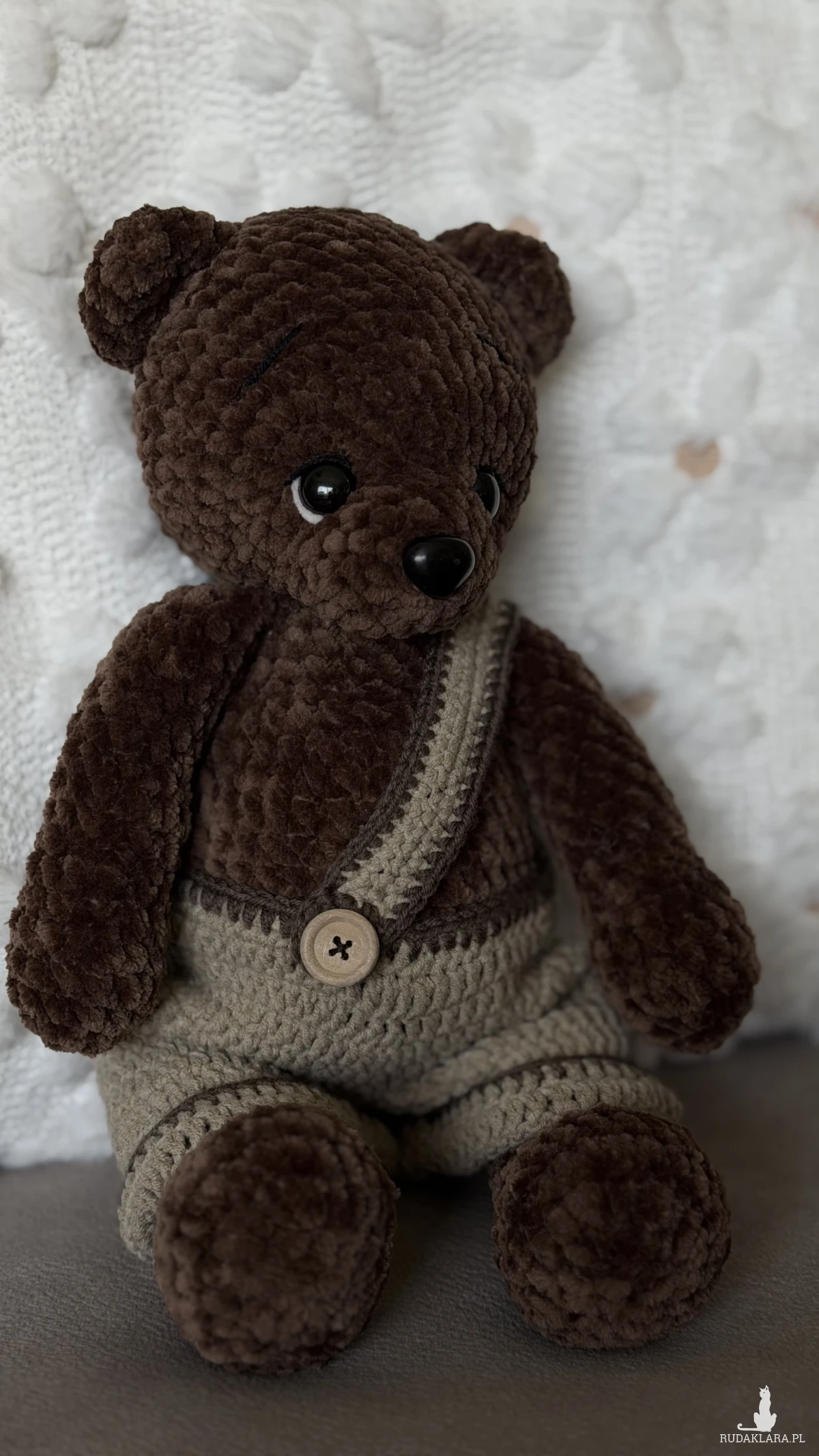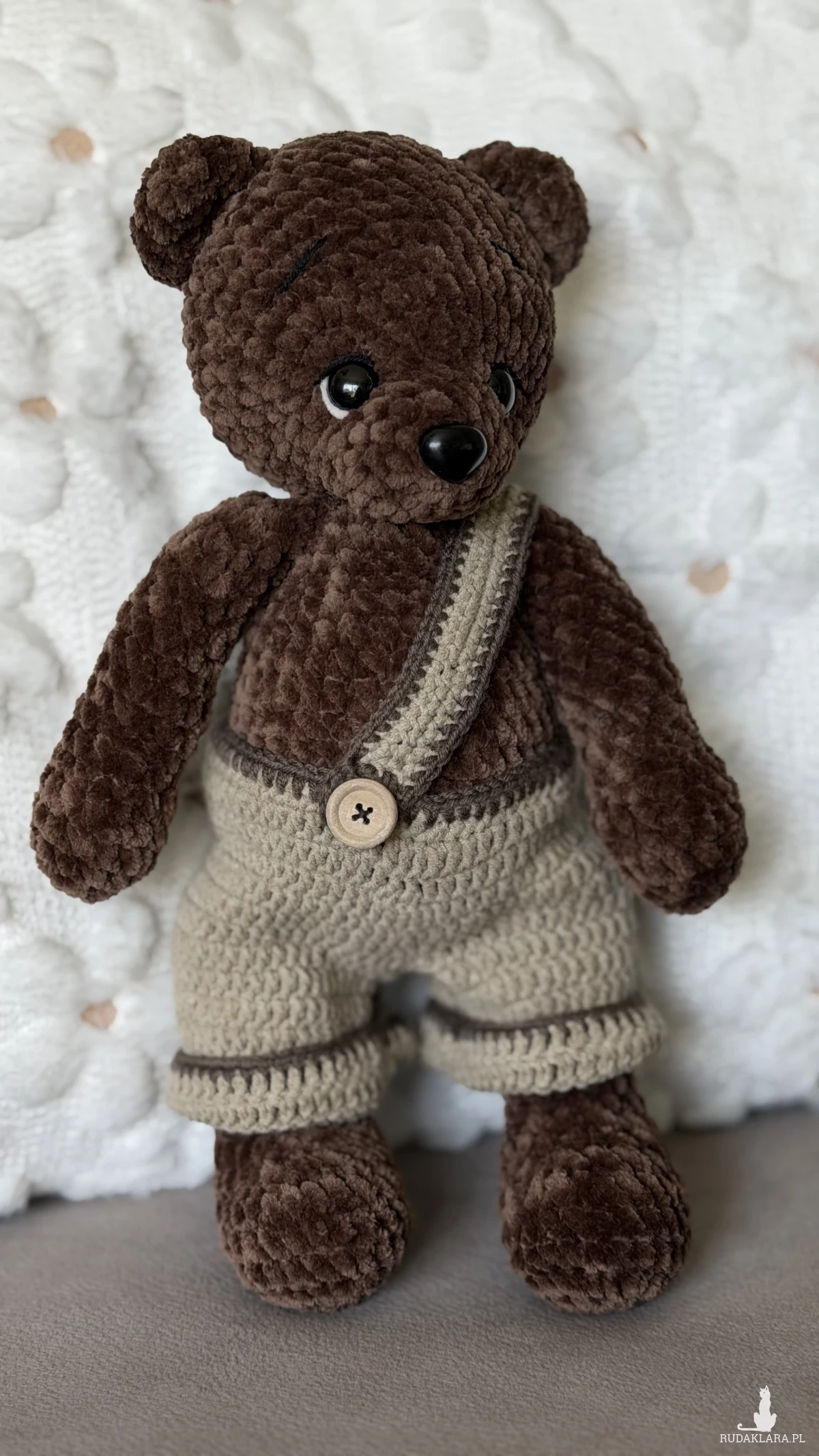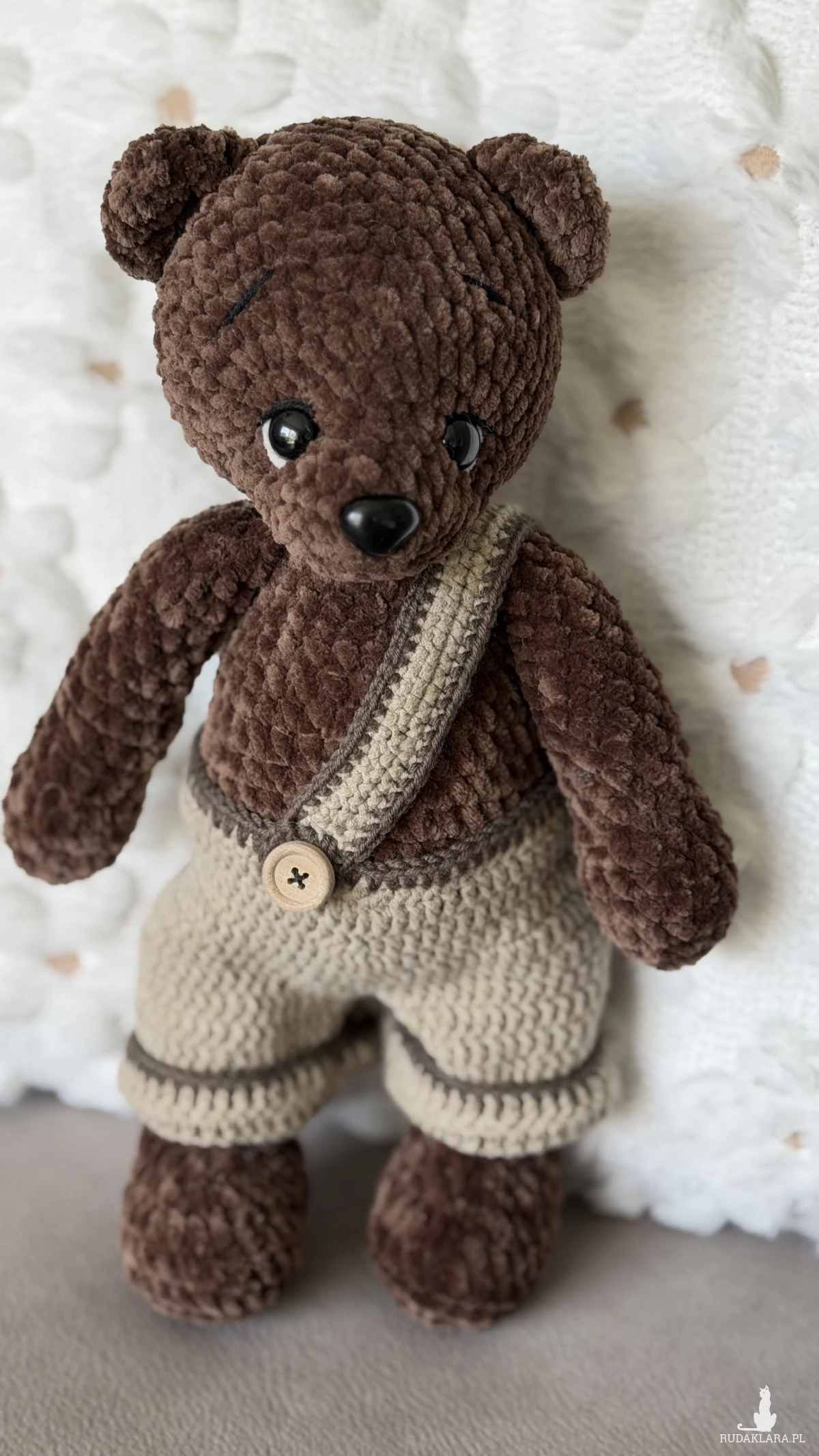 Miś Hugo to miękki, ręcznie szydełkowany pluszak wykonany z pluszowej włóczki Dolphin Baby. Jego ciepły, brązowy kolor i urocze ubranko w stylu retro sprawiają, że idealnie nadaje się do przytulania, dekoracji pokoju lub jako wyjątkowy prezent.