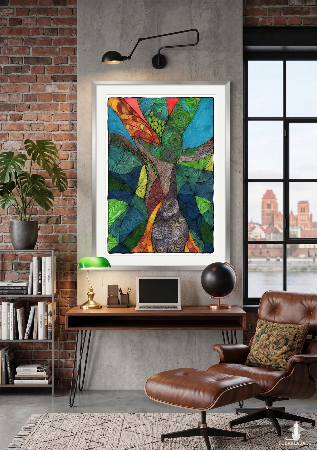 W centrum dominuje forma drzewa, które otacza dynamiczny układ kształtów w zieleni, błękitach, żółciach i czerwieniach.