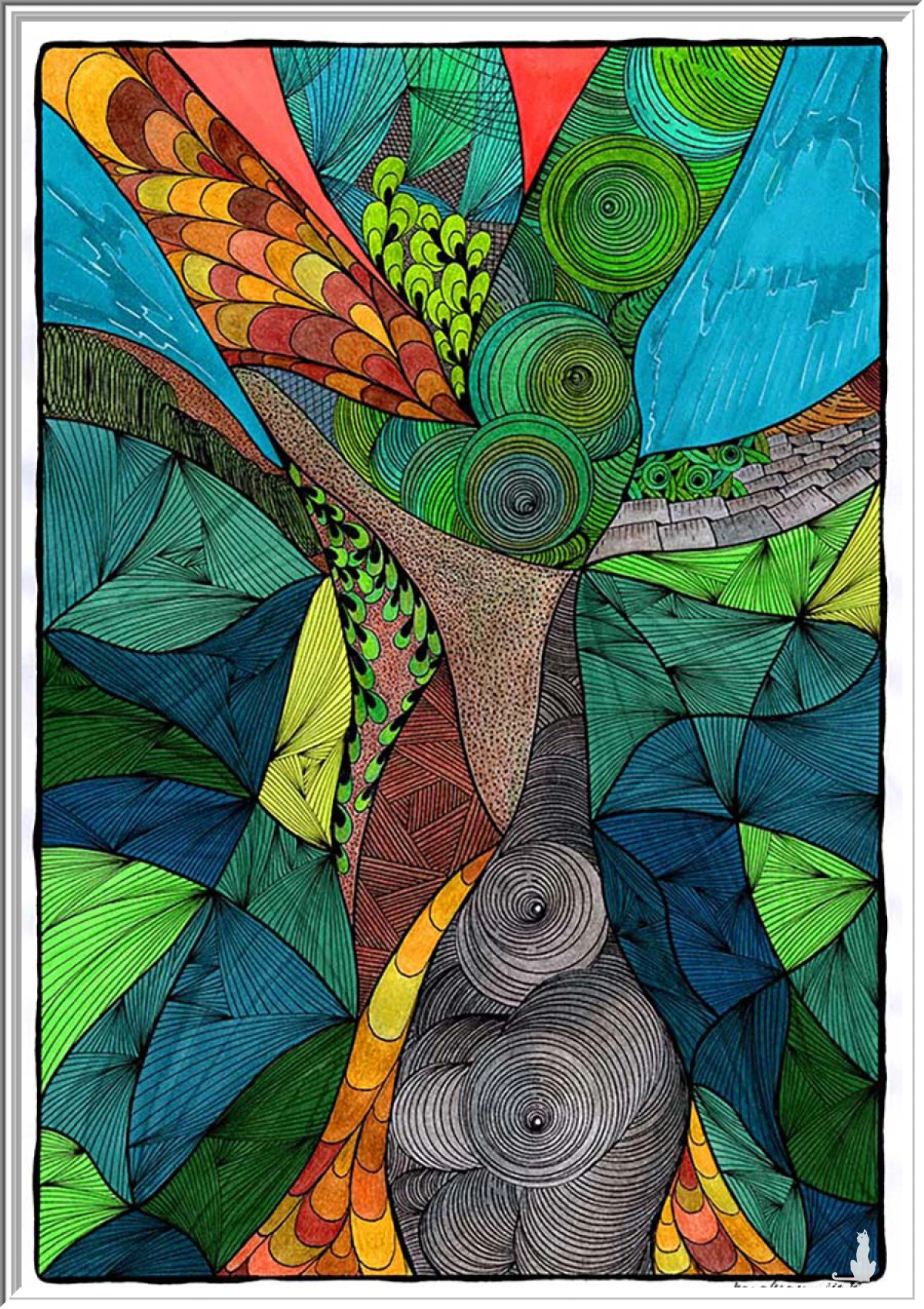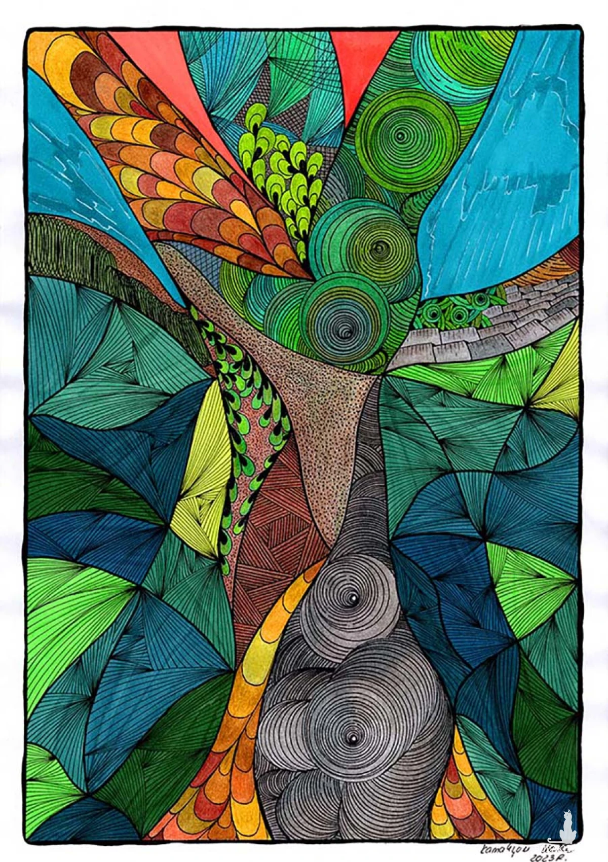 Wzory spiralne, geometryczne i organiczne przeplatają się ze sobą, tworząc wizję natury i ruchu. Rysunek niesie przesłanie odradzania się, harmonii i światła, które przebija przez chaos.
