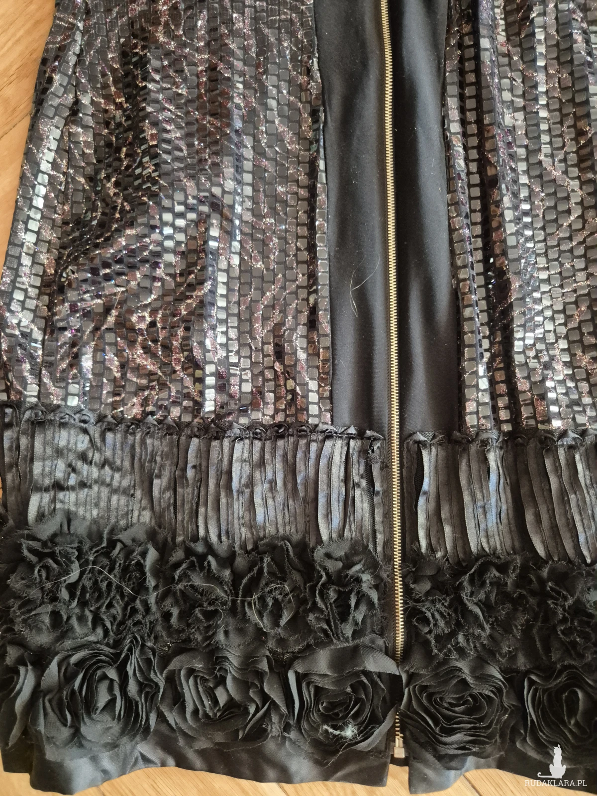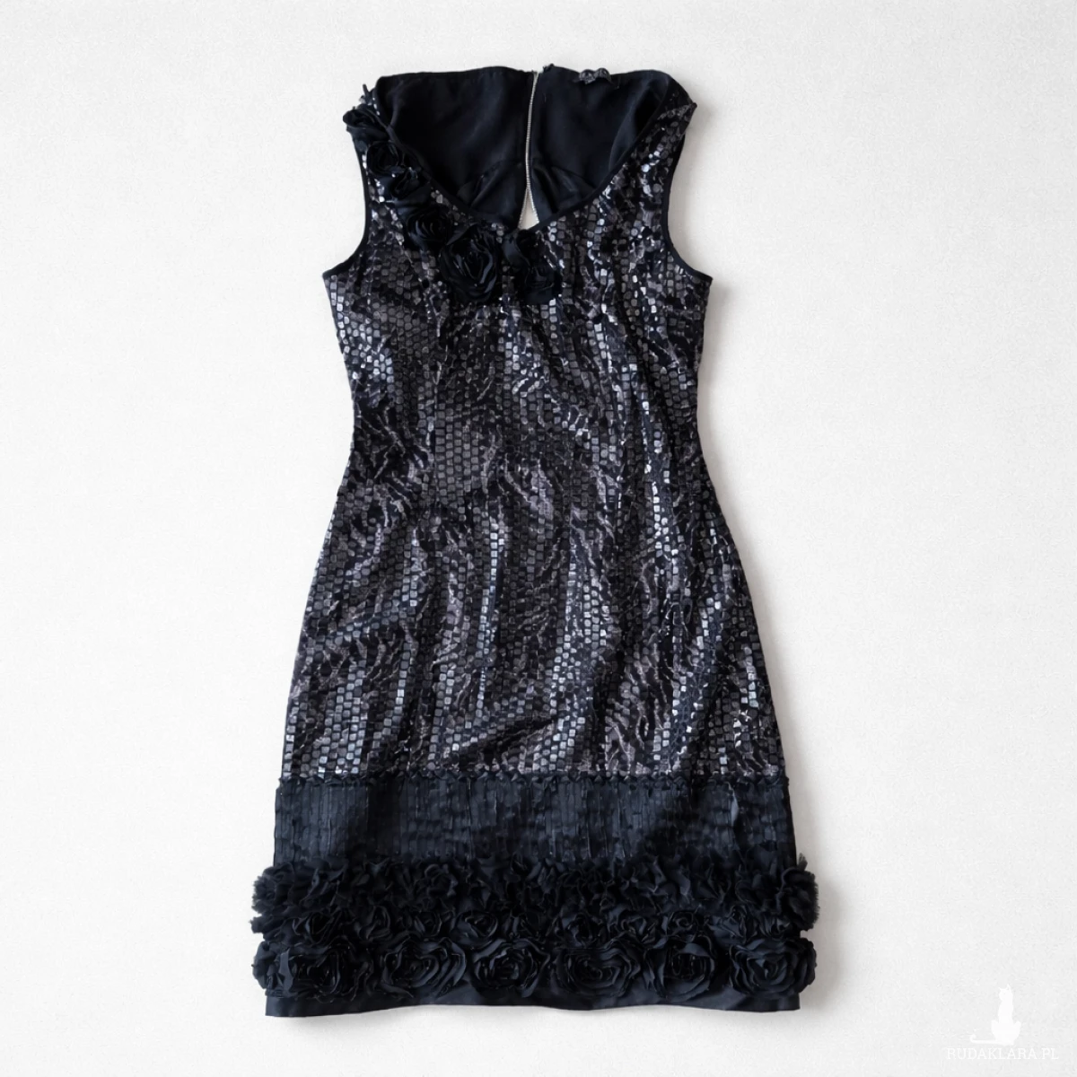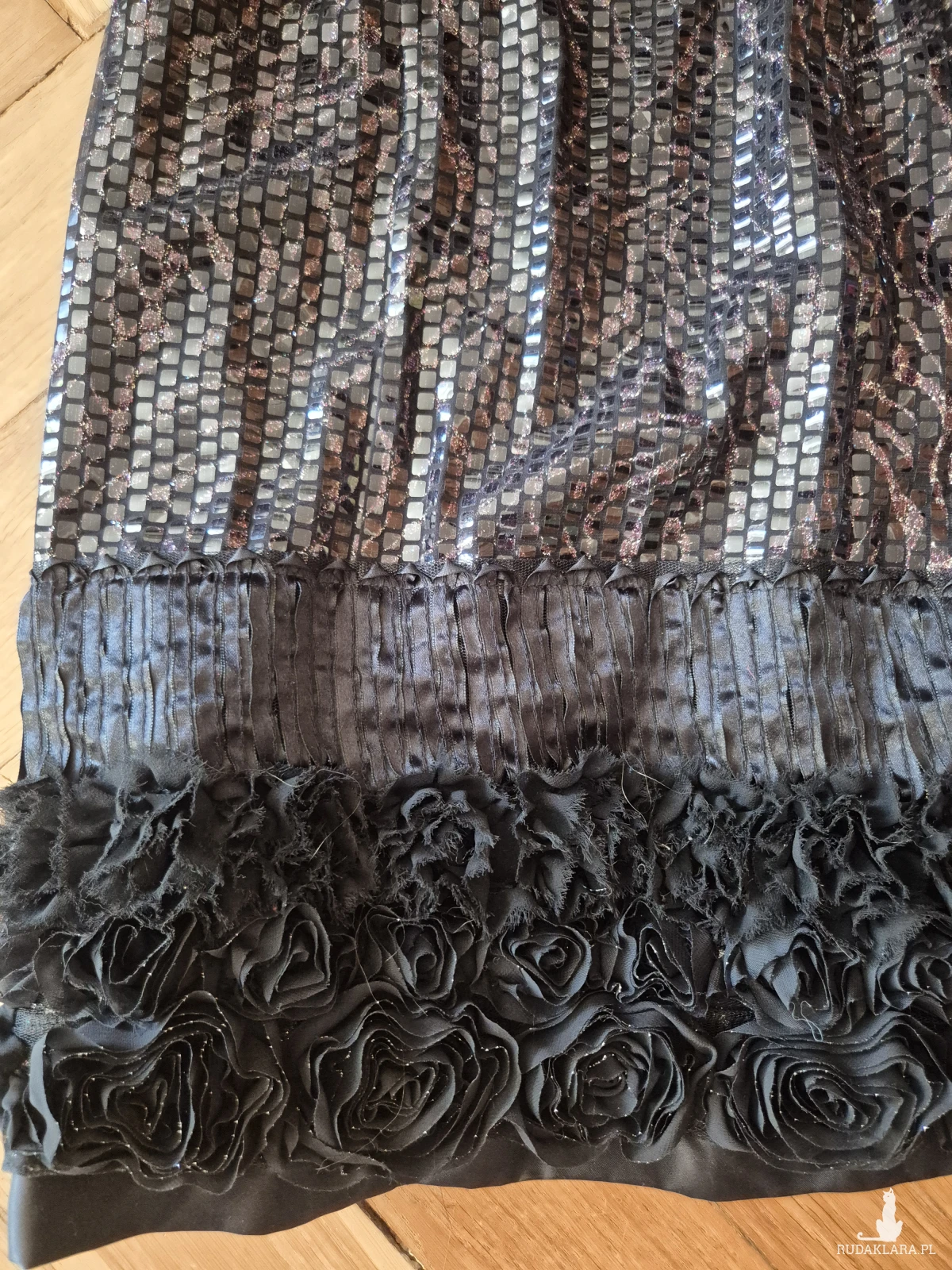 sukienka elegancka cekinowa róże czarna rozm L- stan idealny, bardzo awangardowa, zapinana z tyłu na zamek, długość 91cm, biust 90cm, biodra 100, pas 80cm, sukienka robi wrażenie, założona raz, polecam box x1