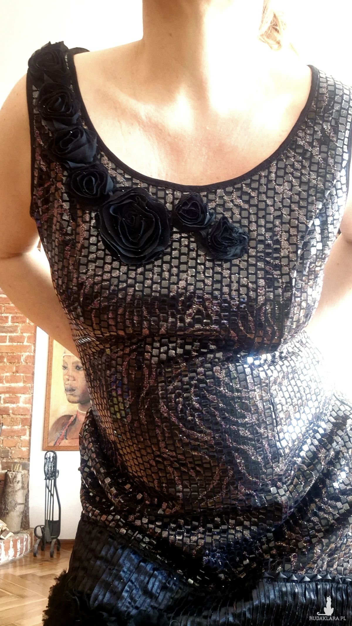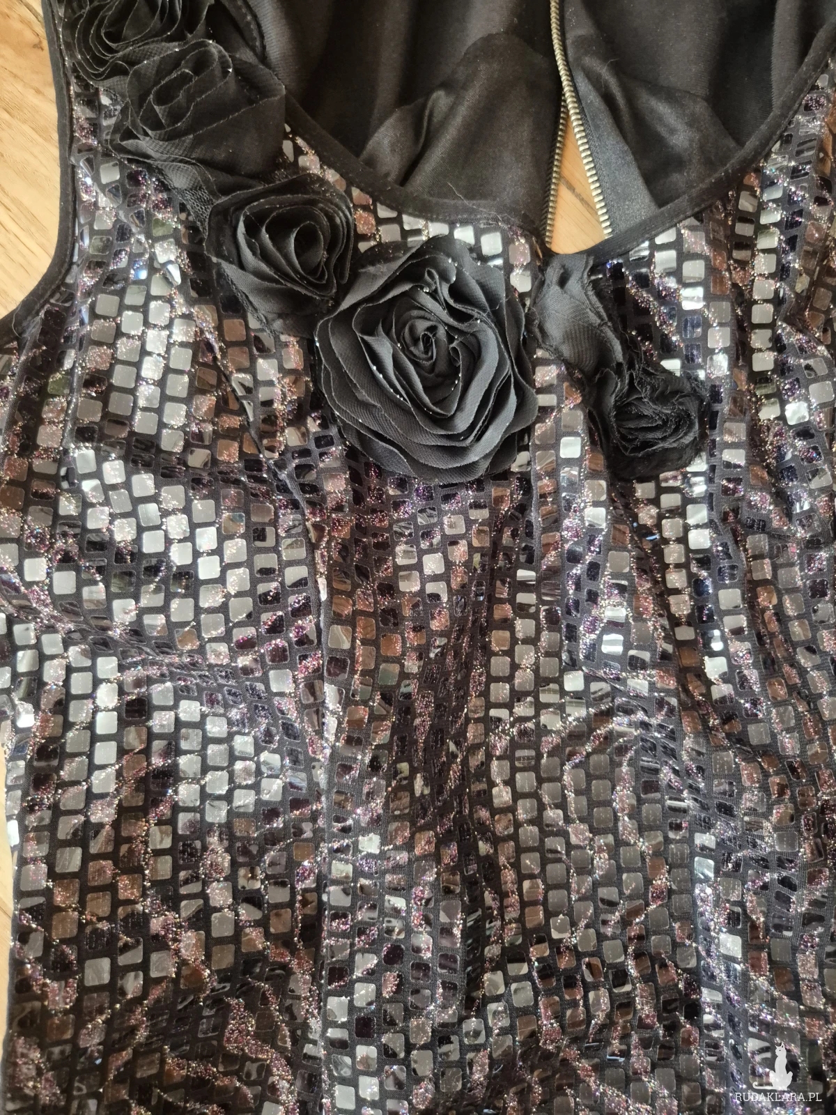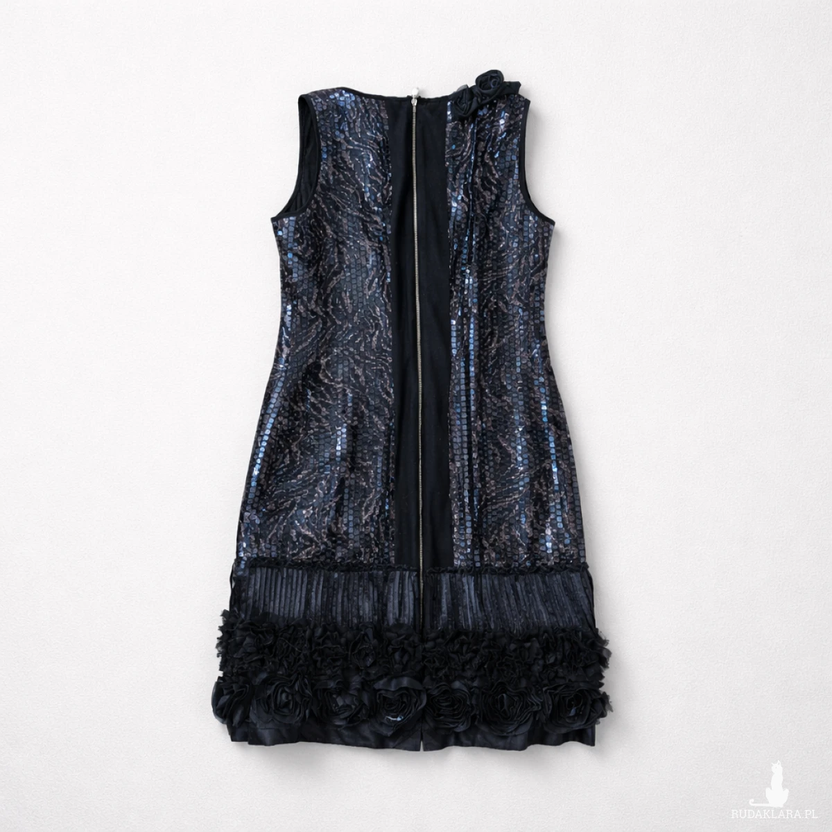 sukienka elegancka cekinowa róże czarna rozm L- stan idealny, bardzo awangardowa, zapinana z tyłu na zamek, długość 91cm, biust 90cm, biodra 100, pas 80cm, sukienka robi wrażenie, założona raz, polecam box x1