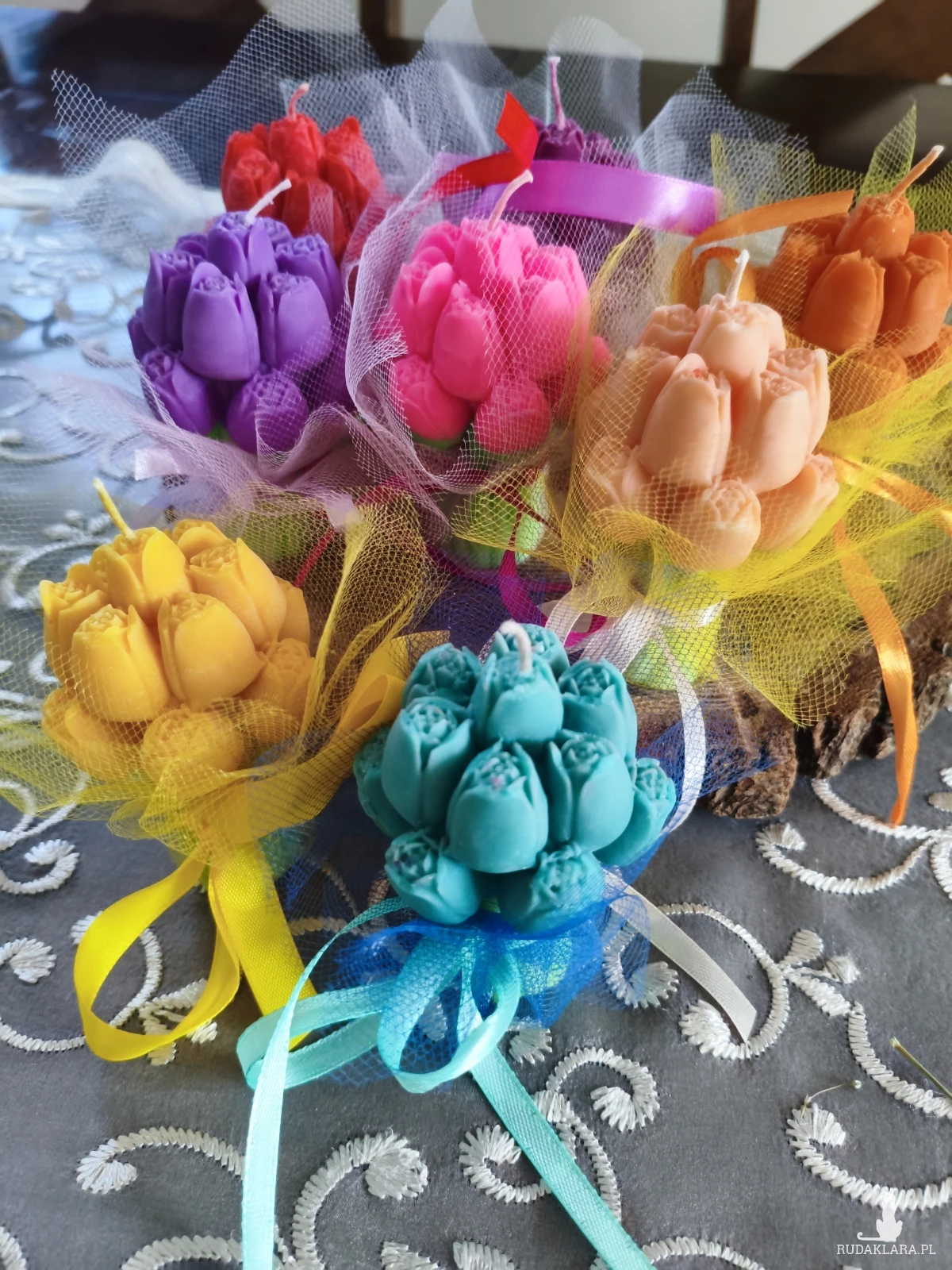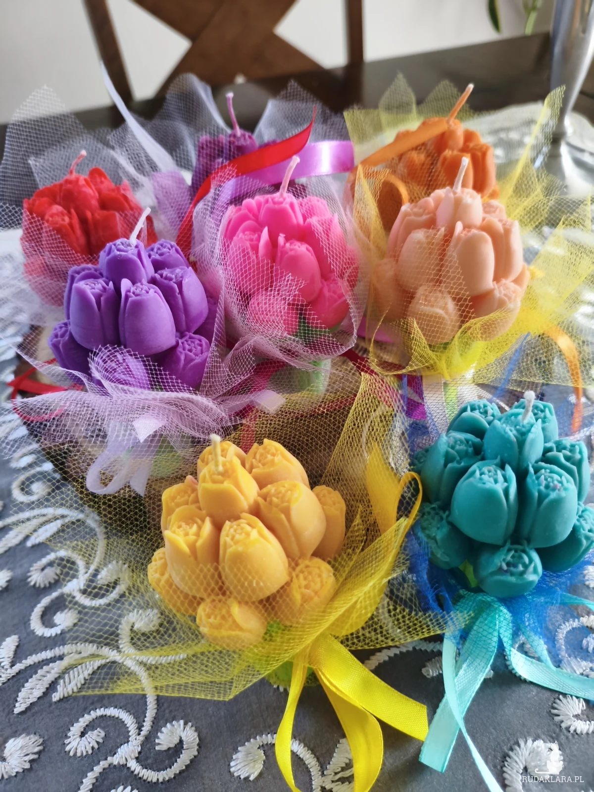 Sprzedam ręcznie wykonaną świecę w kształcie bukietu tulipanów z wosku sojowego w dostępnych kolorach z aromatem róży z nutką maliny. Waga świecy wynosi ok 90 g wysokość 10 cm i średnica 7 cm. Czas palenia świecy wynosi ok 5 h.