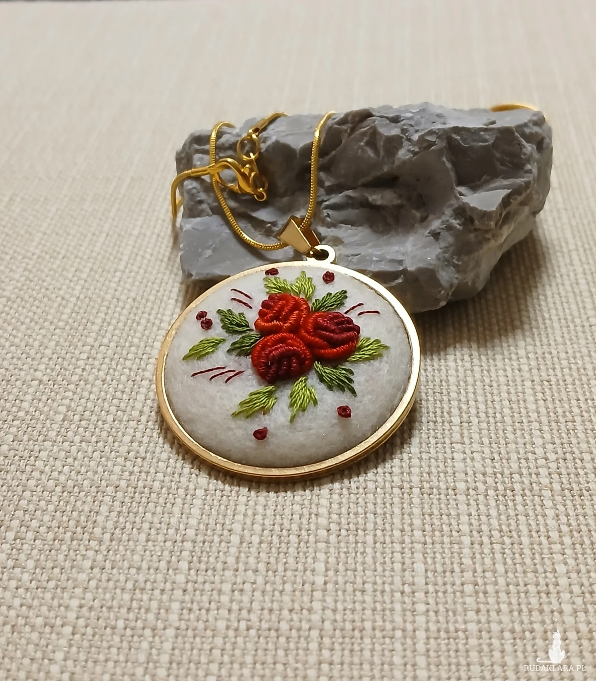 Perfekcyjnie dopracowany haft na filcu wykonałam polską bawełnianą muliną za pomocą igły. Jest on zabezpieczony impregnatem do tkanin, ale po dłuższym użytkowaniu można go odświeżyć przy pomocy delikatnego mydła i letniej wody.