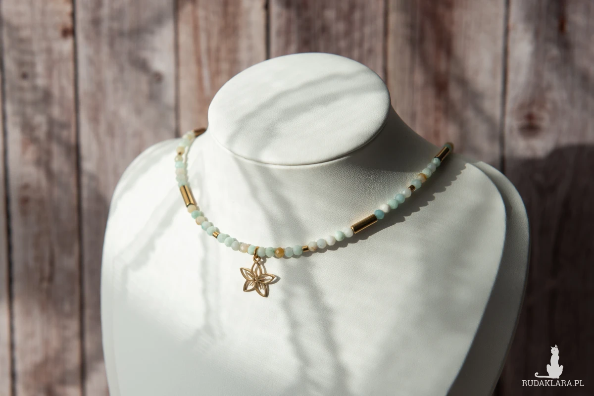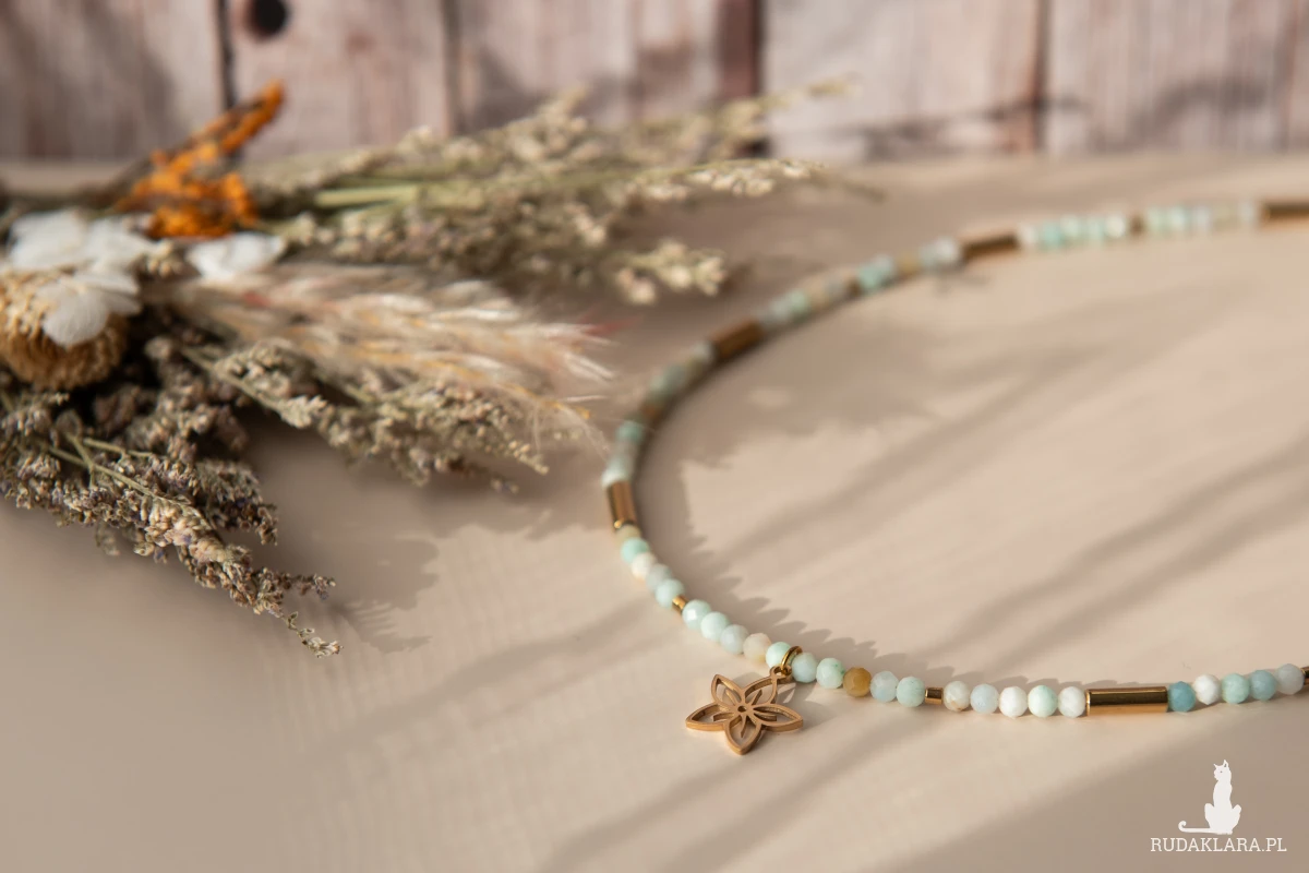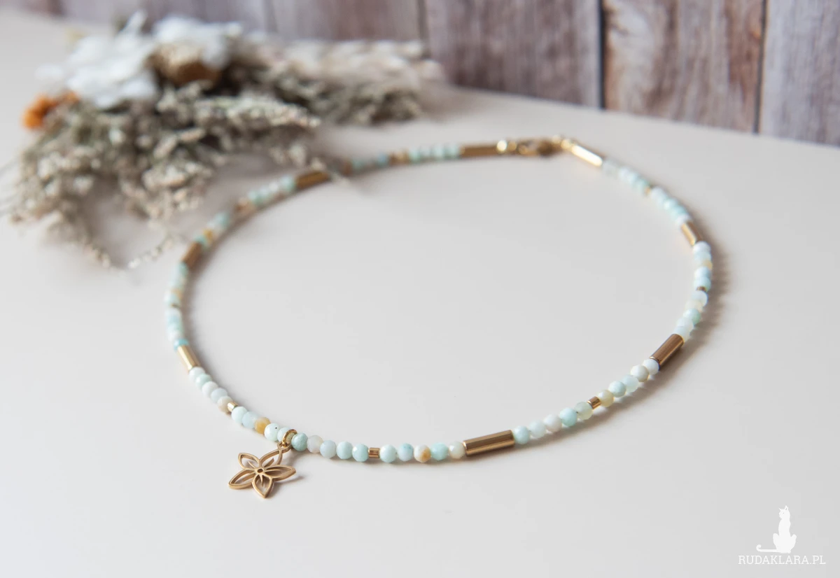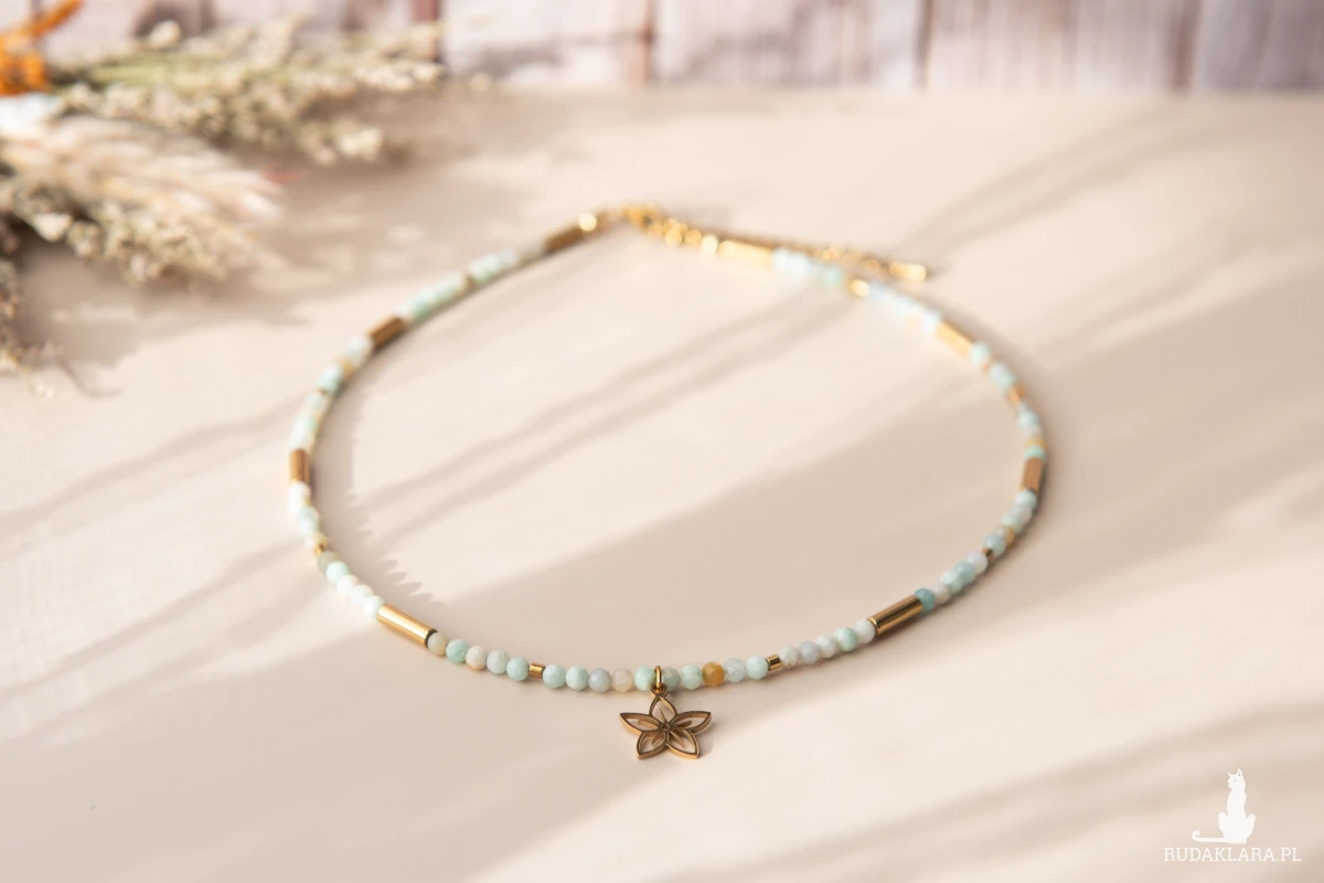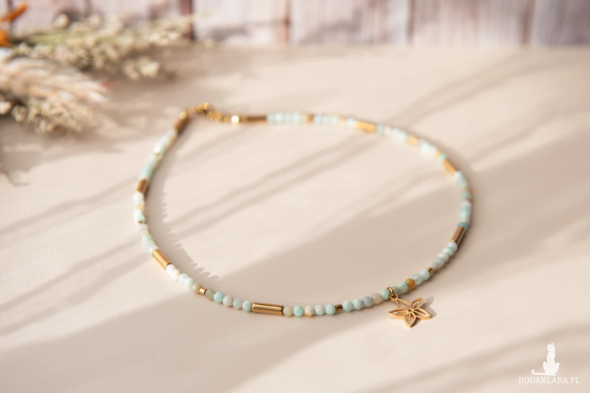 Ręcznie wykonany naszyjnik choker z kamieni: amazonit (3 mm) oraz hematyt (złocony, w formie walców) i z elementów ze stali nierdzewnej.