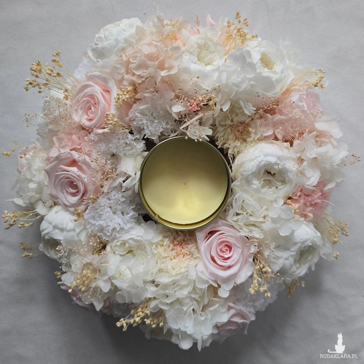 Delikatny wianek w odcieniach bieli i pudrowego różu, wykonany z naturalnych kwiatów stabilizowanych 🌸