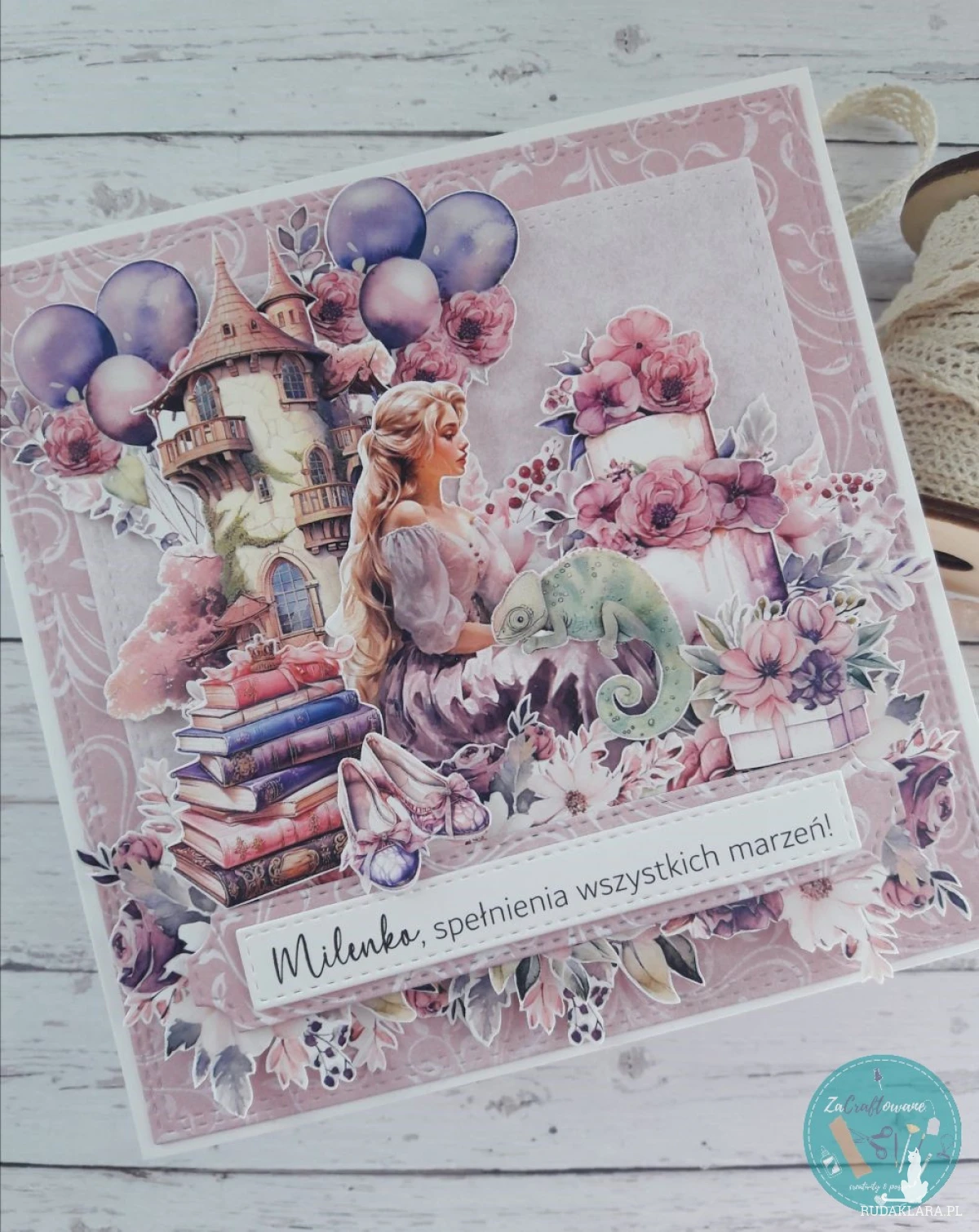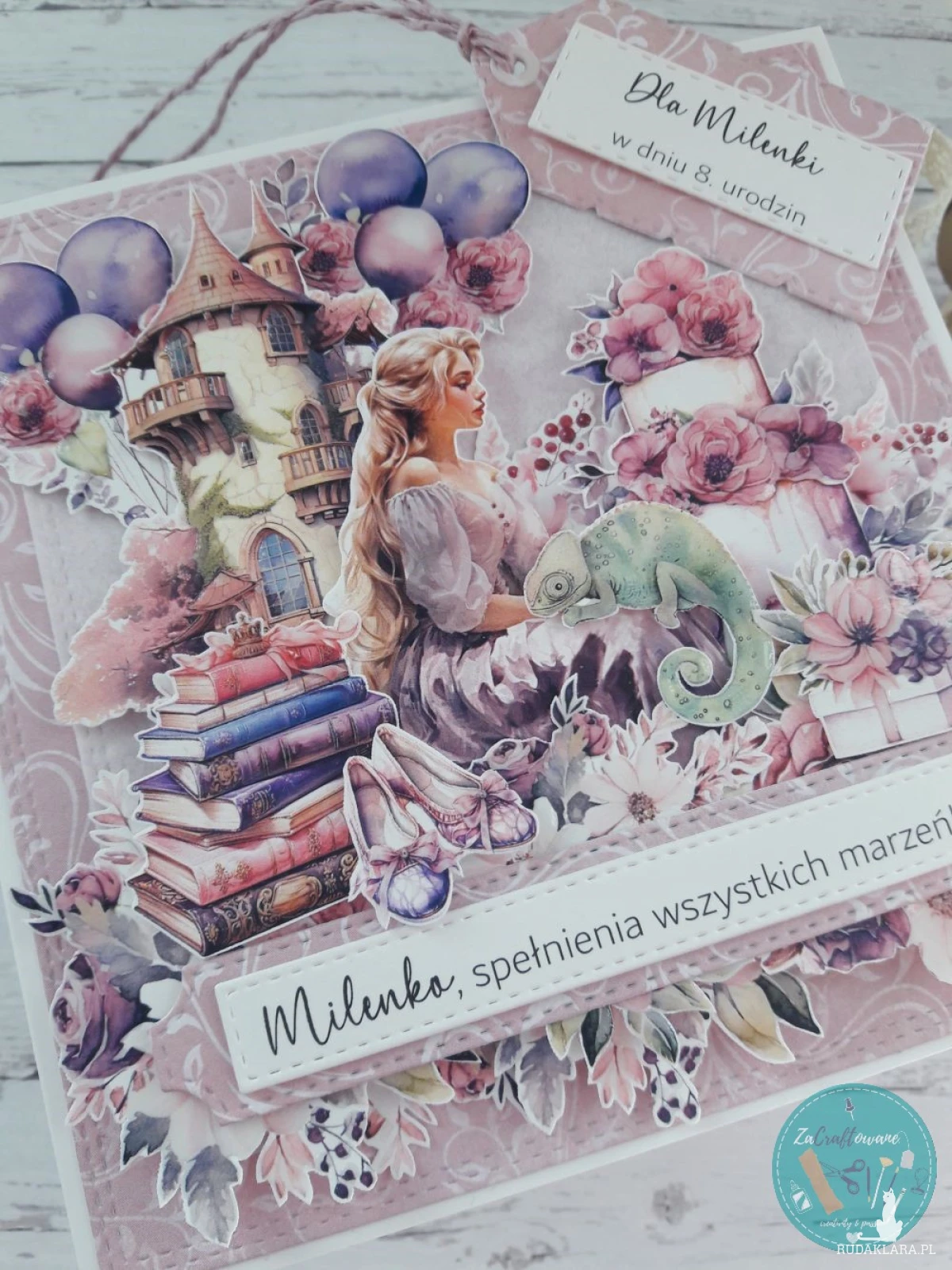 Motywem głównym kartki jest Roszpunka, na kolanach której siedzi jej ukochane zwierzątko - kameleon. W oddali widać wieżę udekorowaną balonami i przygotowaną na świętowanie urodzin wraz z solenizantką.