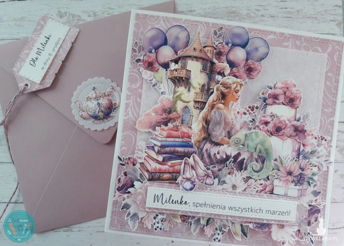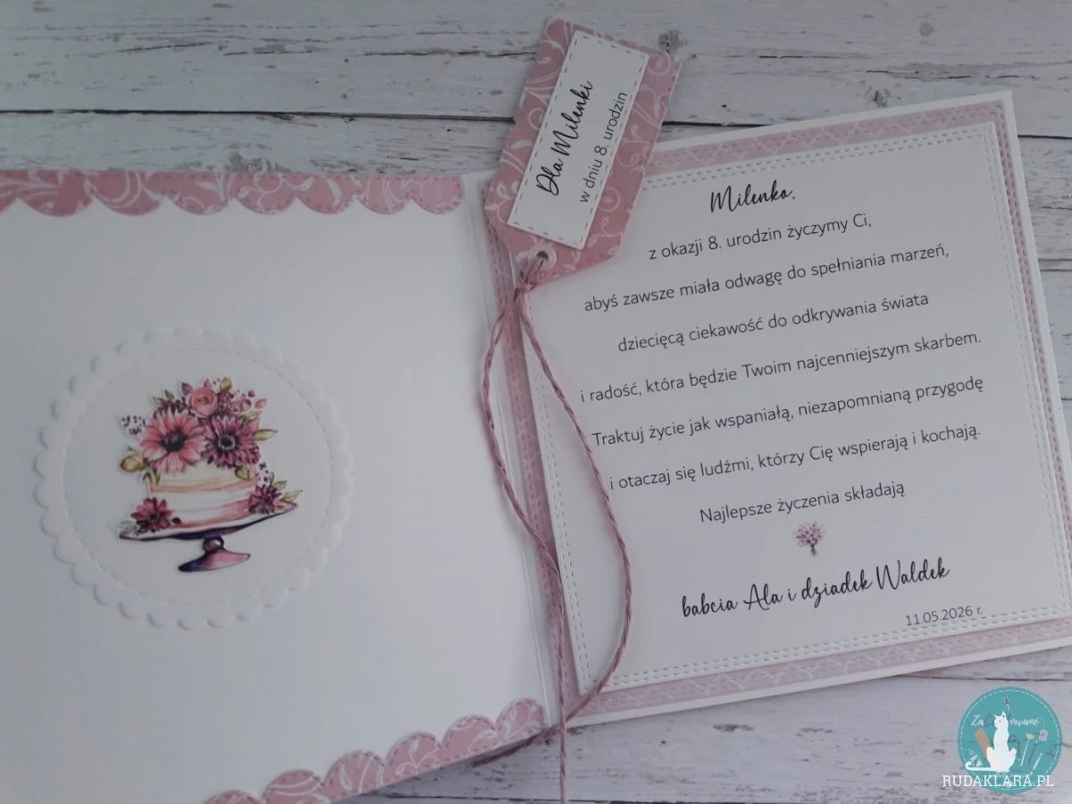 Ręcznie robiona kartka urodzinowa dla dziewczynki wykonana metodą scrapbookingu z wykorzystaniem profesjonalnych materiałów i z dbałością o każdy szczegół.