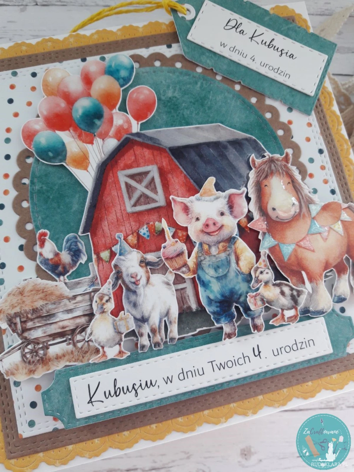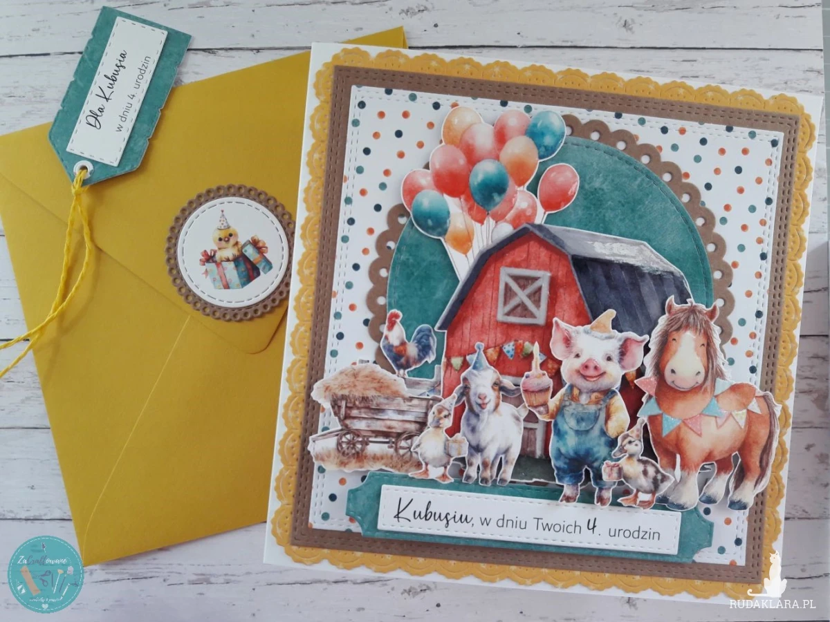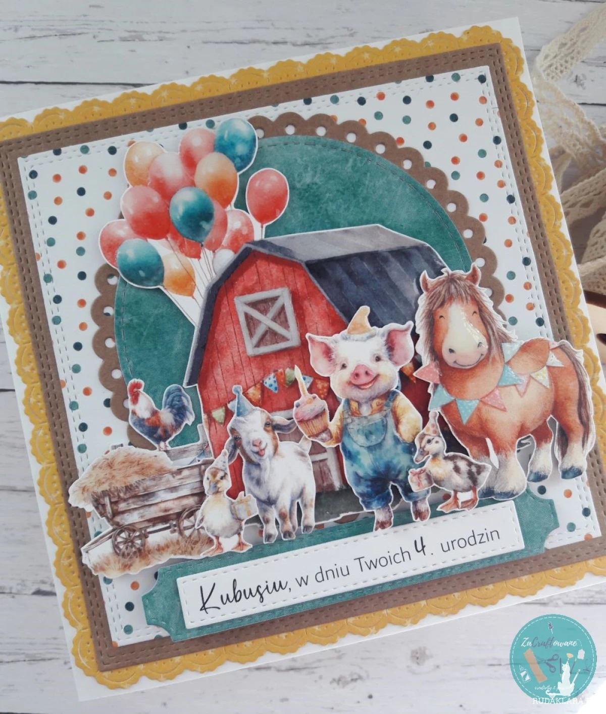 Motywem głównym kartki są zwierzątka gospodarskie na tle stodoły udekorowanej balonami, gotowe do świętowania urodzin wraz z małym solenizantem lub solenizantką.