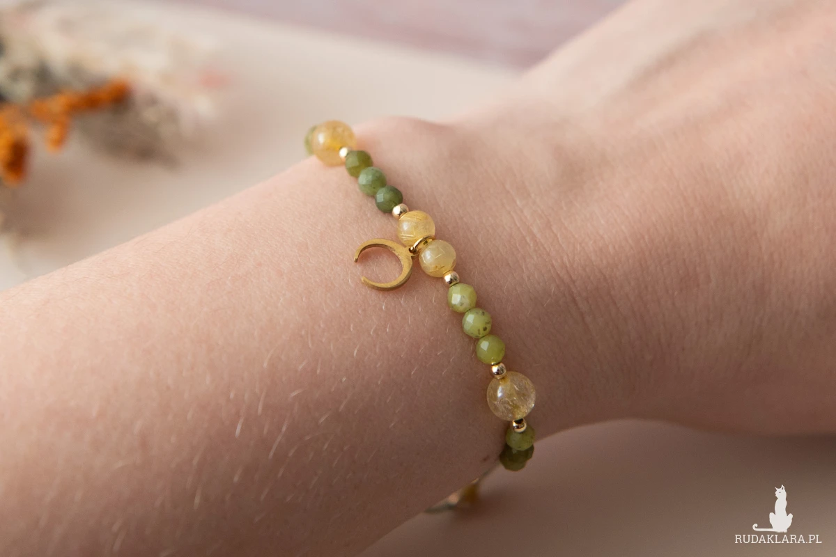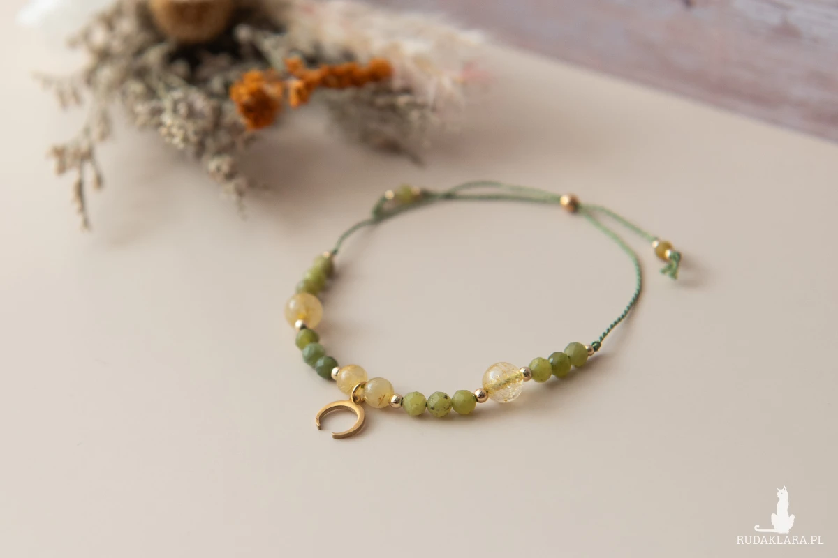 Bransoletka regulowana z kamieni - jadeit kanadyjski i kwarc z rutylem oraz z elementów ze stali nierdzewnej, regulowana, na mocnym sznurku nylonowym.