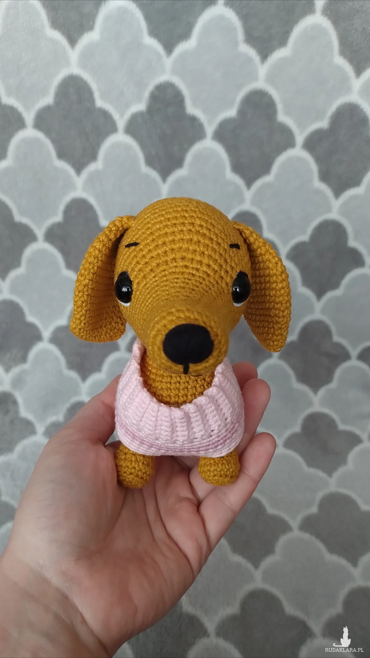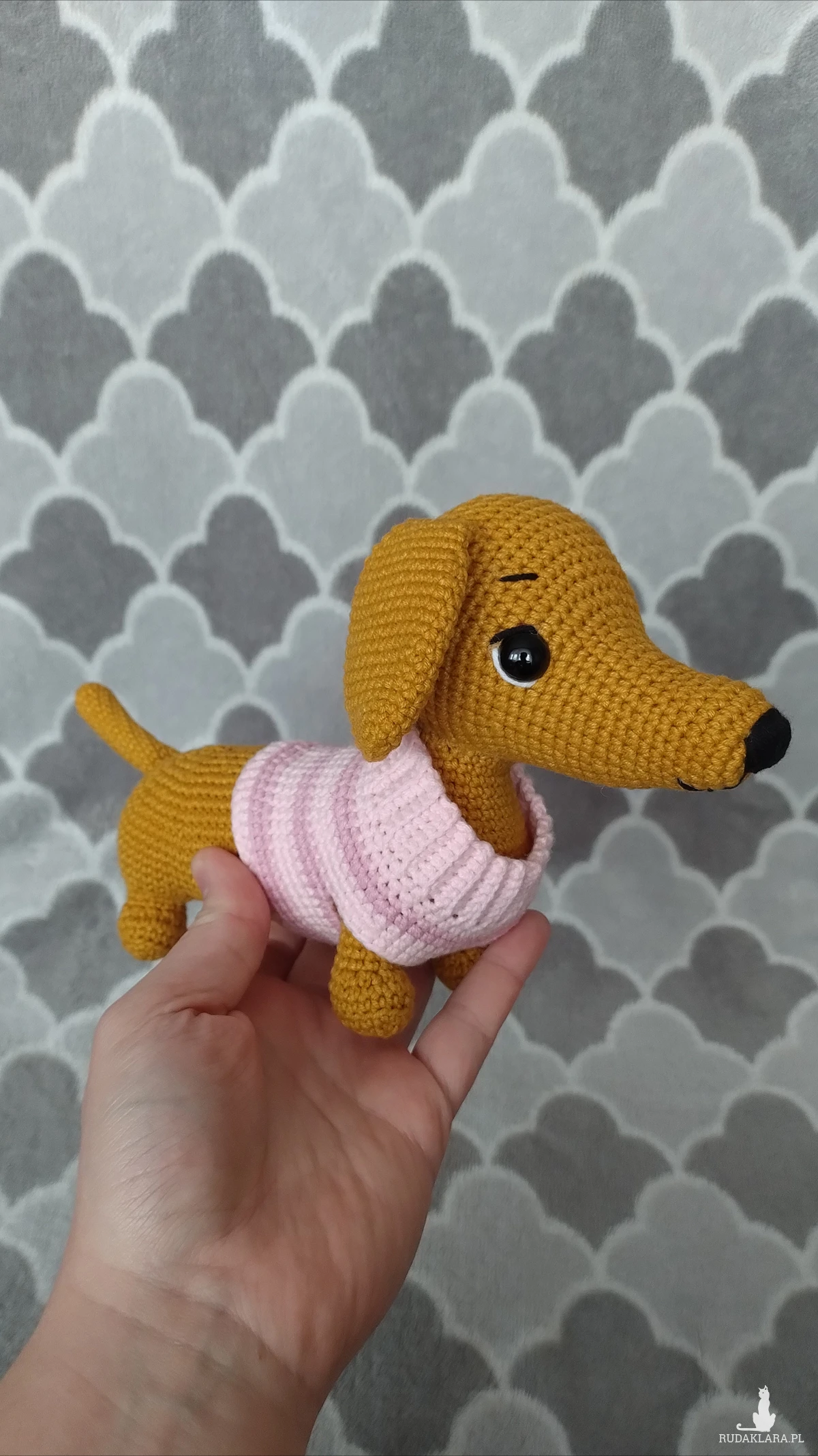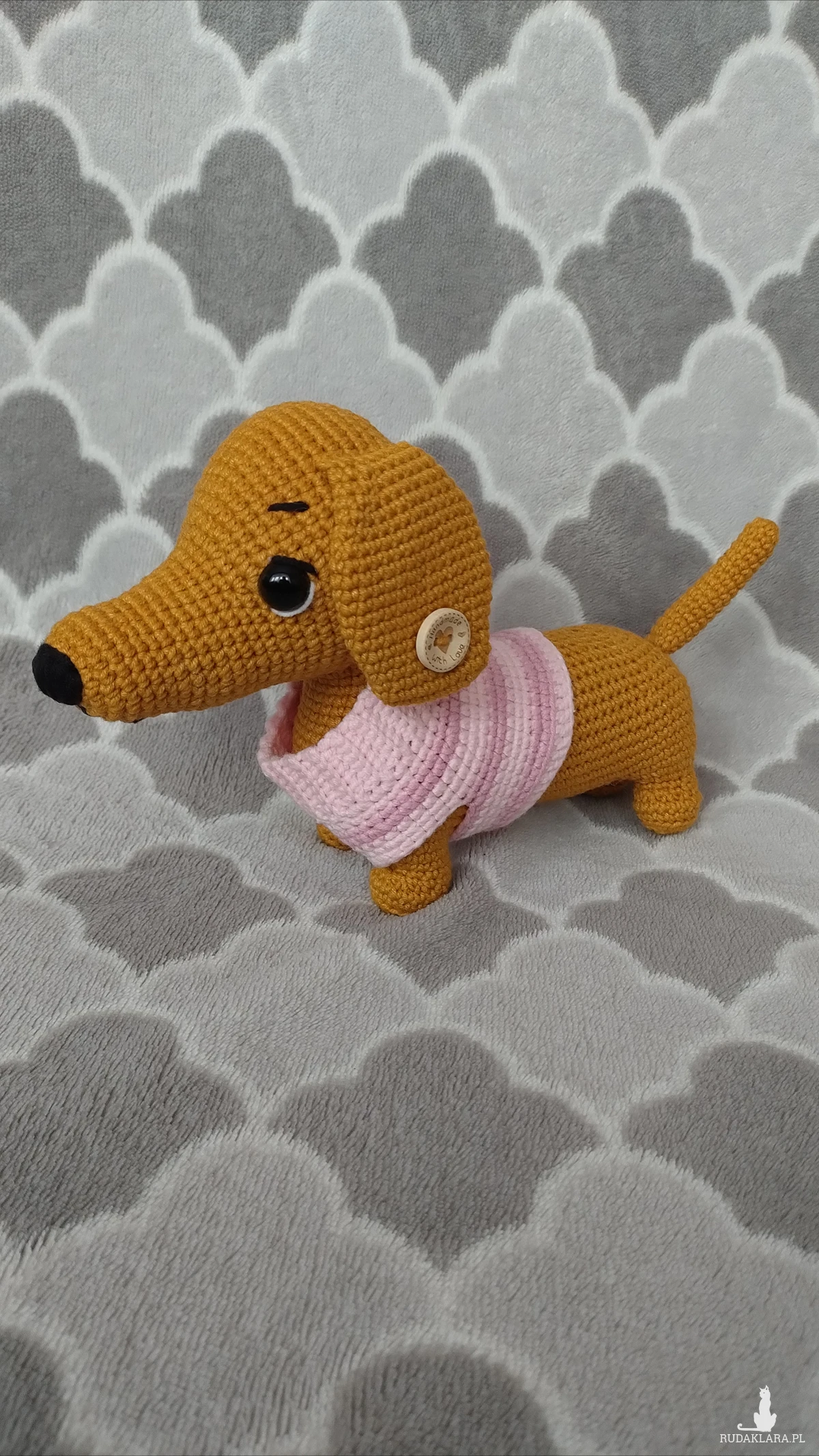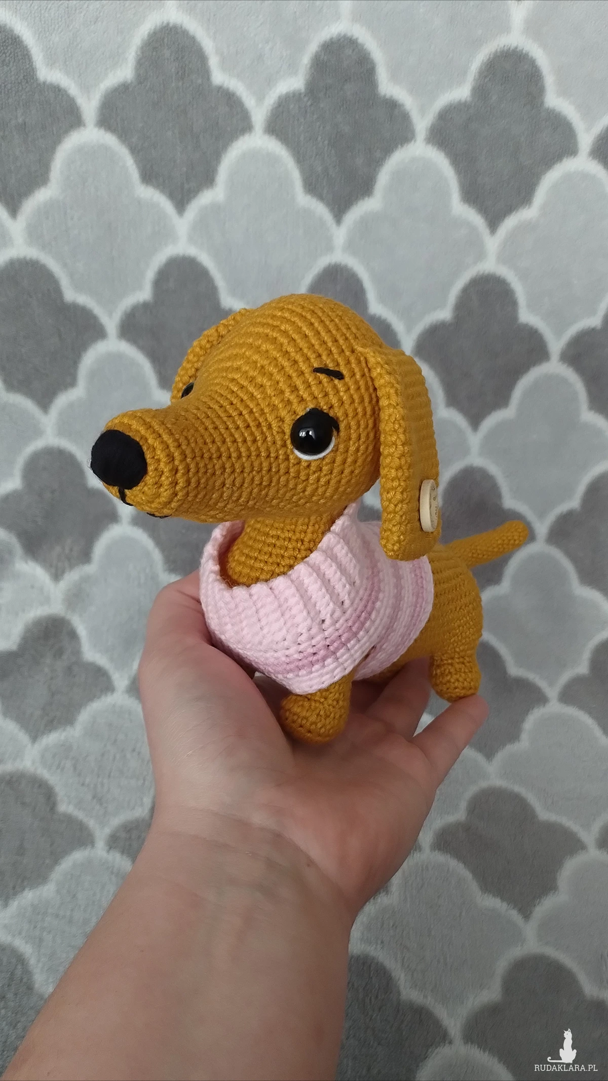 Jamnik wykonany na szydełku z włóczki Yarn Art Jeans. Wysokość około 14 cm, długość około 19 cm.