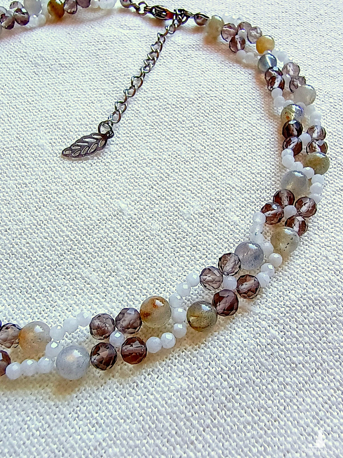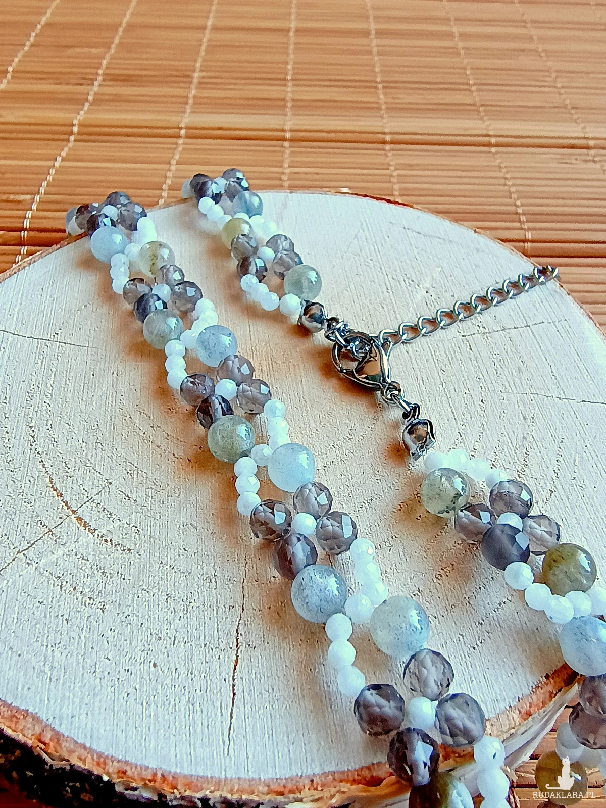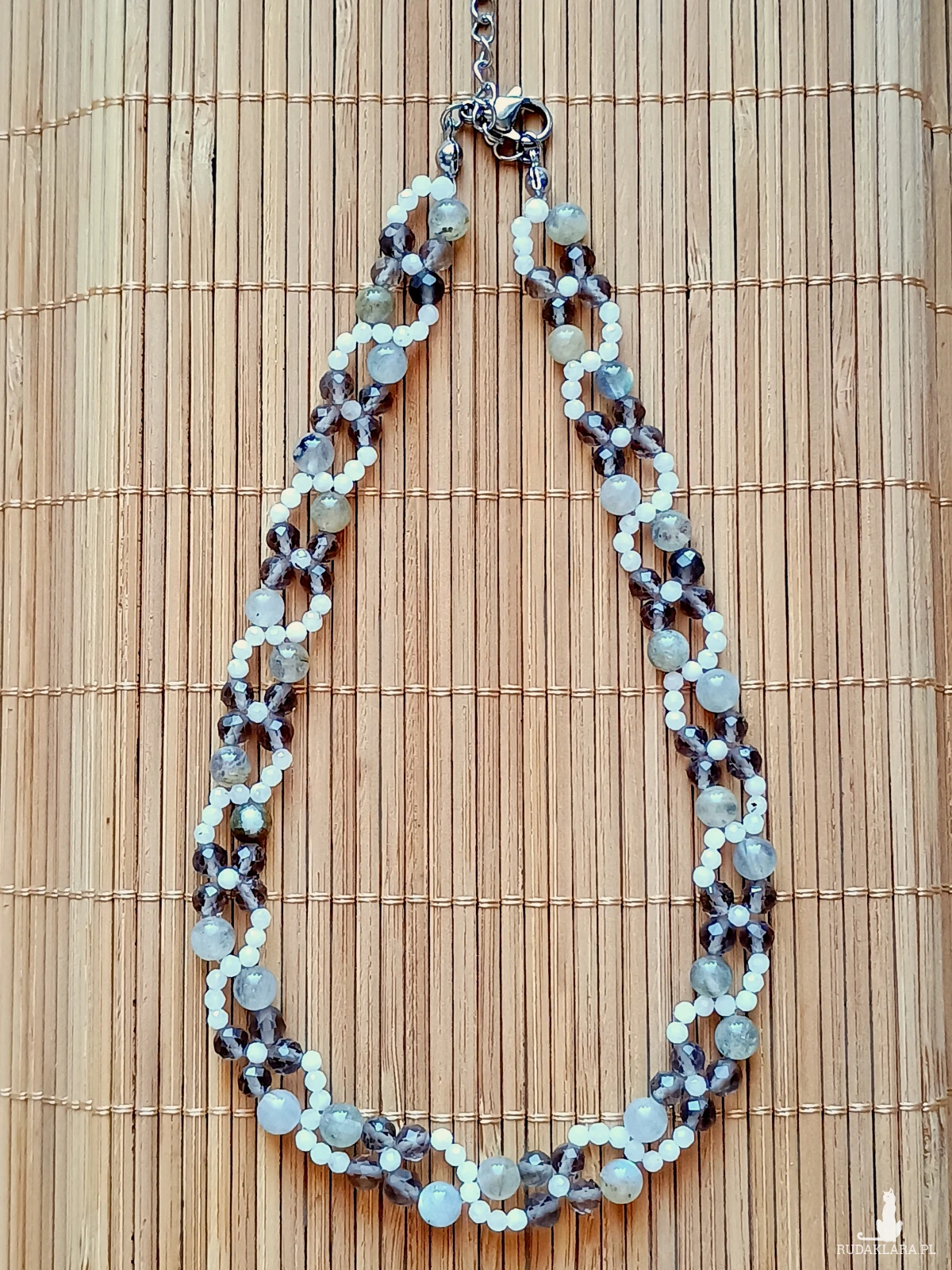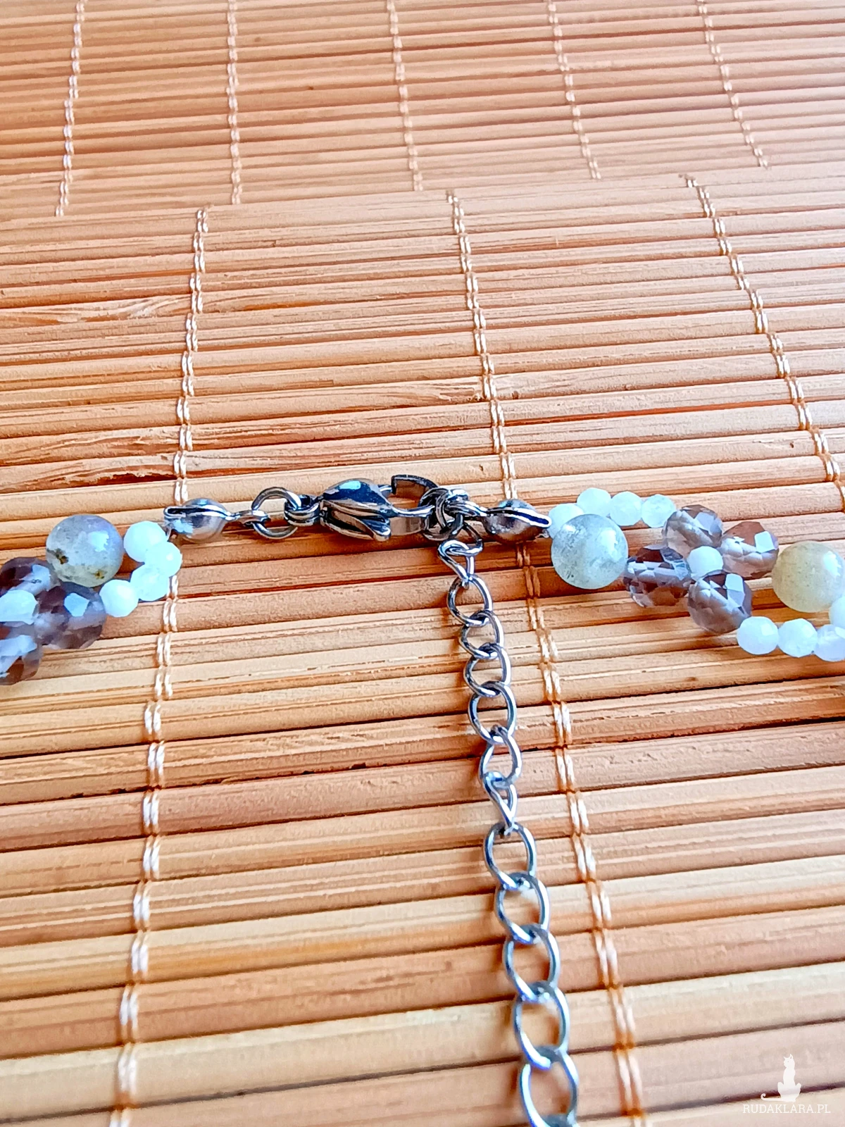 Kamień księżycowy (2 mm, fasetowany): Esencja kobiecej energii i intuicji. Rozświetla naszyjnik swoim tajemniczym blaskiem, niczym drobne iskierki na skrzydłach ptaka.