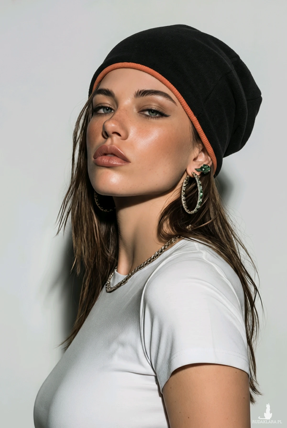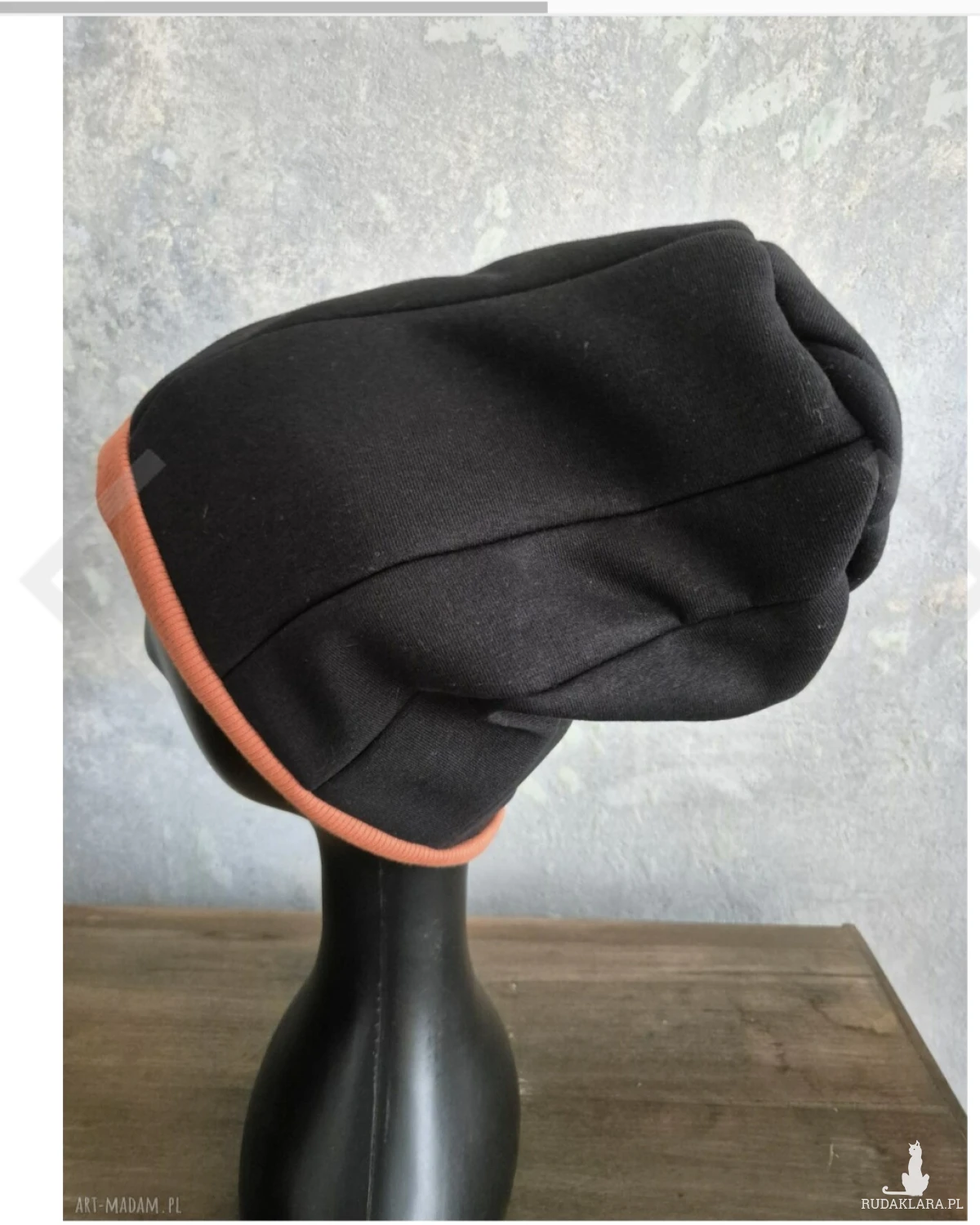 Czapka damska wiosenna uniwersalna czarna Smerfetka z pomarańczowym dołem polecam box g1