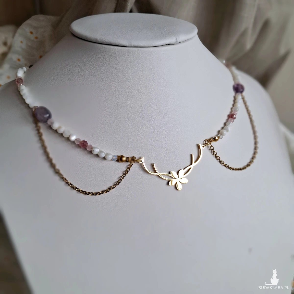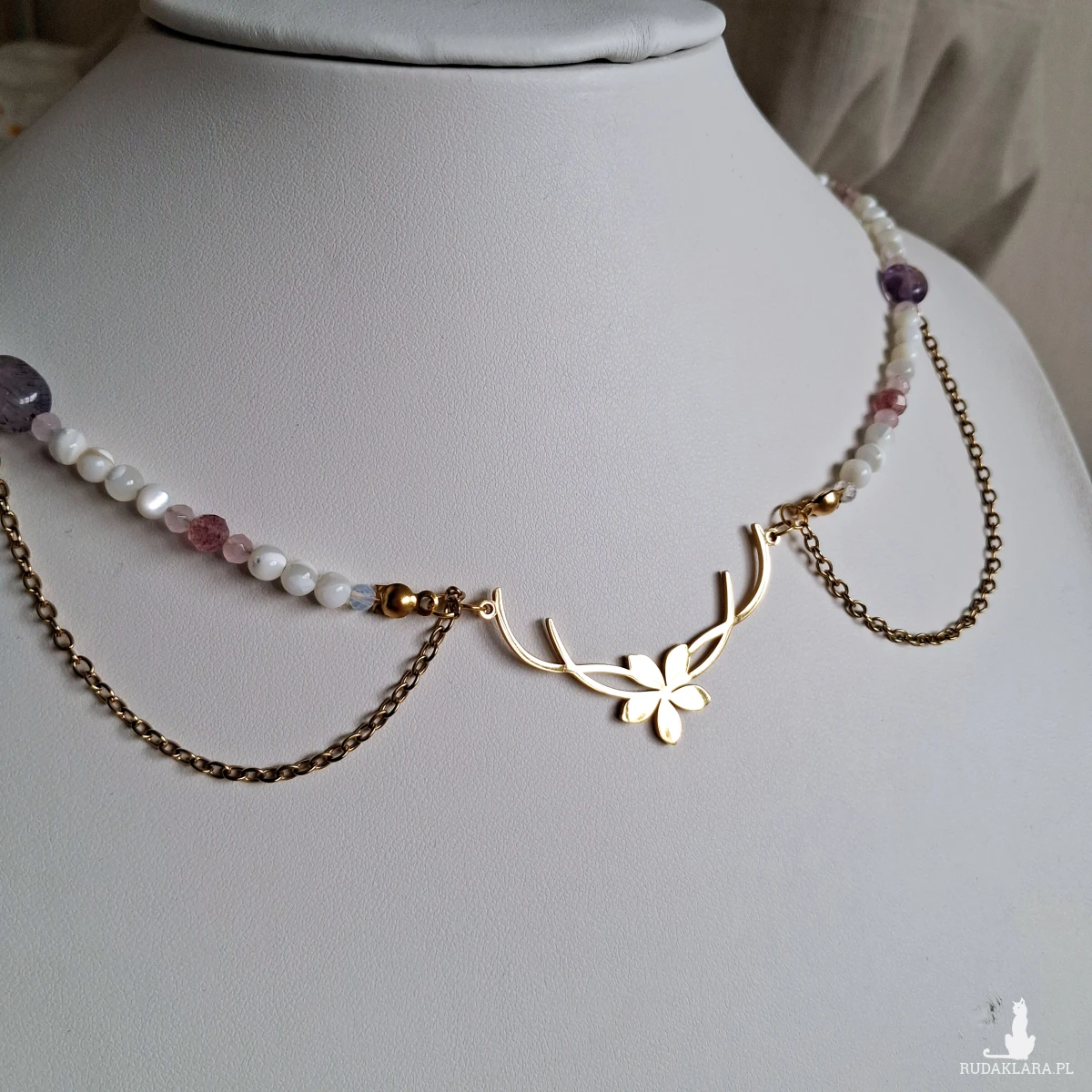 Naszyjnik/choker wykonany z kamieni, stali nierdzewnej jubilerskiej oraz szklanych i akrylowych koralików. Użyte kamienie: