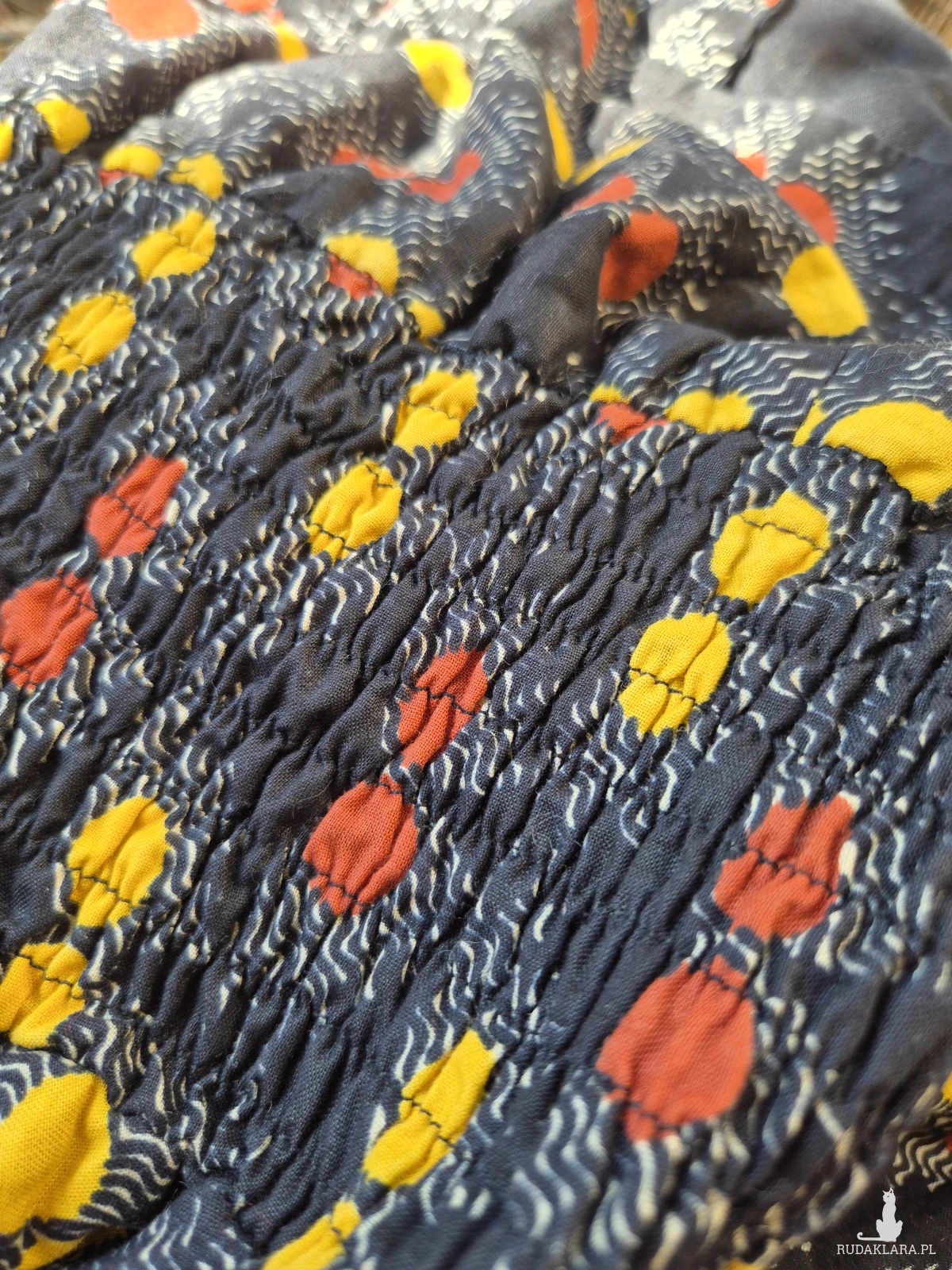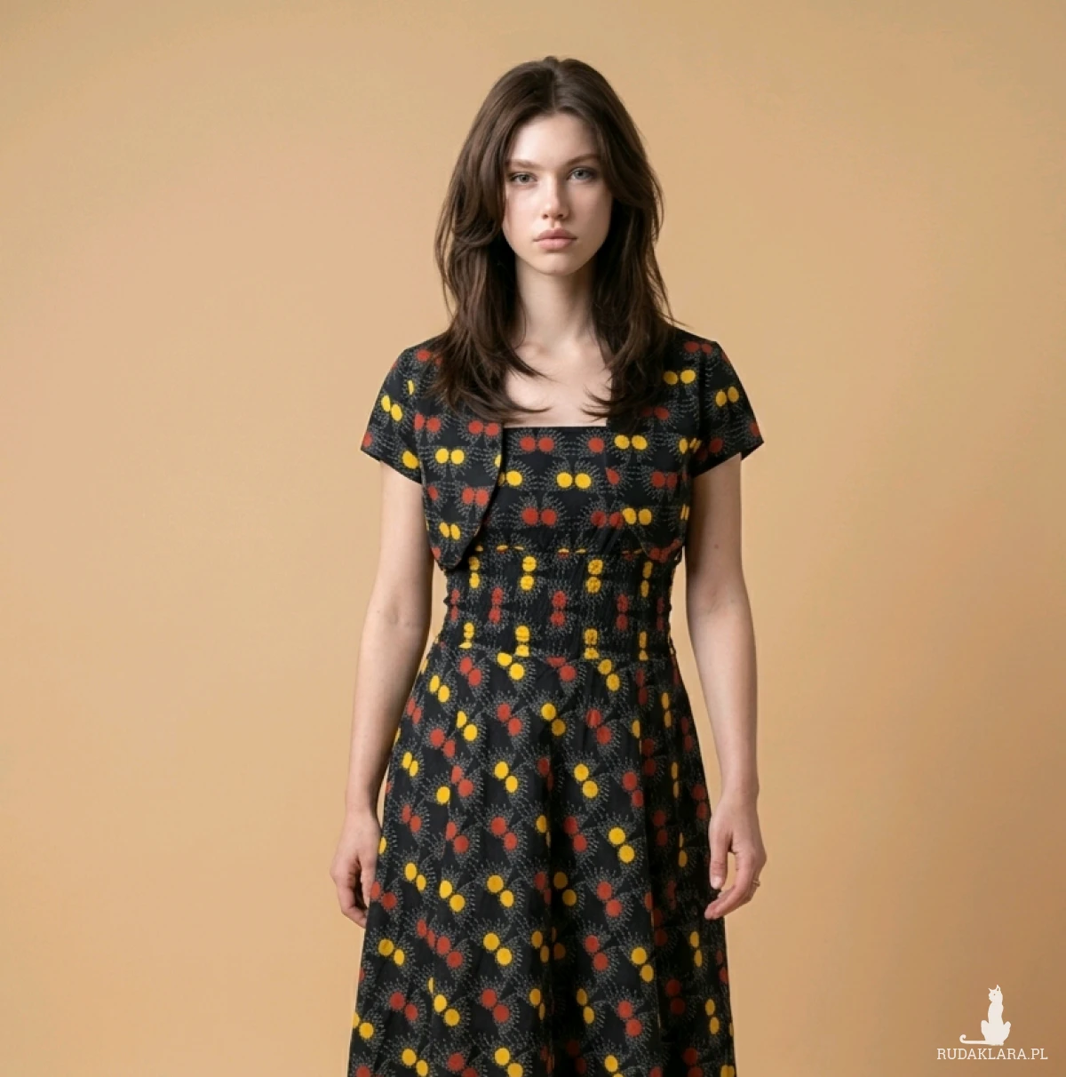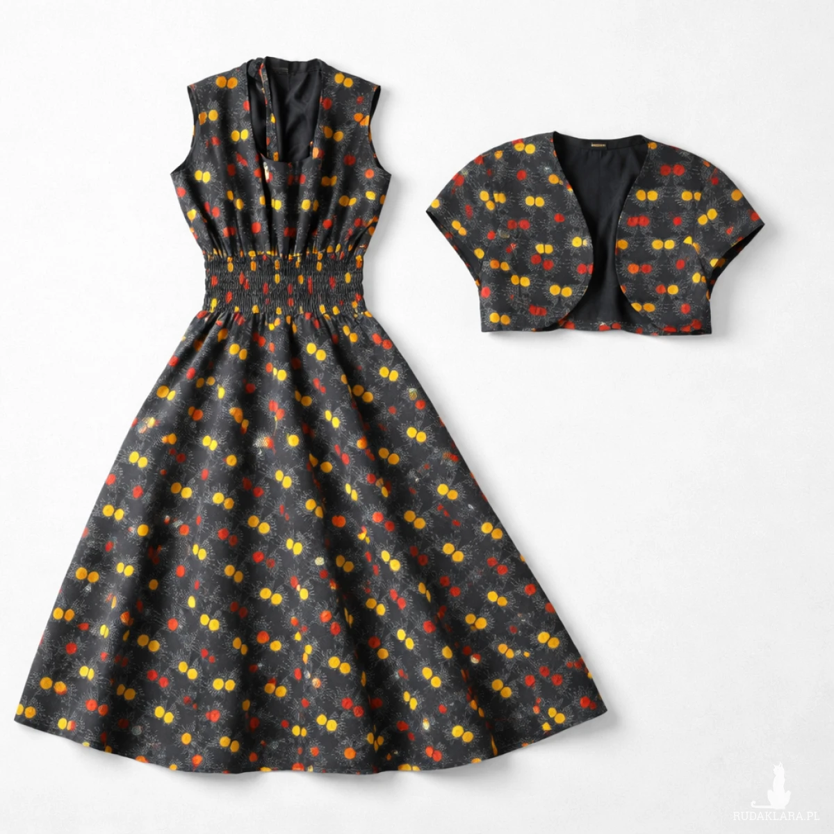 Sukienka rozmiar 36 I kubraczek w tym samym rozmiarze prawdziwe retro sukienka jest bawełniana na podszewce, długość całości sukienki 139 cm odległość pacha pacha mierzone na płasko 46 cm w pasie gumka mierzona na płasko 32 cm rozciąga się do 80 cm biodra luźne komplet obłędny polecam