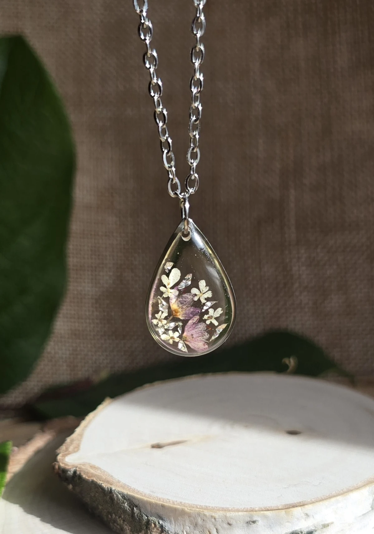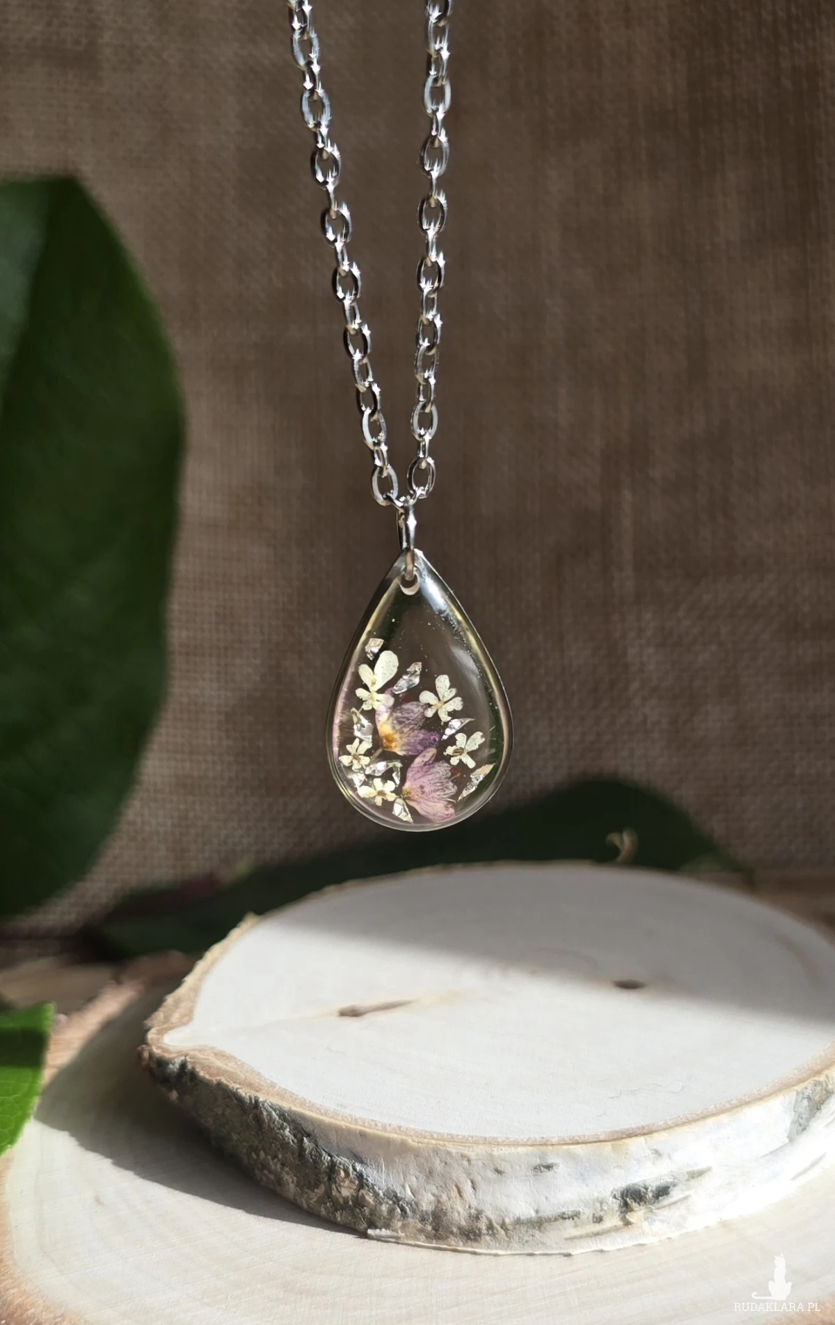 Oferuję Państwu unikalną biżuterię. Zawieszka jest wykonana z suszonych kwiatów i żywicy epoksydowej. Biżuteria jest wspaniałym i oryginalnym prezentem na lata.