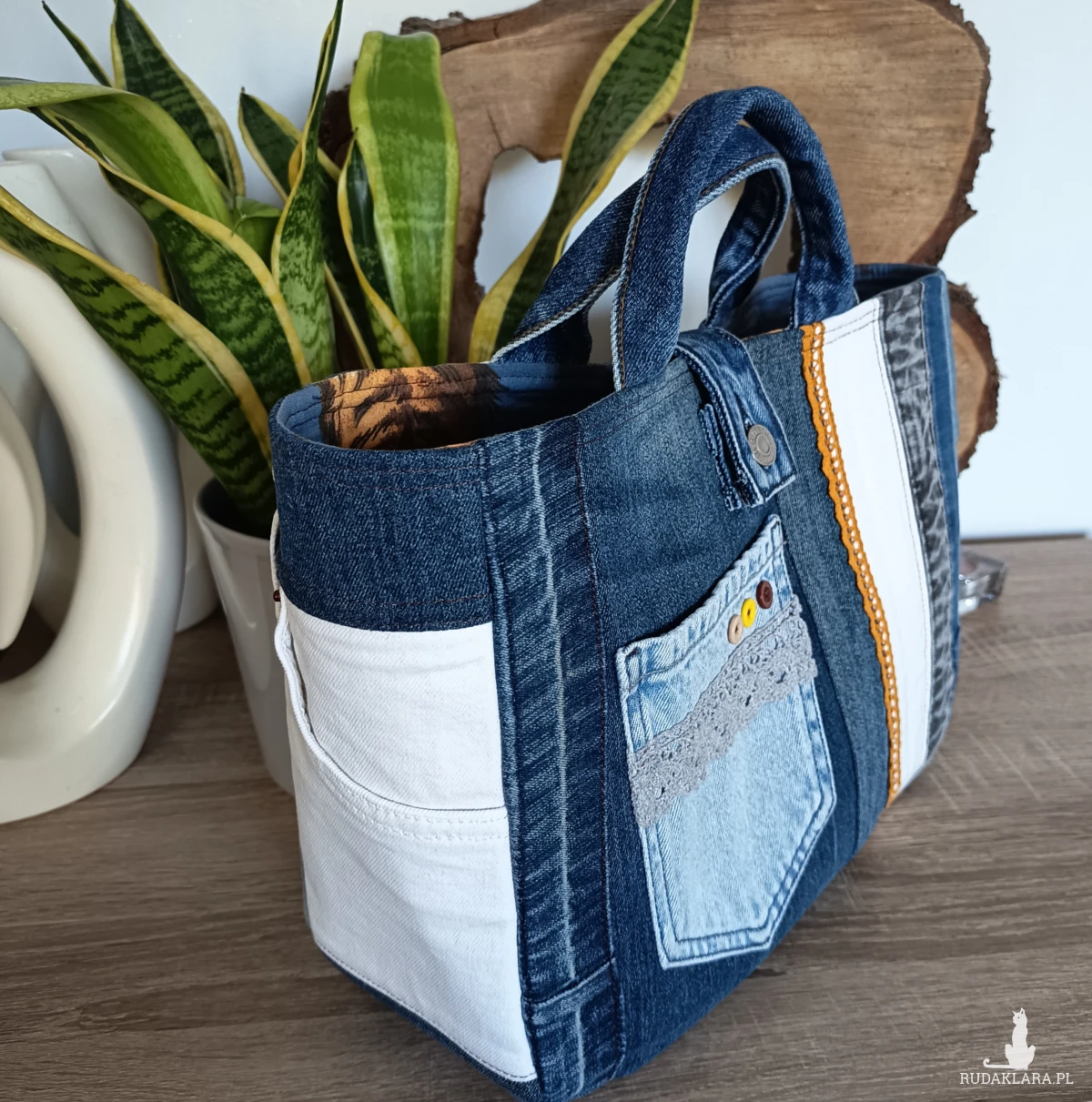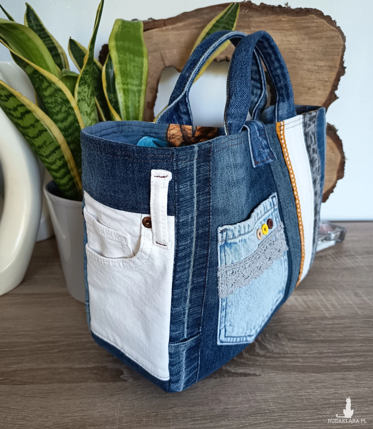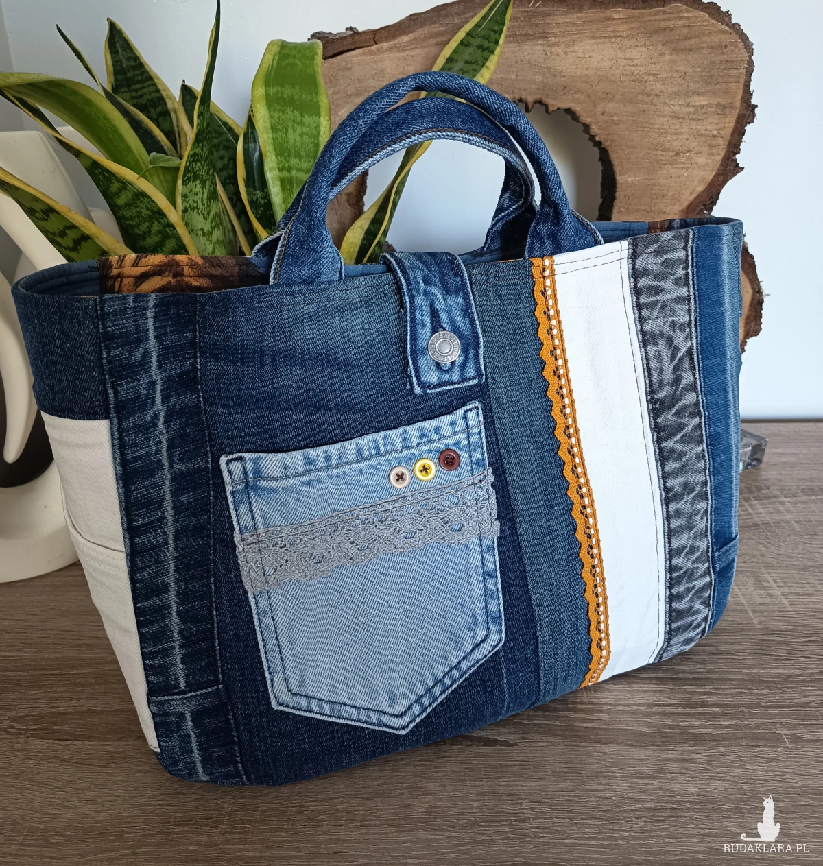 Torebka zamykana jest na guzik - z oryginalnego paska jeansowego.