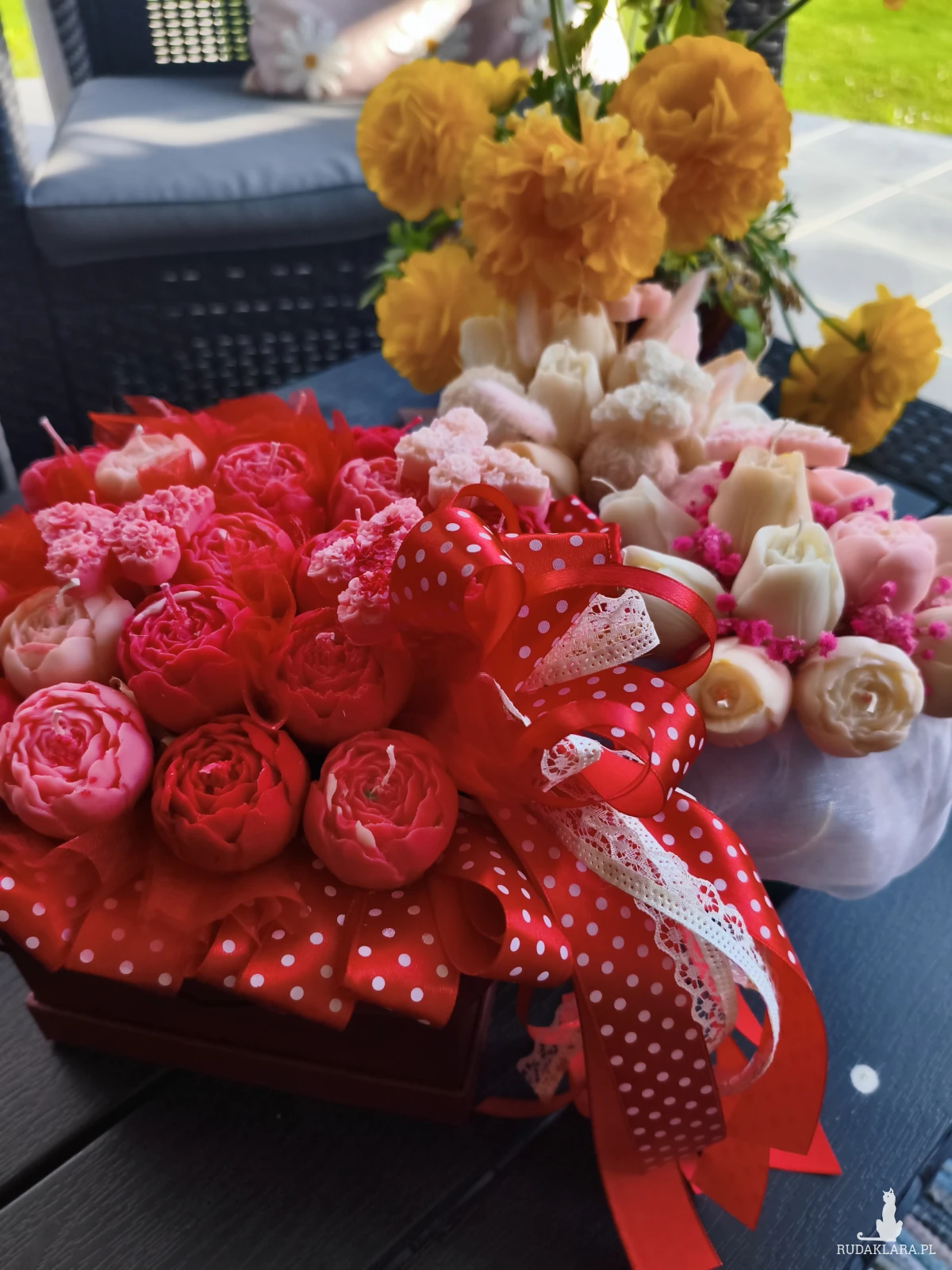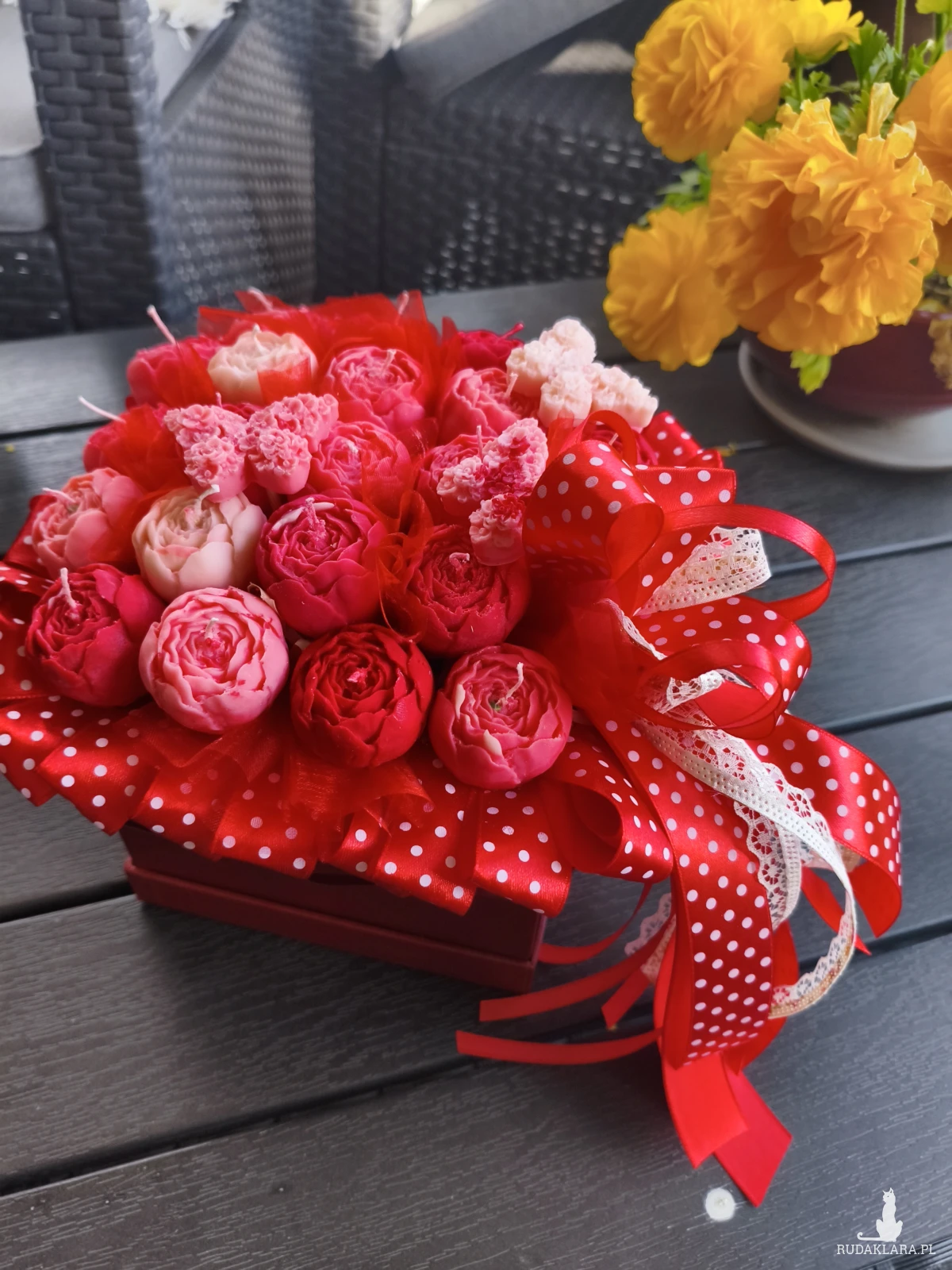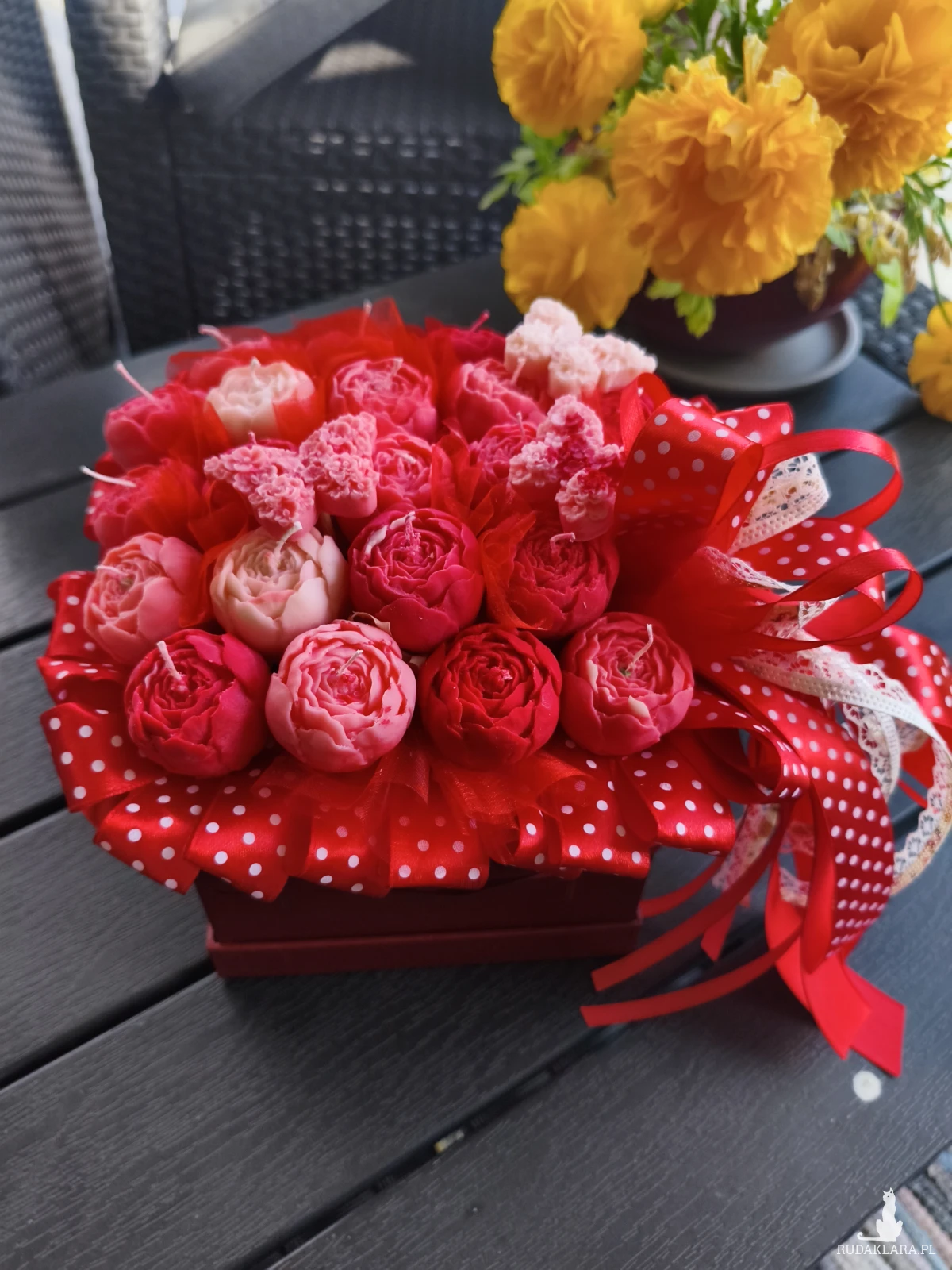 Flower Boxowi, w którym znajdziesz ręcznie robione świece wykonane z naturalnego wosku sojowego z przepięknym aromatem róży i piwonii z nutka maliny oraz starannie dobrane dodatki. Idealny na urodziny, rocznice, ślub, walentynki, dzień kobiet, chrzest, komunię czy jako podziękowanie – Flower Box łączy piękno natury z delikatnym aromatem, tworząc niezapomniane wrażenia. Świece wykonane są z naturalnego wosku sojowego oraz bawełnianego knota.