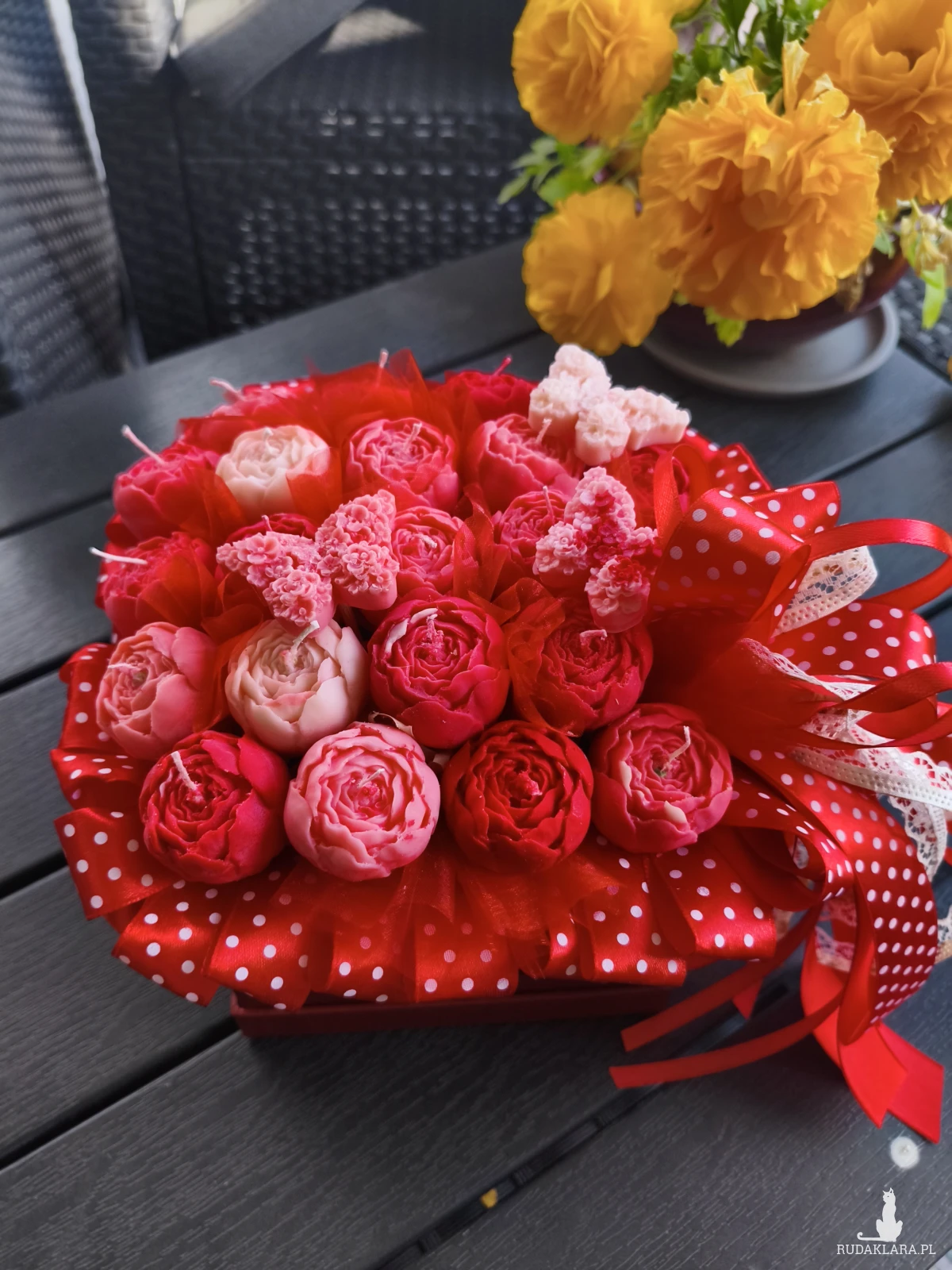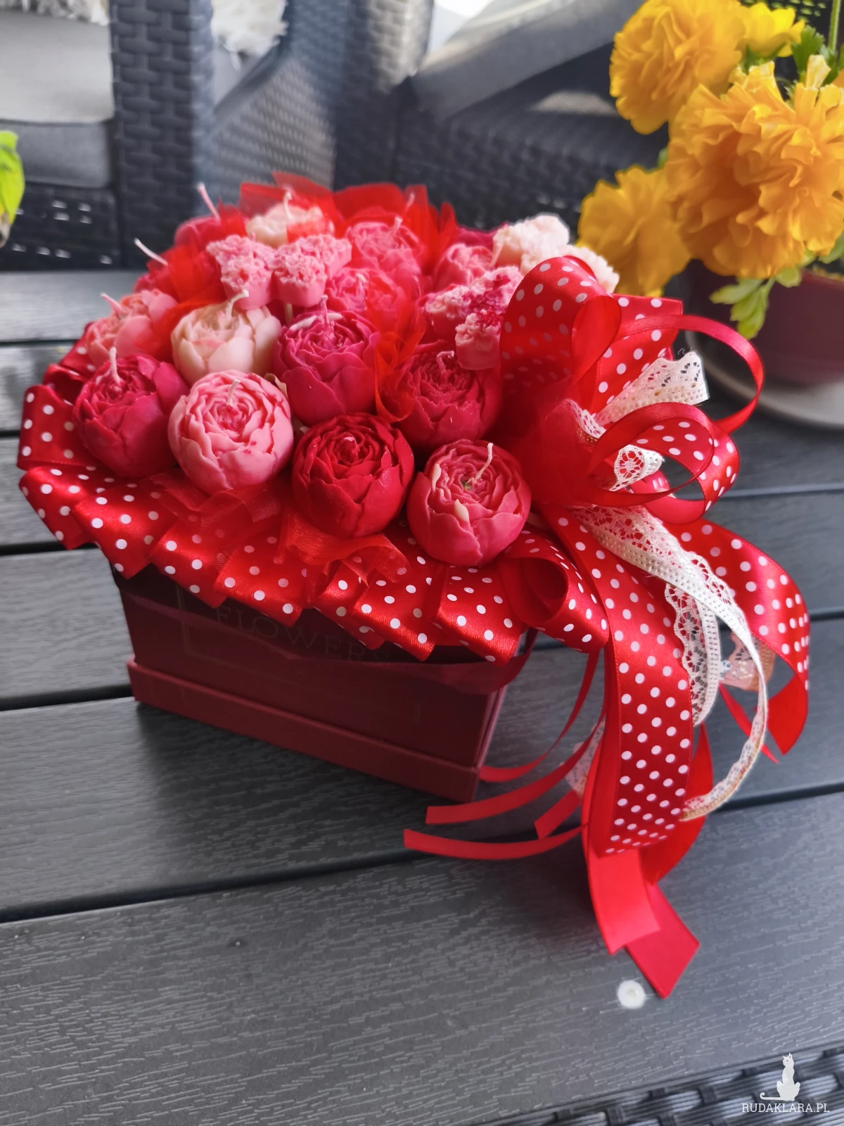 Flower box zawiera główki kwiatów które po wyciągnięciu z bukietu można zapalić. Flower box wysyłam zapakowany w celofan, wstążkę i bukiecik ze suszu oraz instrukcją palenia świec - gotowy do wręczenia jako prezent.