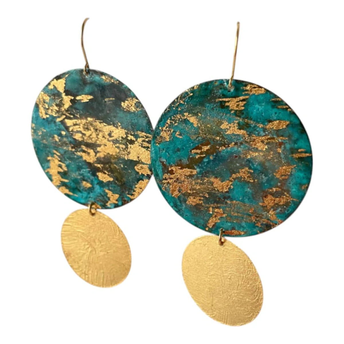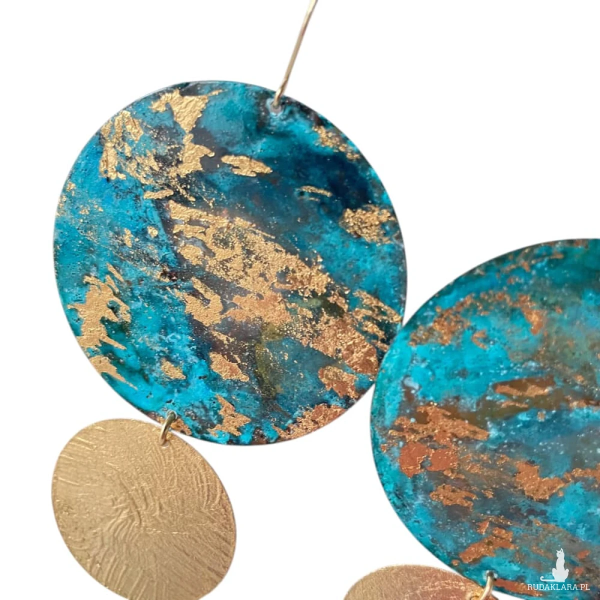 To model, w którym chłodne i ciepłe tony spotykają się w jednej formie. Górna część z patynowanej miedzi ma bogatą, wielobarwną powierzchnię z turkusami, zieleniami i złoceniami, a dolne koło z mosiądzu pozłacanego dodaje całości blasku.