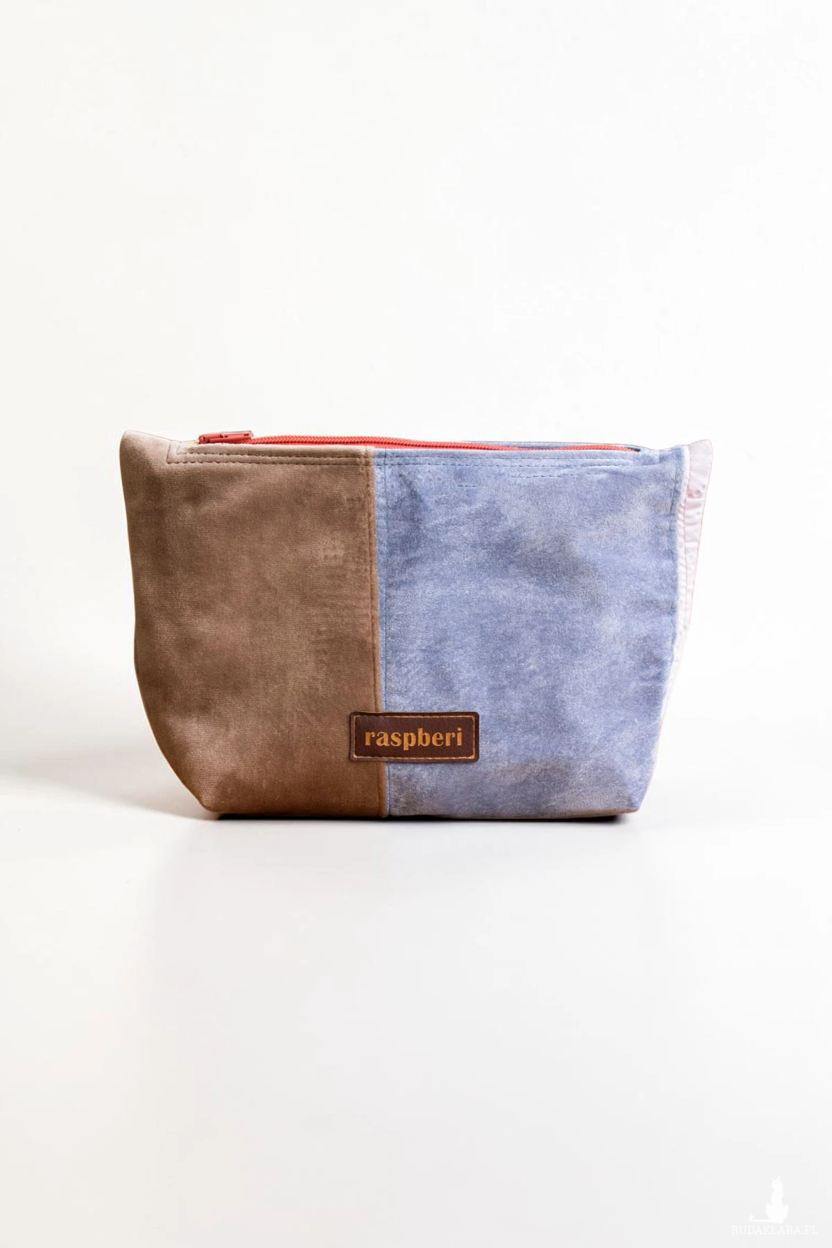 Duża kosmetyczka w kolorze brązowo-niebiesko-różowym. Stworzona w duchu no waste.