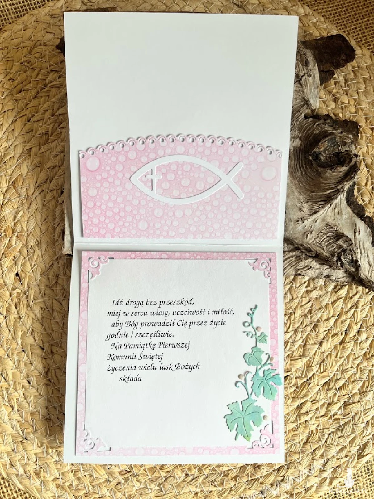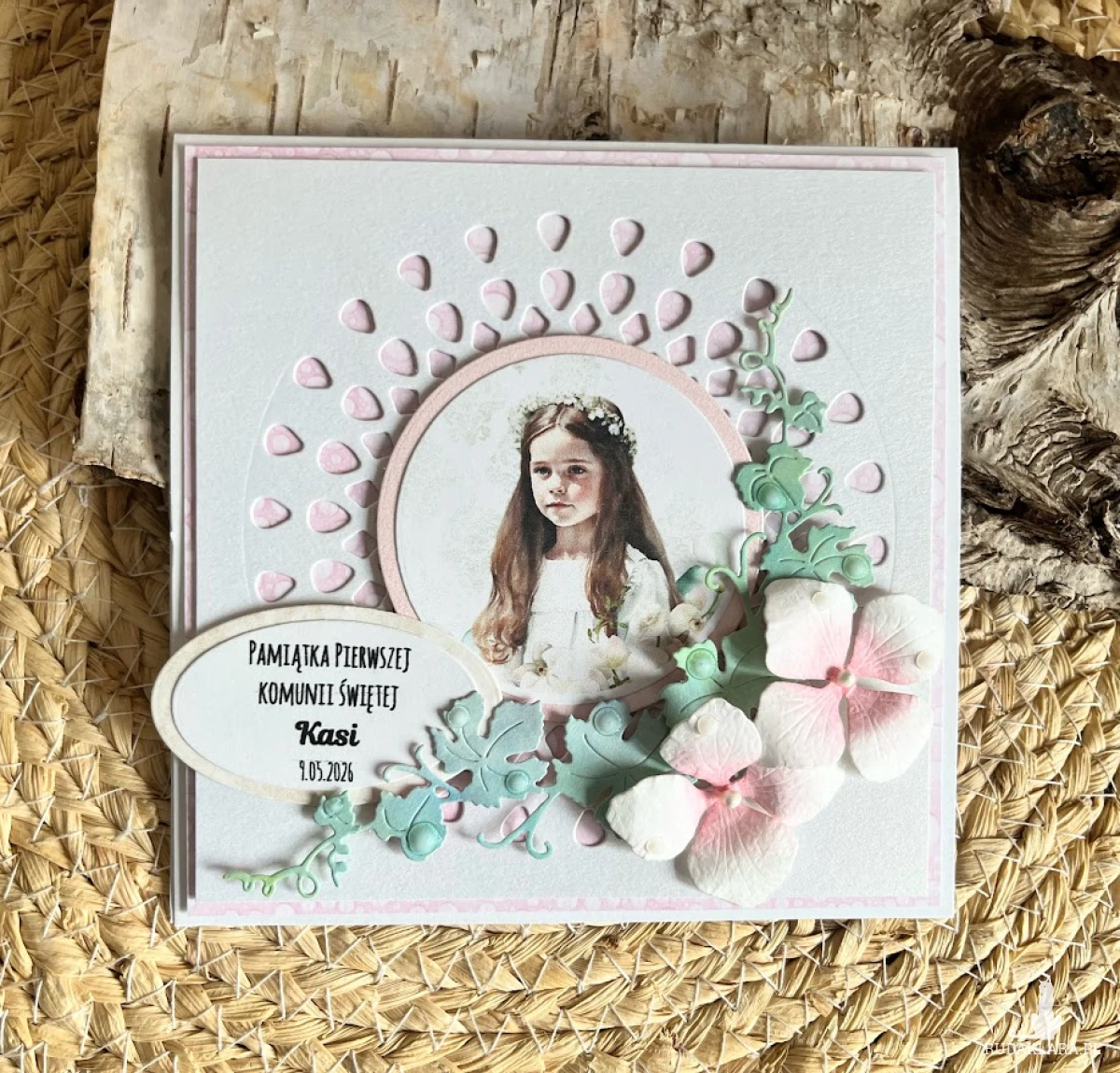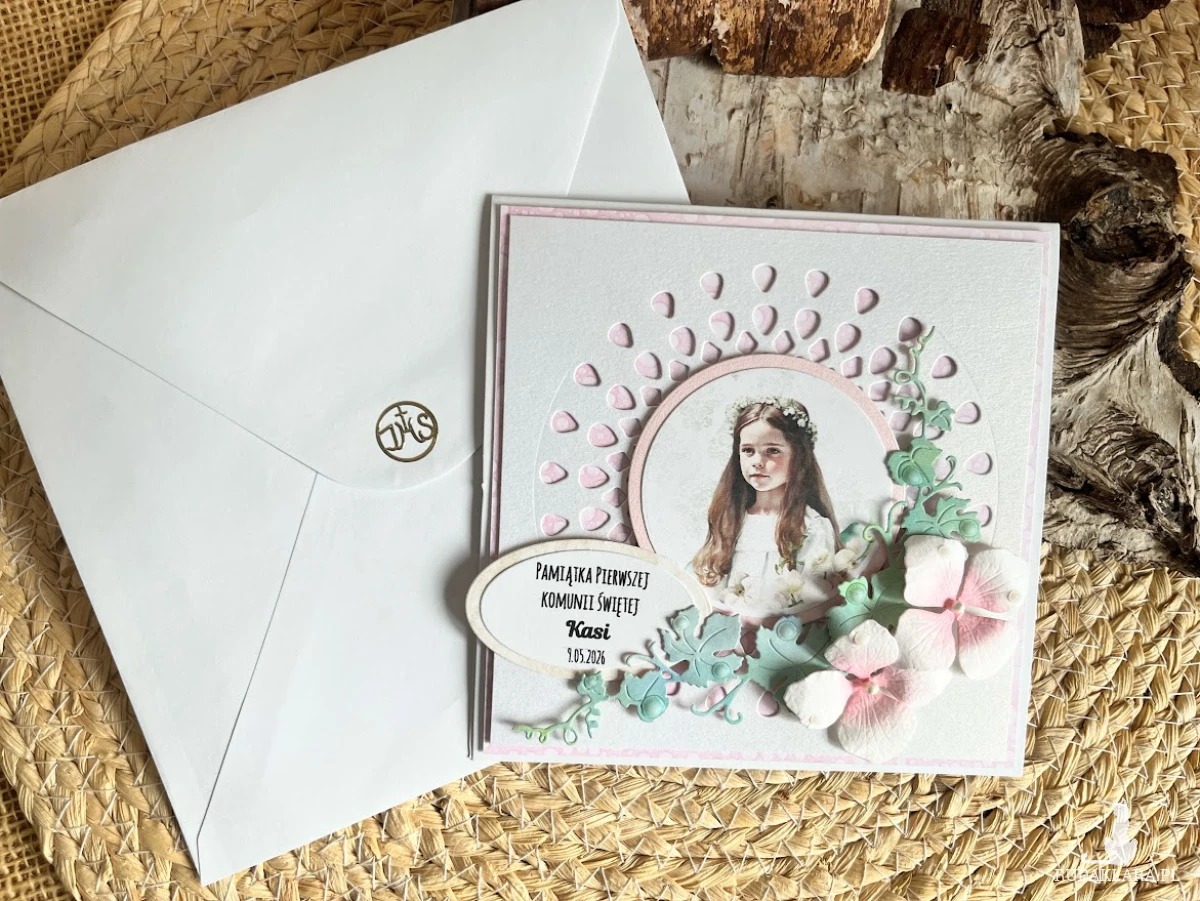 Elegancka, umiarkowanie zdobiona kartka z okazji Pierwszej Komunii Świętej. Utrzymana w różowo-perłowej kolorystyce. Ozdobiona postacią dziewczynki i kwiatów. Kartka jest w całości wykonana ręcznie z najlepszej jakości materiałów do scrapbookingu. Wielkość kartki 13,0 x 13,0cm. wewnątrz kartki umieszczono gotowe życzenia do własnoręcznego podpisu oraz kieszonka na małe co nieco, Do kartki dołączono białą kopertę o wymiarach 15,5x15,5 cm ozdobioną symbolem IHS. jest możliwość dodania imienia i daty komunii,które zamieścić proszę w uwagach podczas zamawiania.