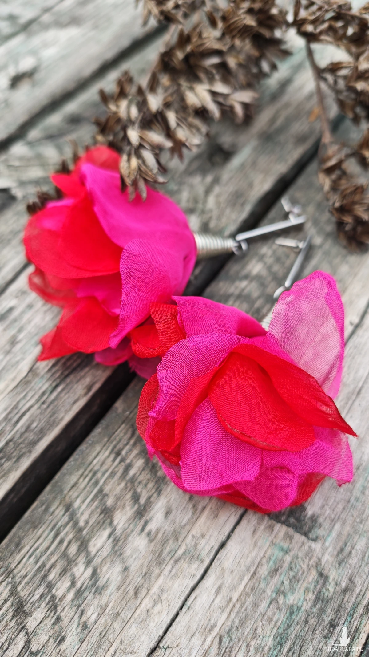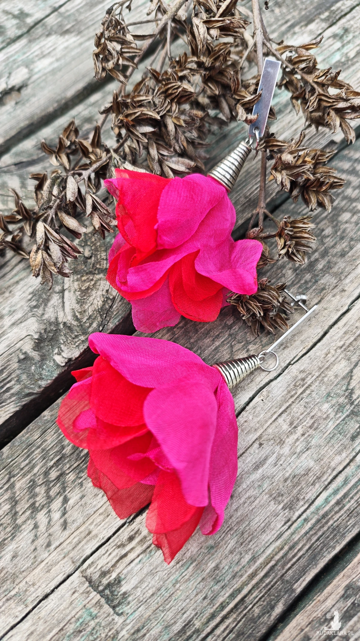 ,, baletnica w różu i czerwieni,, to zwiewne dwukolorowe kolczyki wykonane z dwukolorowego kwiatka z tiulu w kolorze czerwonym i różowym, a także z metalowych elementów w kolorze srebrnym. Kolczyki zawieszone są na ozdobnych biglach typu sztyft wykonanych ze stali szlachetnej.