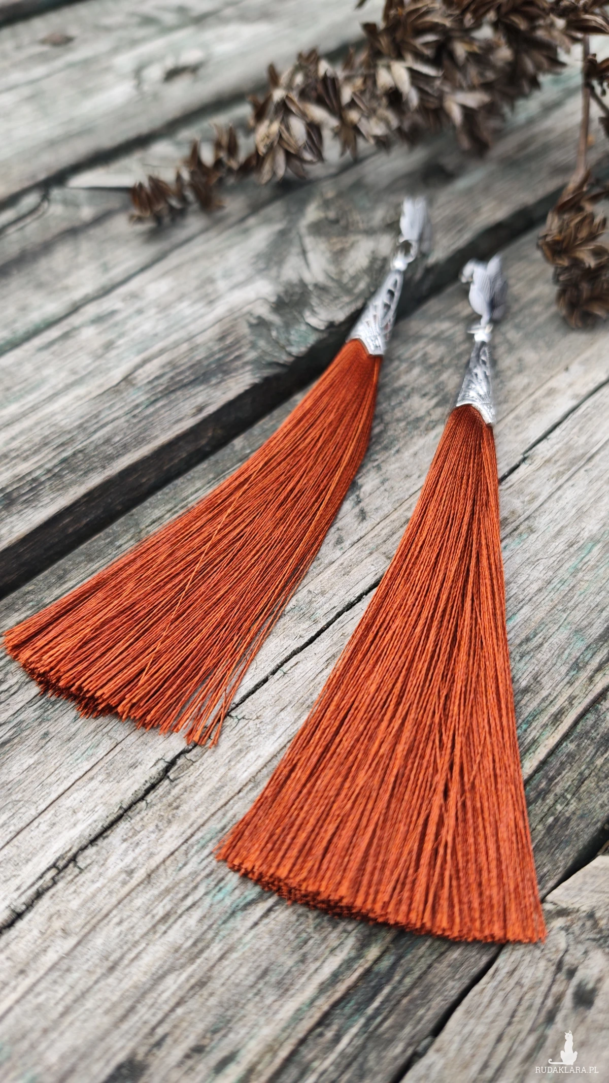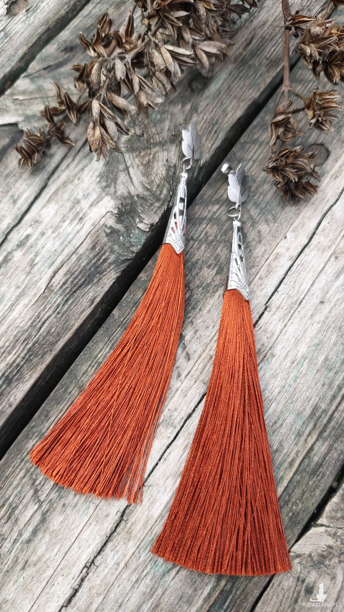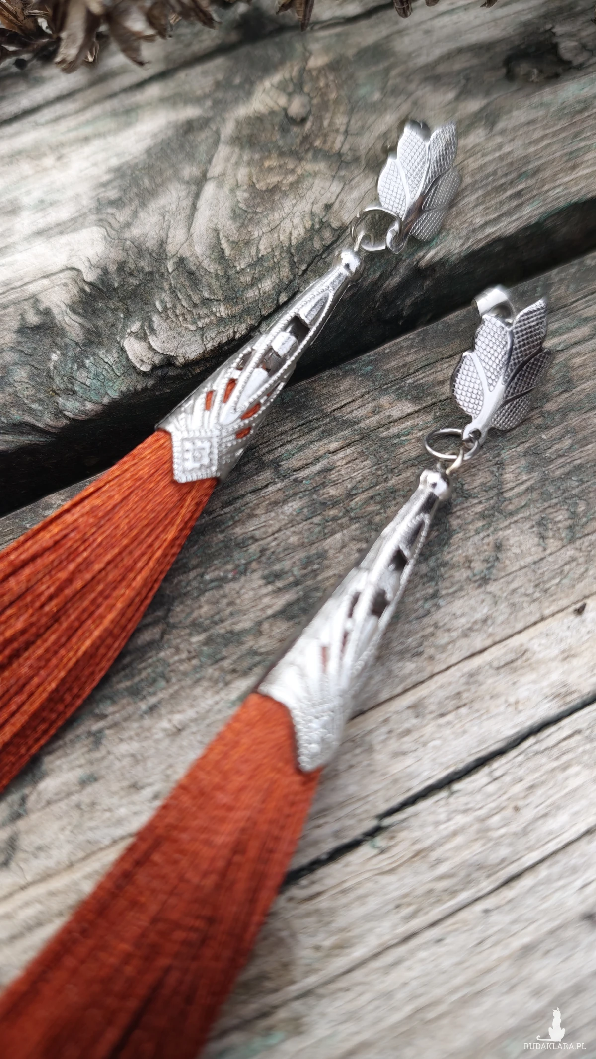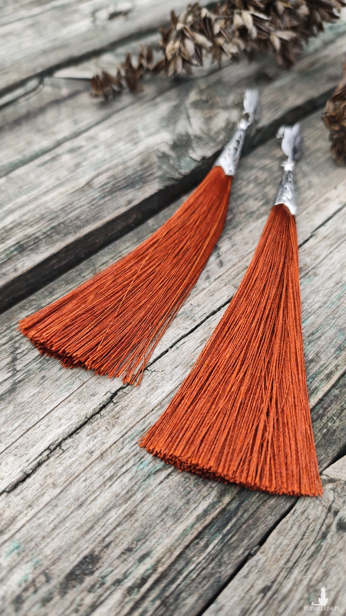 ,, brązowe,, to długie wiszące kolczyki wykonane z chwosta w kolorze brązowym i metalowych elementów w kolorze srebrnym. Kolczyki zawieszone są na ozdobnych biglach typu sztyft wykonanych ze stali szlachetnej.