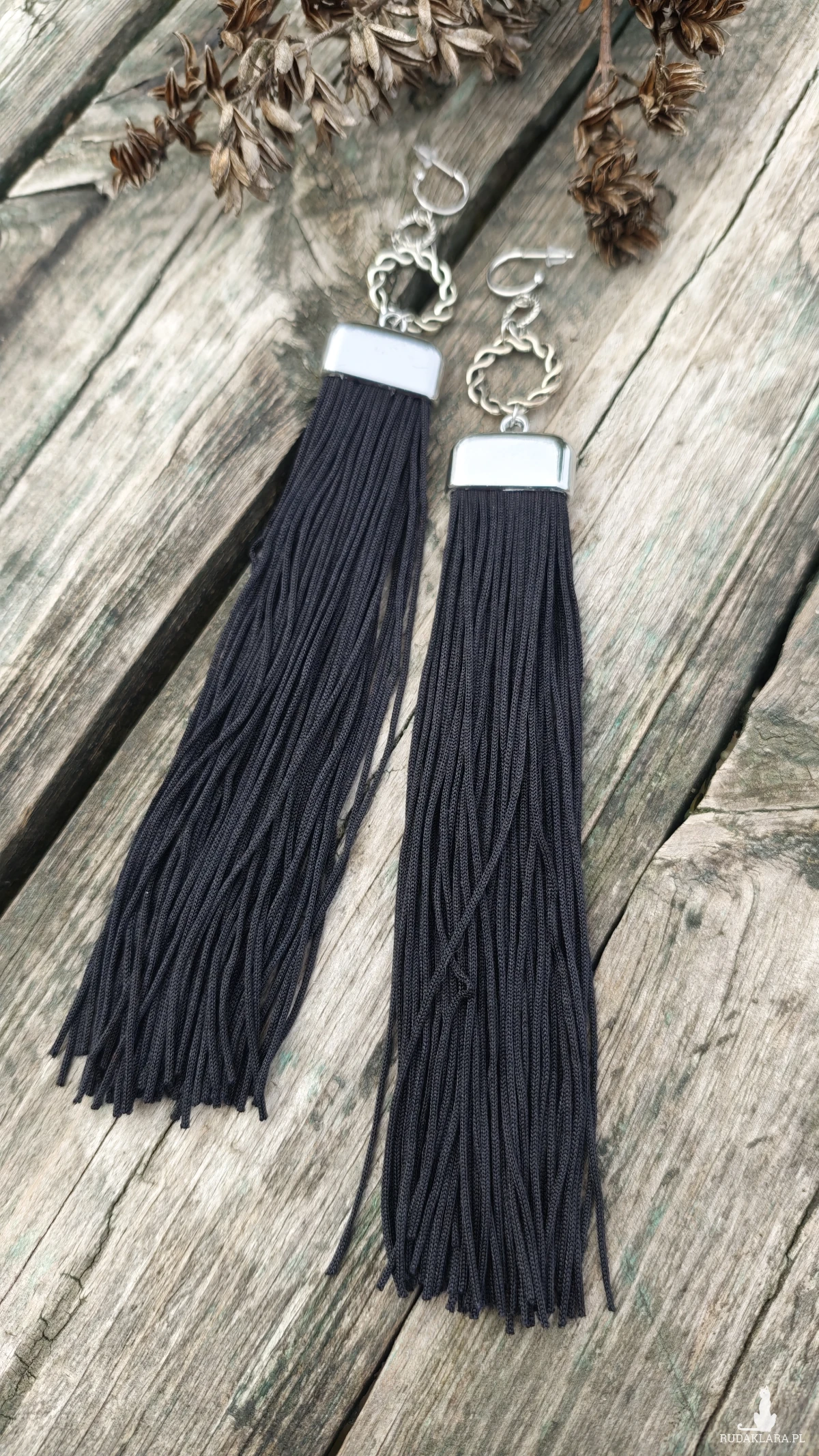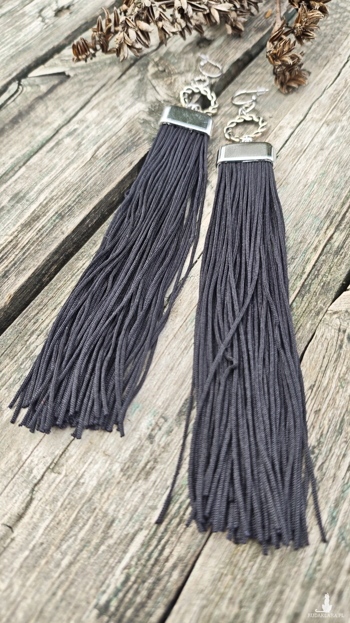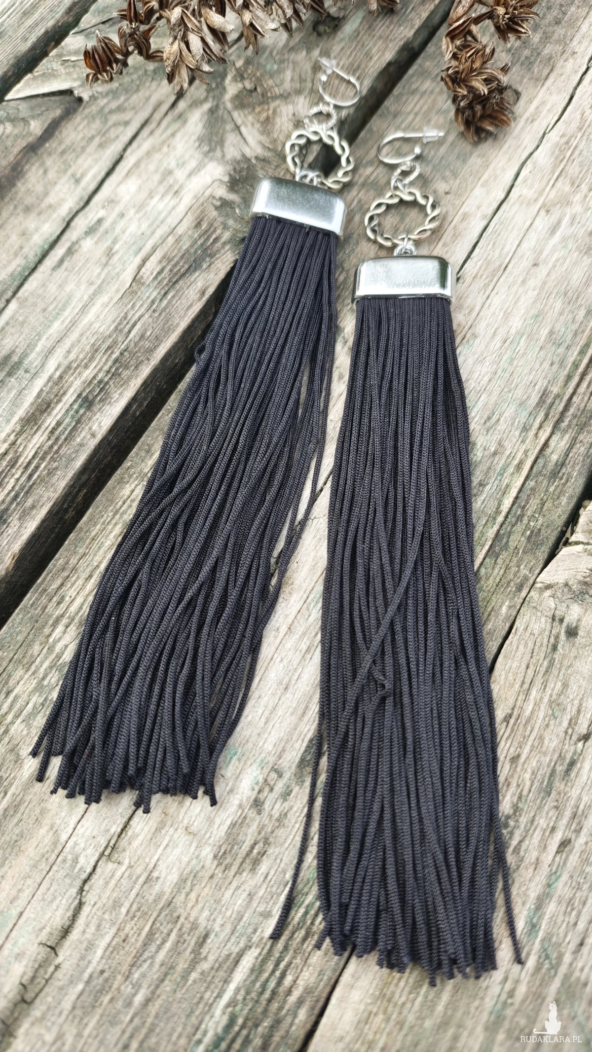 ,, czarne długie sznurki,, to długie i zwiewne kolczyki wykonane ze sznurkowych chwostów w kolorze czarnym i metalowych i akrylowych elementów w kolorze srebrnym. Kolczyki zawieszone są na ozdobnych biglach typu sztyft wykonanych ze stali szlachetnej.
