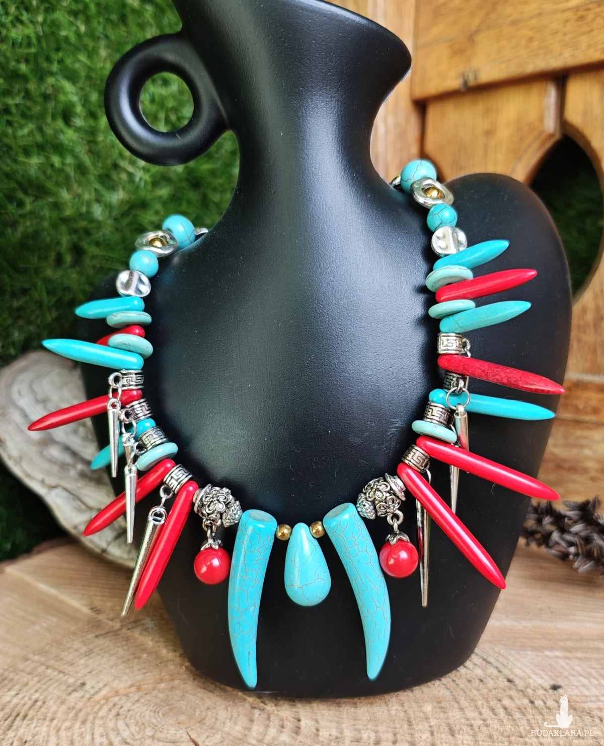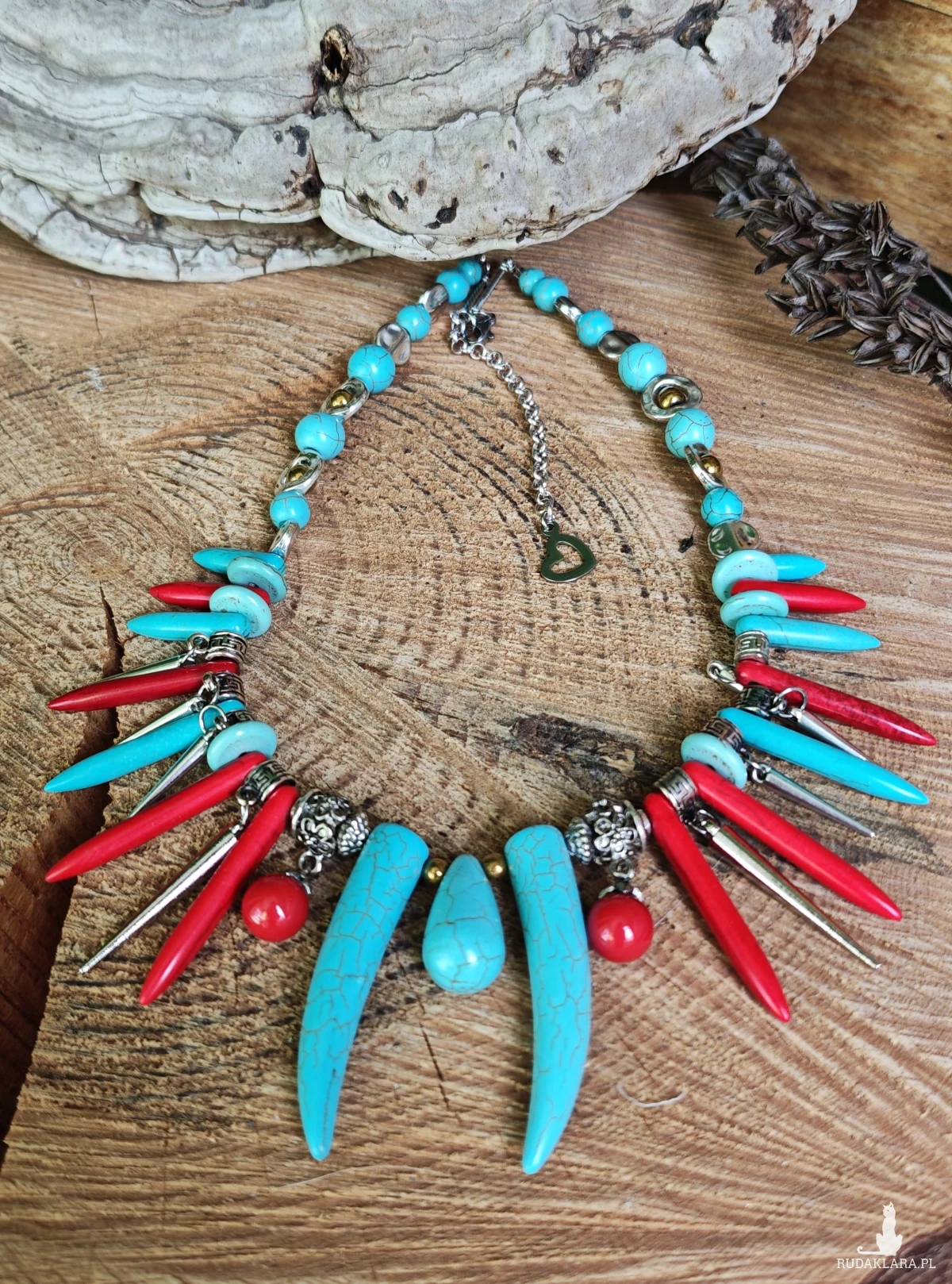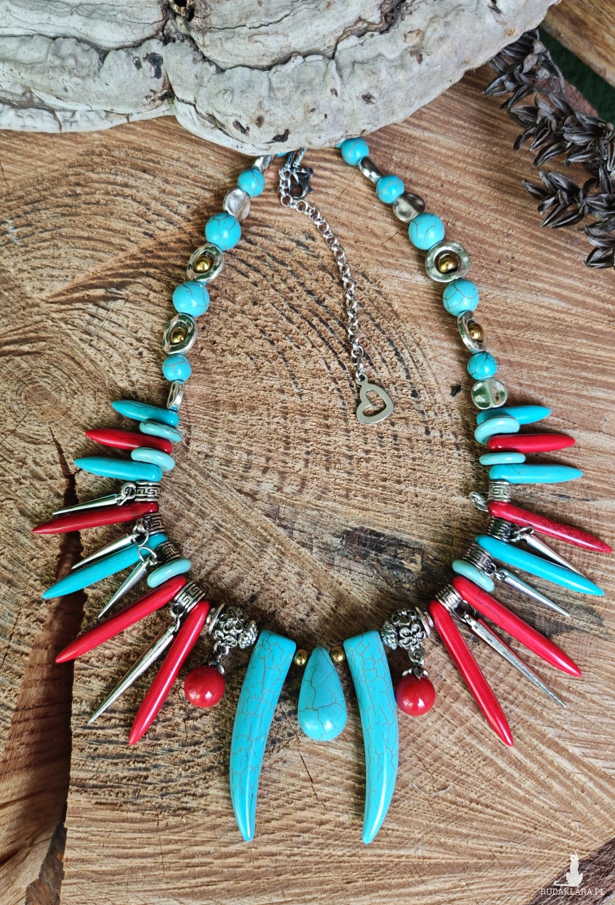 ,, kolorowe kolce,, to kolorowe korale utrzymane w kolorystyce błękitu, złota, srebra i czerwieni, wykonane z turkusu, howlitu, hematytu i metalowych elementów w kolorze srebrnym.
