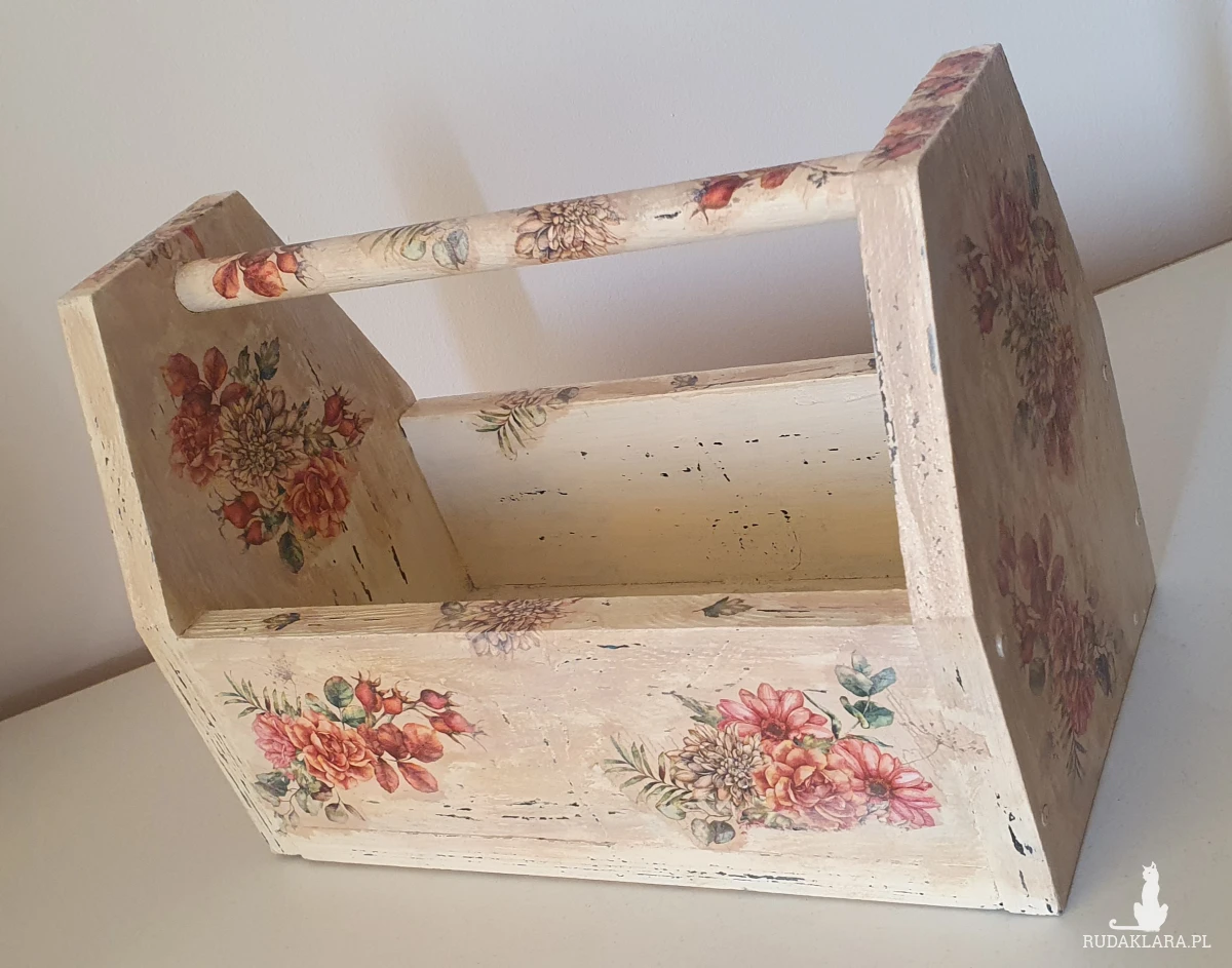 Wykonany metodą decoupage z wielką dbałością o szczegóły. Wygląda na stary, ale to sztuczka