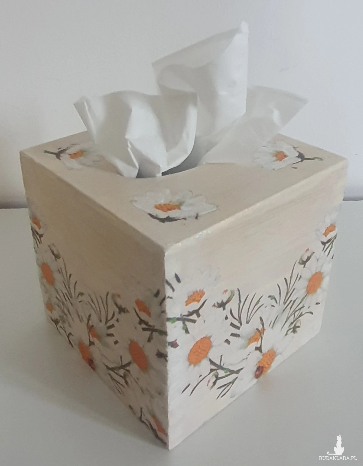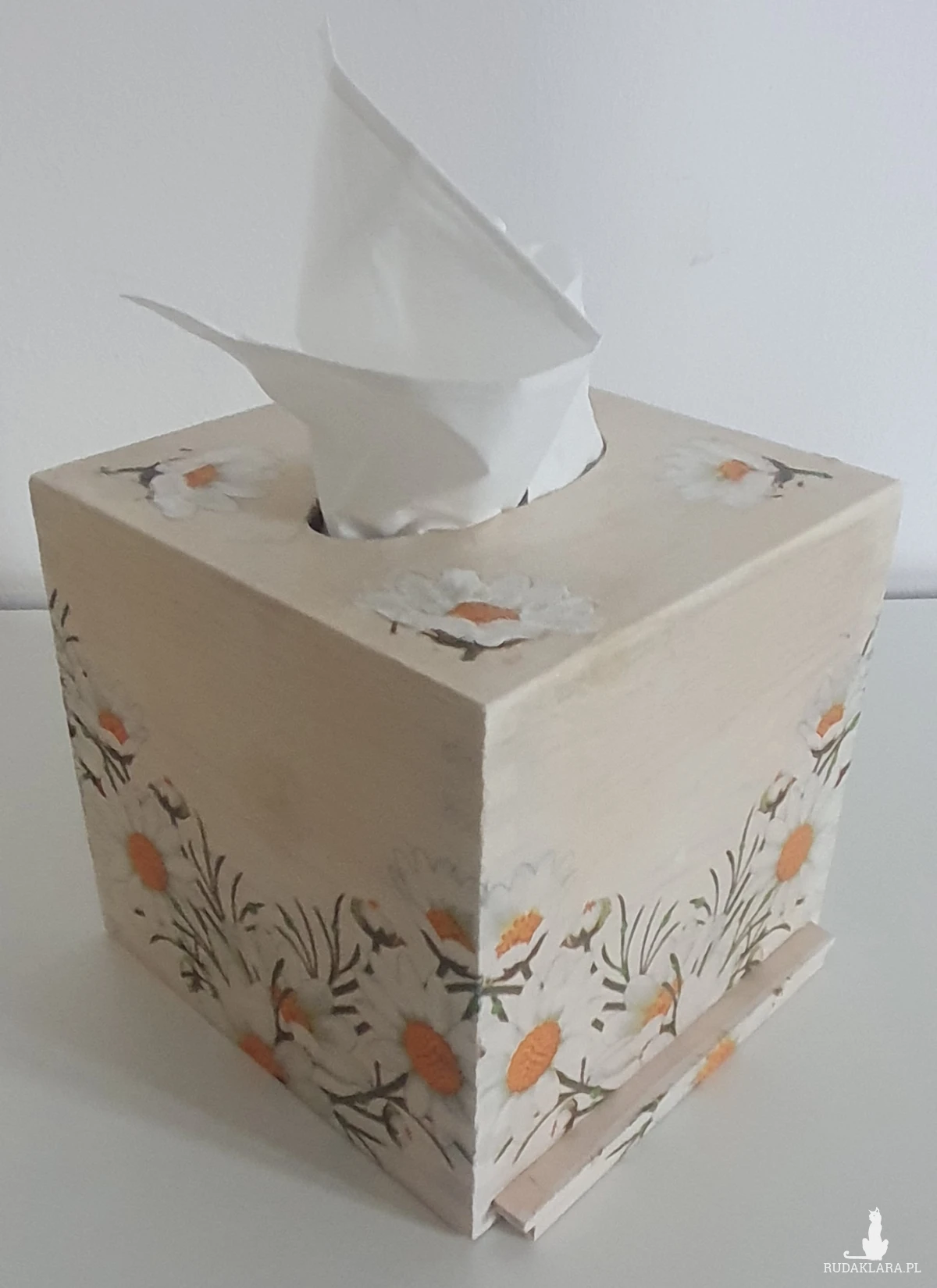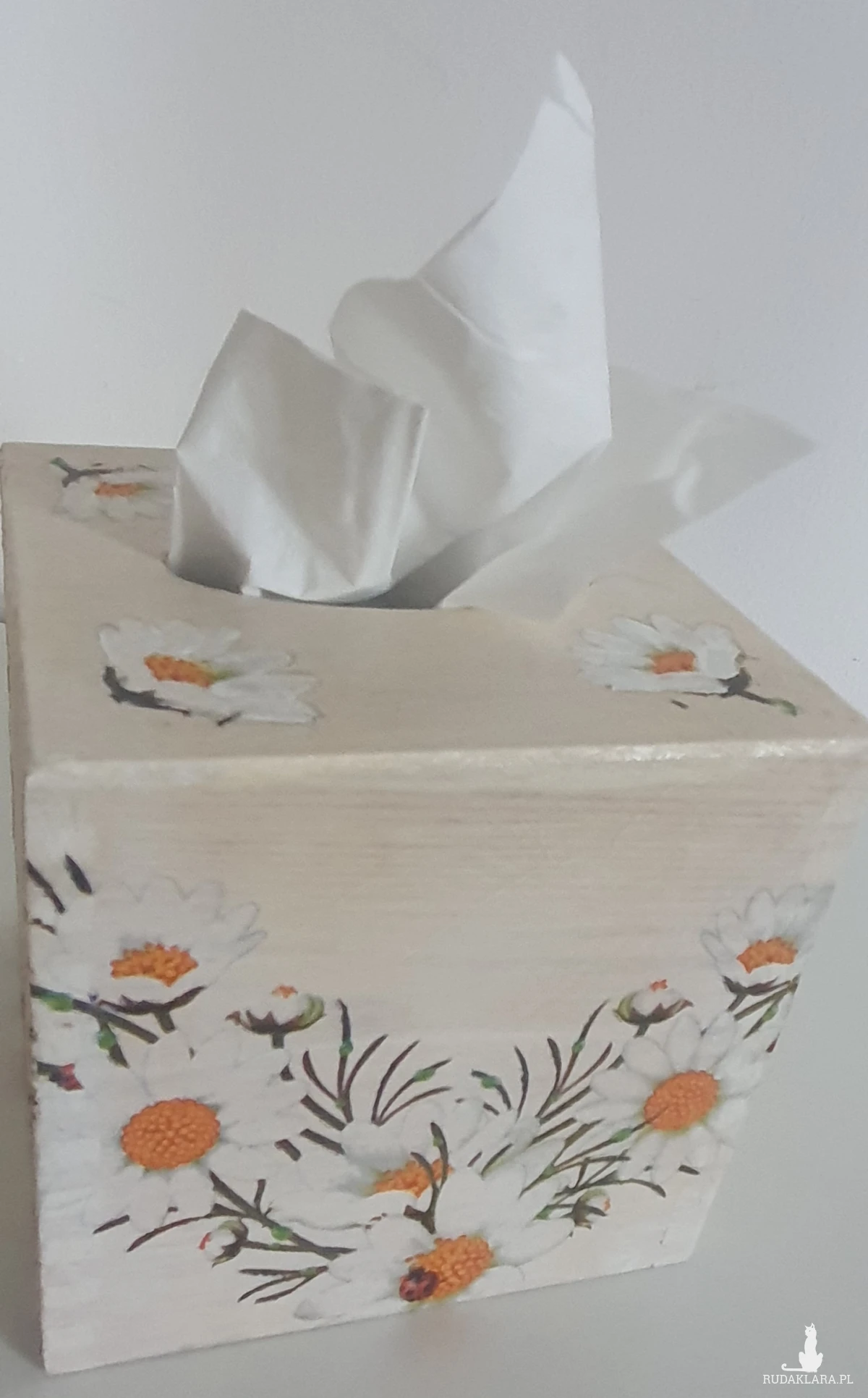 Sprzedam drewniany kwadratowy chustecznik ze stokrotkami
