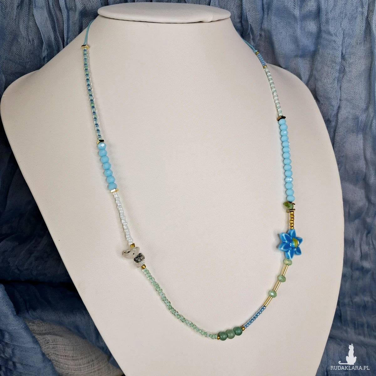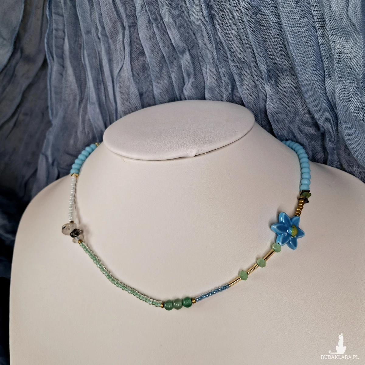 Naszyjnik do noszenia na 2 sposoby - jako choker i jako dłuższy naszyjnik. Wykonany jest ręcznie na sznurku, który można ściągać i rozluźniać. Użyte zostały szklane i akrylowe koraliki, kamień księżycowy, hematyt, prehnit, awenturyn, gliniany kwiatek. Minimalna długość 36 cm maksymalna 72 cm.