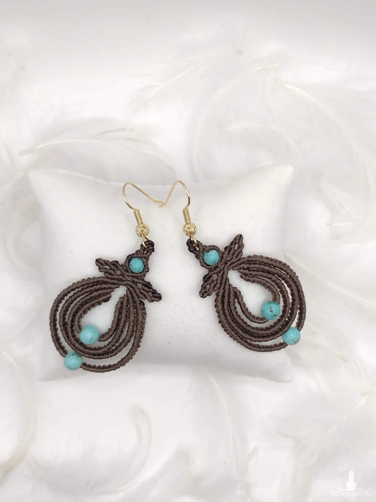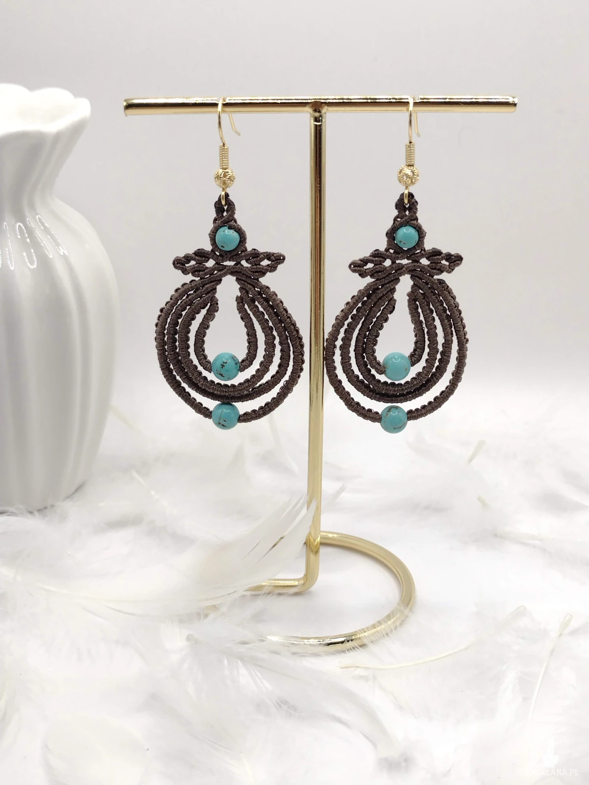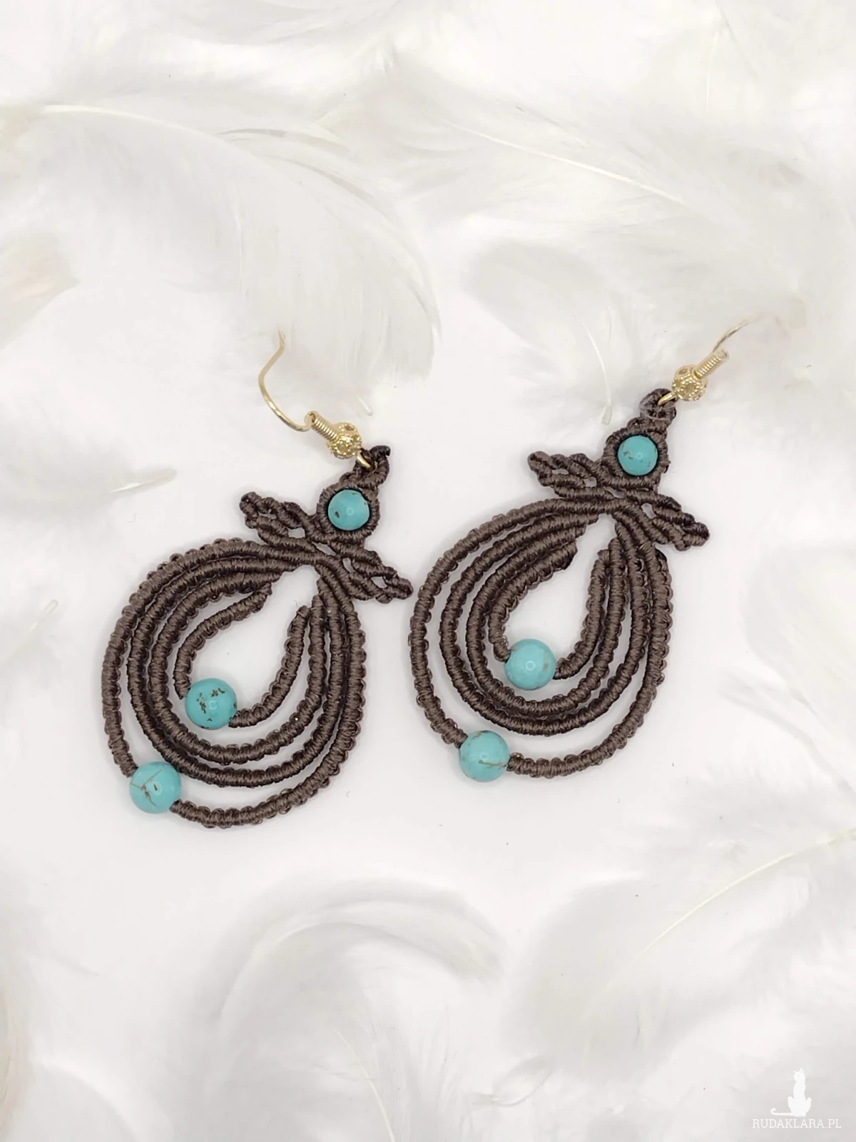 Wyjątkowe, ręcznie wykonane kolczyki w technice mikromakramy, wyróżniające się misternym, splotem i subtelną, organiczną formą. Ciepły odcień brązu pięknie współgra z turkusowymi kamieniami, tworząc harmonijną i przyciągającą uwagę kompozycję. Lekkie i wygodne, zawieszone na pozłacanych biglach, doskonale sprawdzą się zarówno na co dzień, jak i na wyjątkowe okazje.