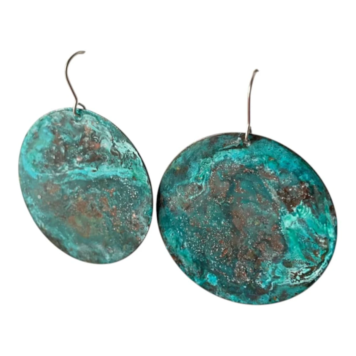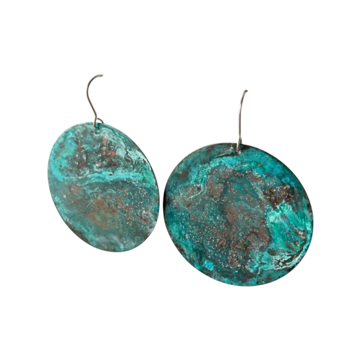 Kolczyki turkusowe z patynowanej miedzi to unikatowa biżuteria handmade inspirowana naturą i Ziemią widzianą z kosmosu. Okrągłe kolczyki z miedzi wyróżniają się niepowtarzalną kolorystyką w odcieniach turkusu, zieleni i brązu. Każda para powstaje ręcznie i ma unikalny wzór powierzchni. To oryginalna biżuteria artystyczna dla osób, które cenią rękodzieło i wyjątkowe dodatki.